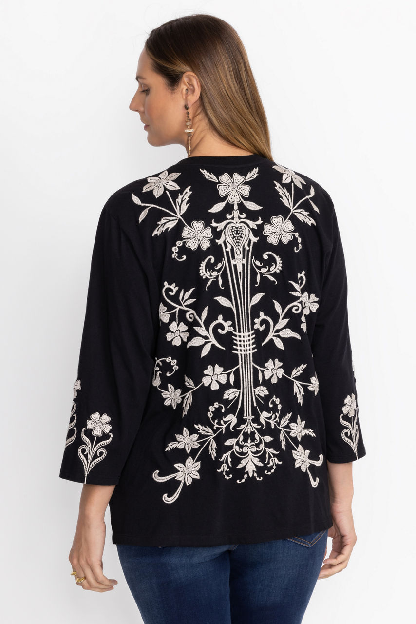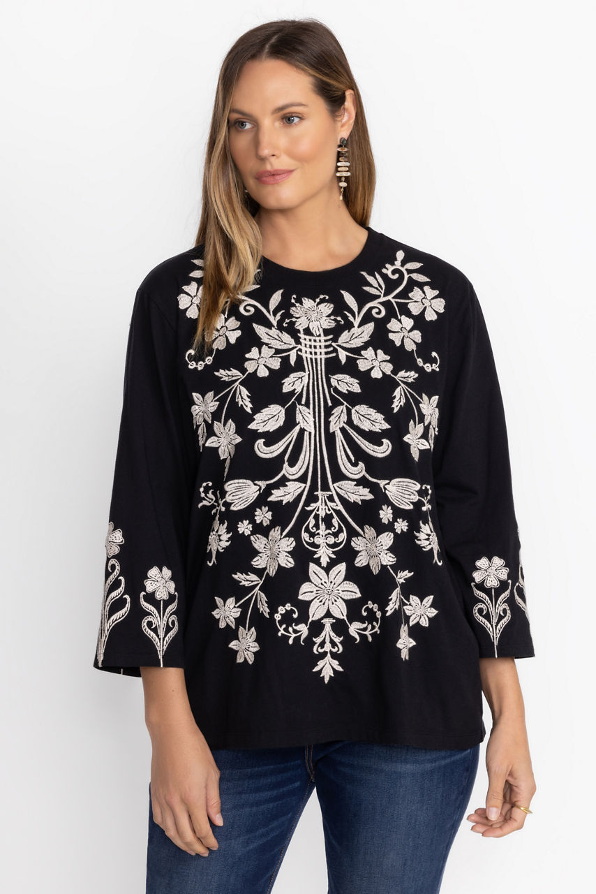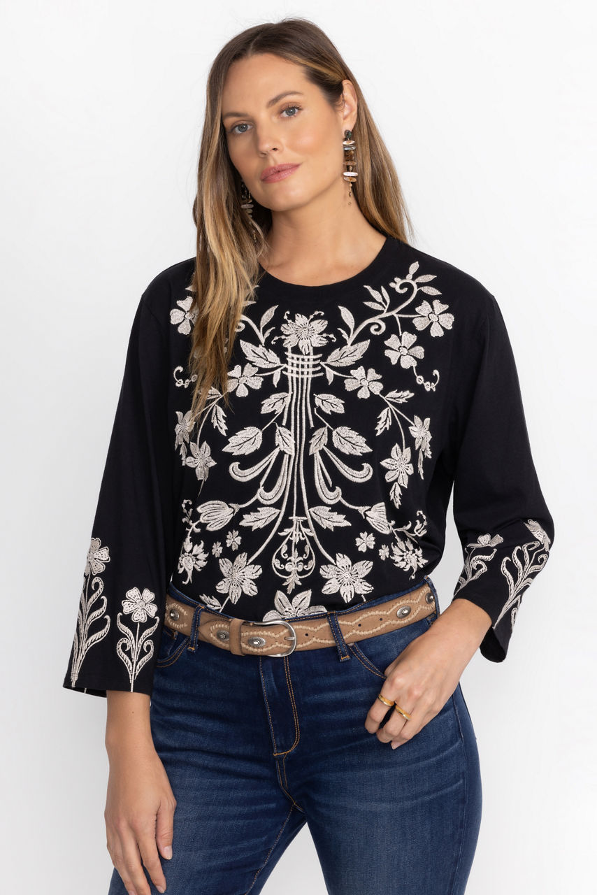 Crafted from 100% breathable cotton, the Talithia 3/4 Sleeve Crew Neck tee is the perfect combination of comfort and elevated style. Featuring a classic crew neckline and flowing 3/4 sleeves, this unique tee is finished with intricate placement embroidery adding dimensional texture. Pair with classic trousers and leather flats for a casual workday look.