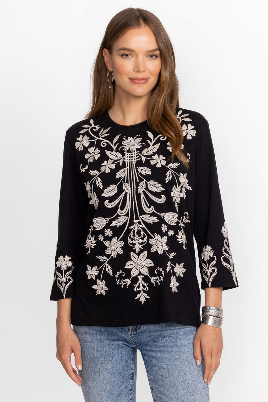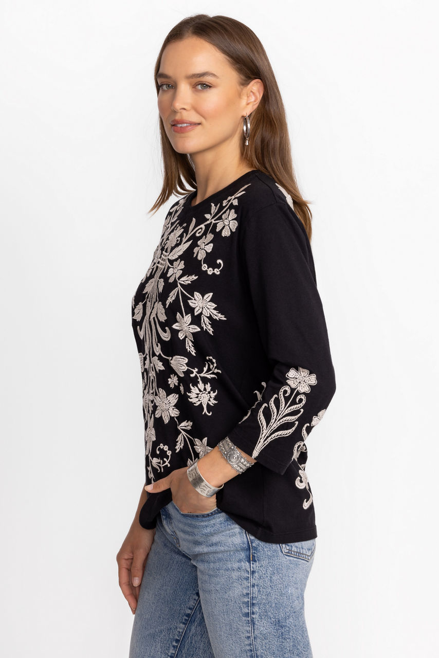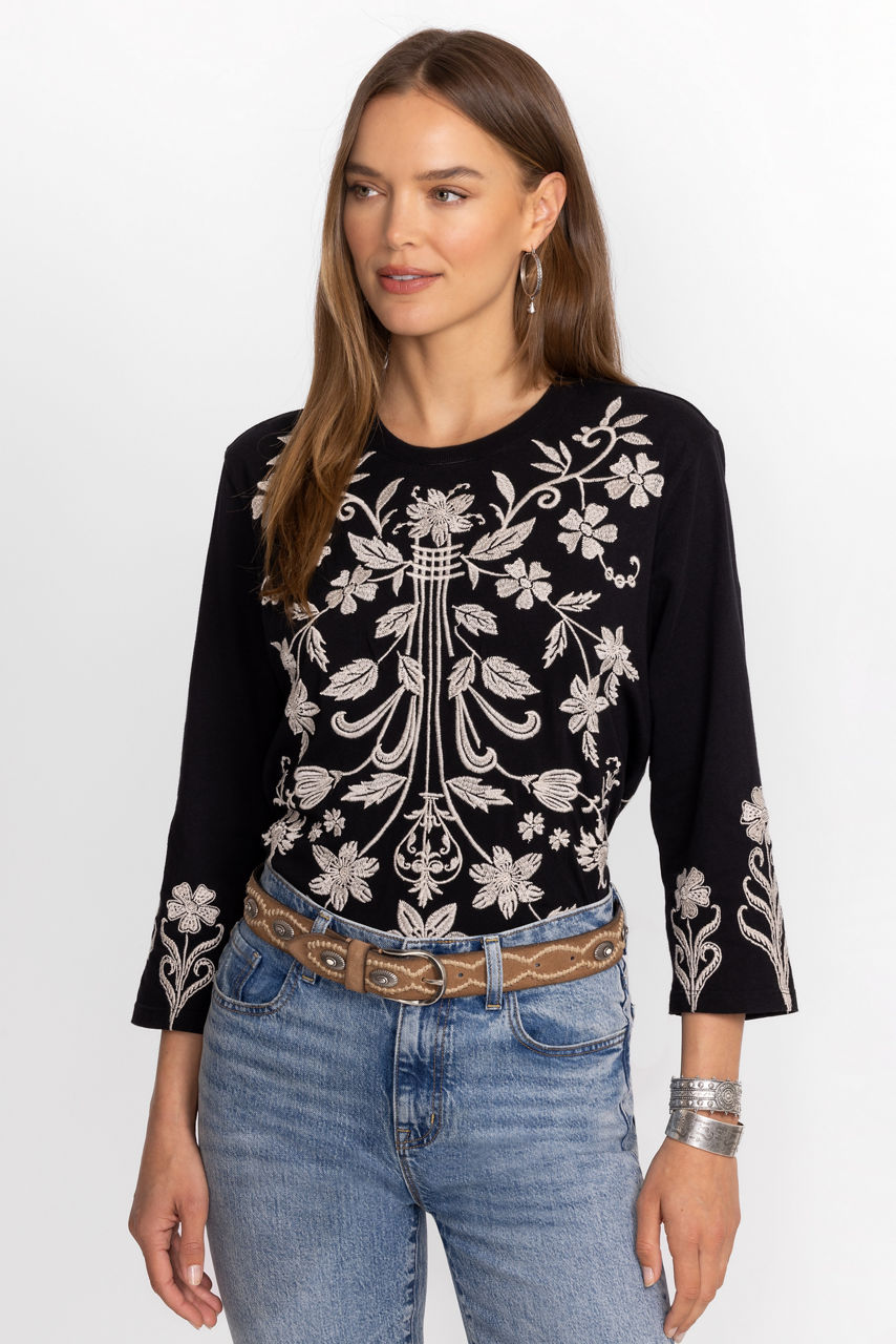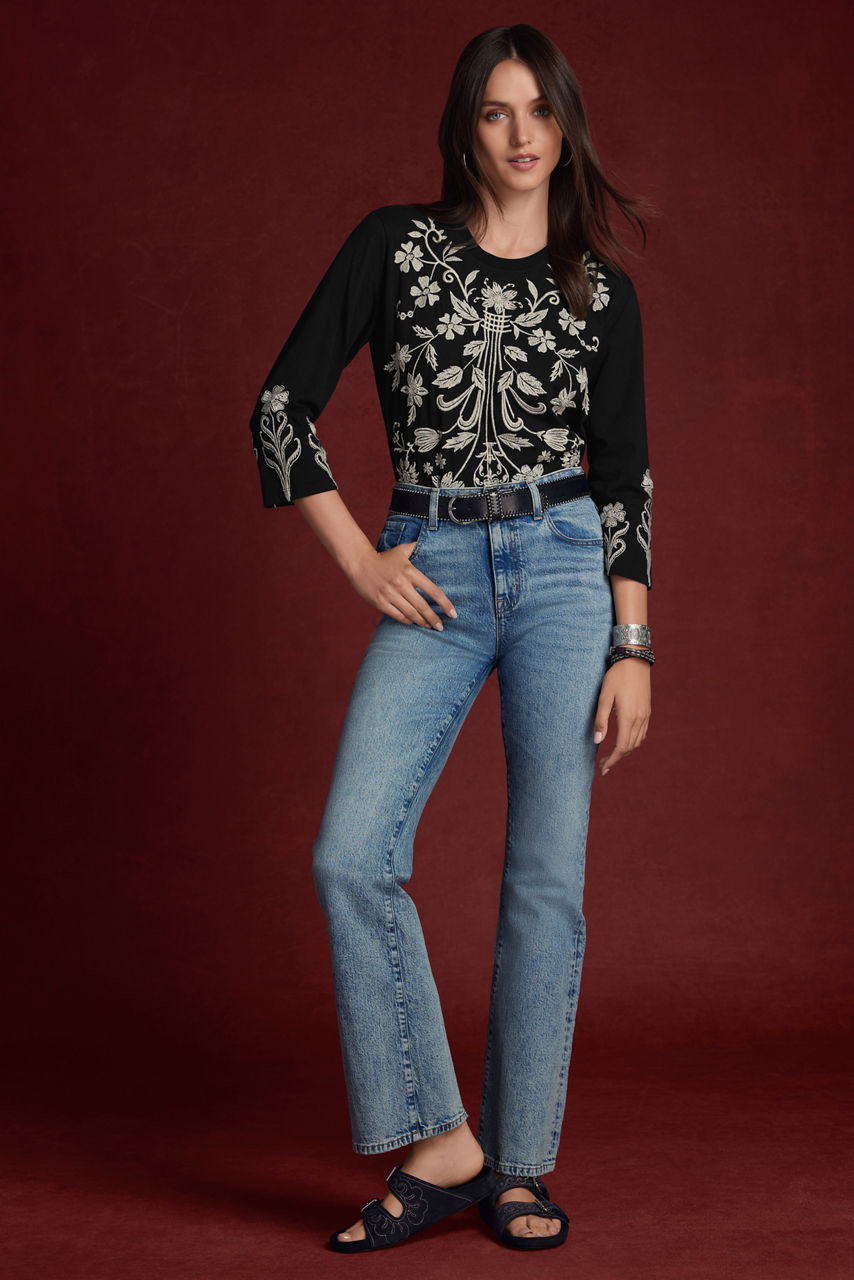 Crafted from 100% breathable cotton, the Talithia 3/4 Sleeve Crew Neck tee is the perfect combination of comfort and elevated style. Featuring a classic crew neckline and flowing 3/4 sleeves, this unique tee is finished with intricate placement embroidery adding dimensional texture. Pair with classic trousers and leather flats for a casual workday look.