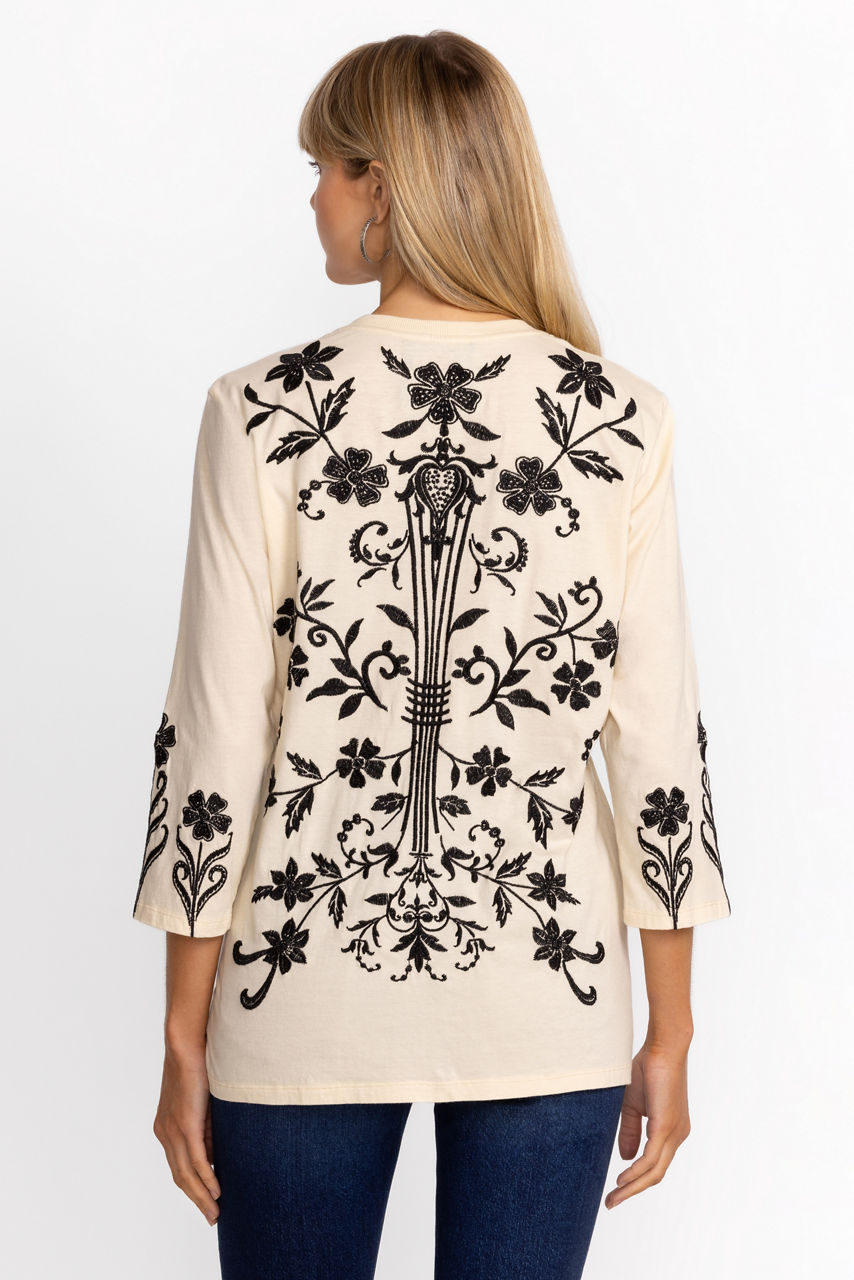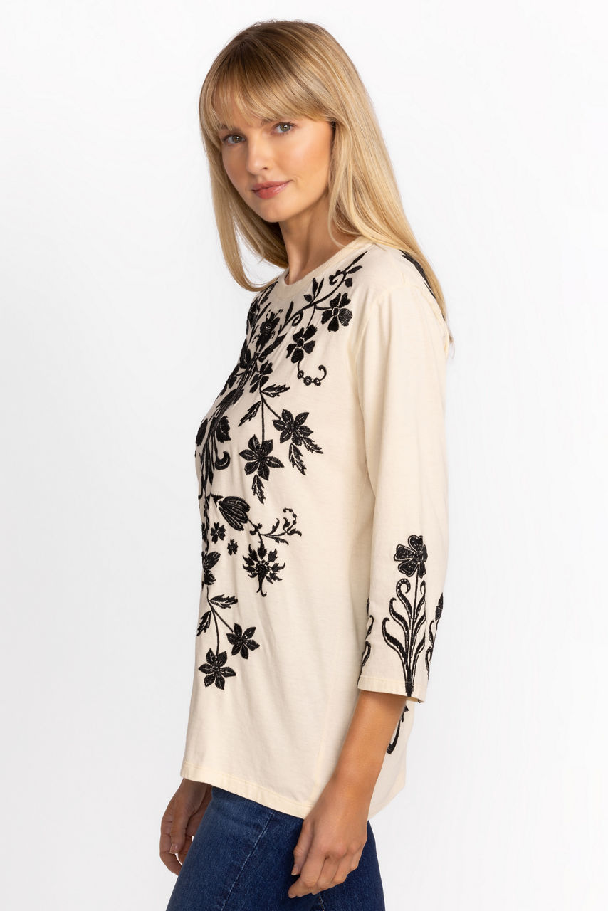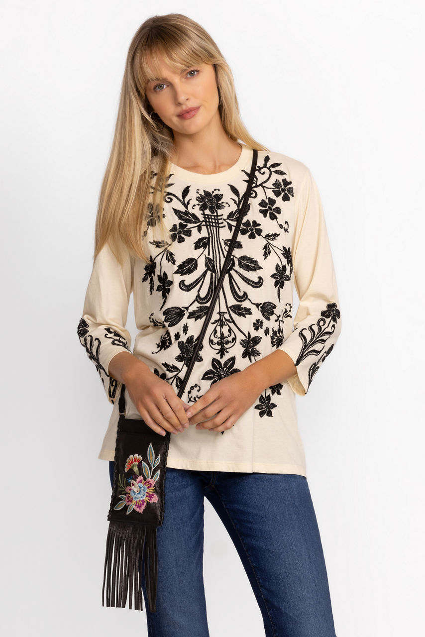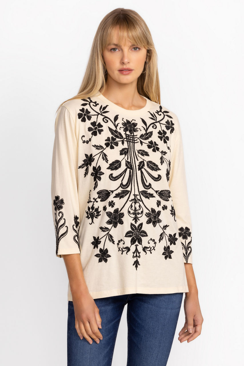 Crafted from 100% breathable cotton, the Talithia 3/4 Sleeve Crew Neck tee is the perfect combination of comfort and elevated style. Featuring a classic crew neckline and flowing 3/4 sleeves, this unique tee is finished with intricate placement embroidery adding dimensional texture. Pair with classic trousers and leather flats for a casual workday look.