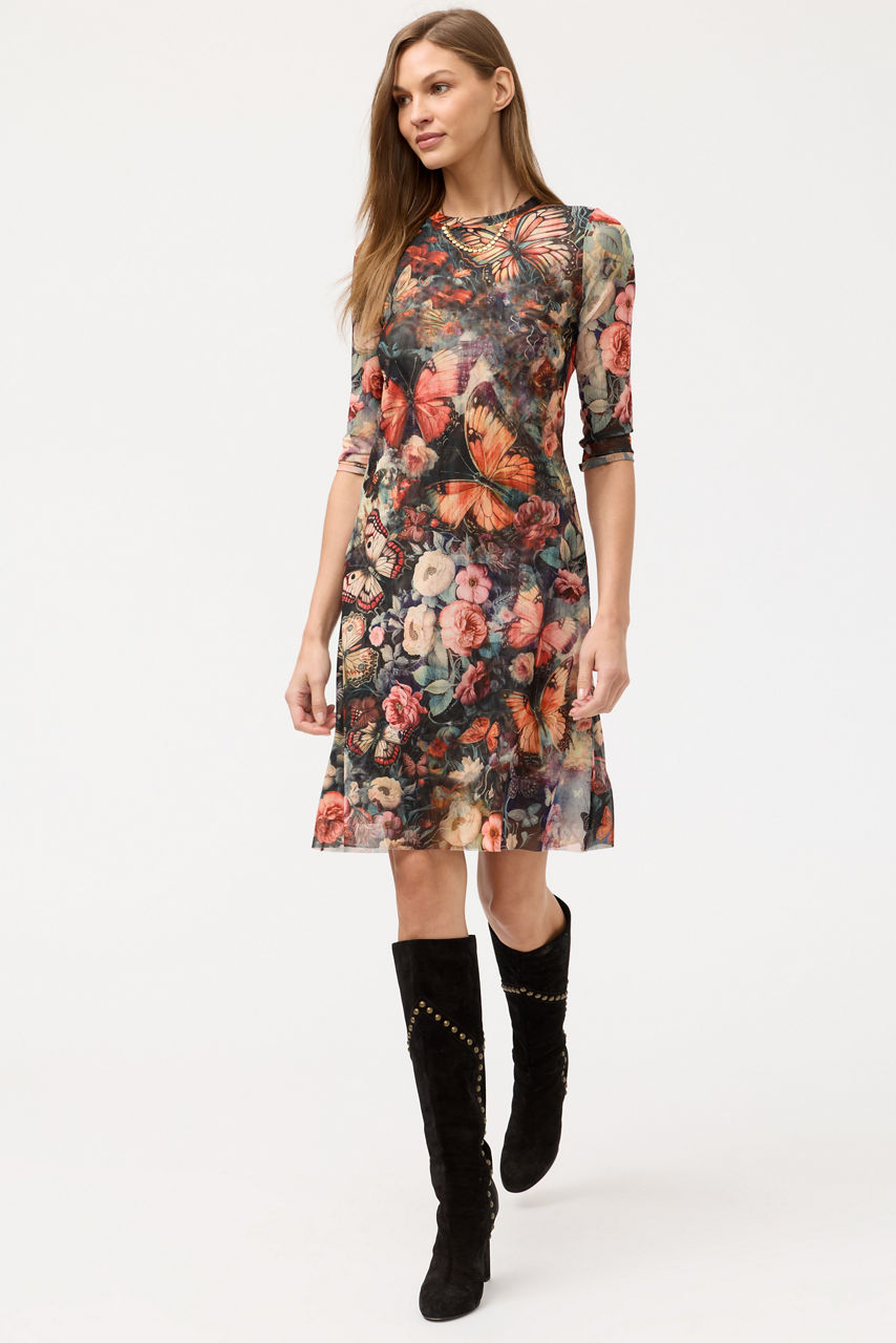 Adorned with a rich floral pattern, the 3/4 Sleeve Mesh Midi Dress is washed in vintage inspired color. Featuring a crew-neckline and 3/4 sleeves, this bold slip lined dress is finished with a midi length skirt. Pair with classic pumps and pair with a coordinating clutch for an unforgettable evening look.