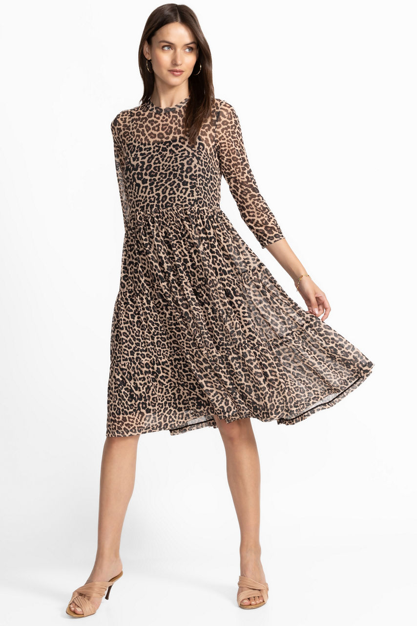 Beautifully embellished with a bold leopard print, the 3/4 Sleeve Mesh Tiered Dress offers a fresh take on a classic silhouette. Crafted from a lightweight breathable mesh, this slip-lined dress features a rounded neckline and empire waist and is finished with a tiered ruffle skirt. Pair with sandals and sparkling jewelry for a fun night out look.