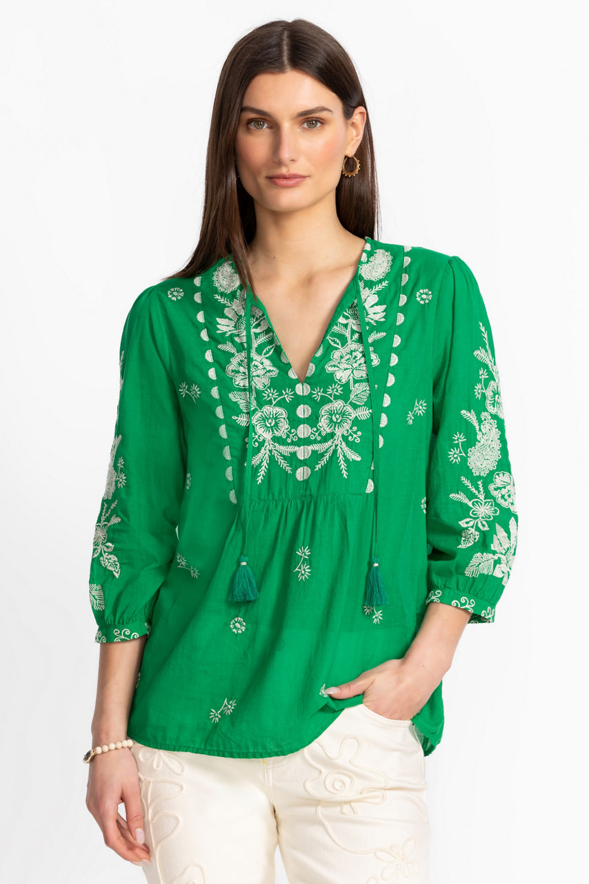Crafted from breathable 100% cotton, the 3/4 Sleeve Prairie Blouse is light and airy, perfect for the warmest days. Designed with a split V-neckline and Bishop sleeves, this vibrant blouse features a gathered yoke at the front and back and is finished with intricate embroidery. Pair with dark wash denim and casual sandals for a perfect weekend look.