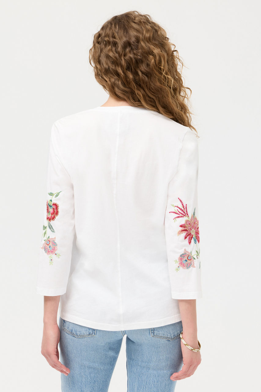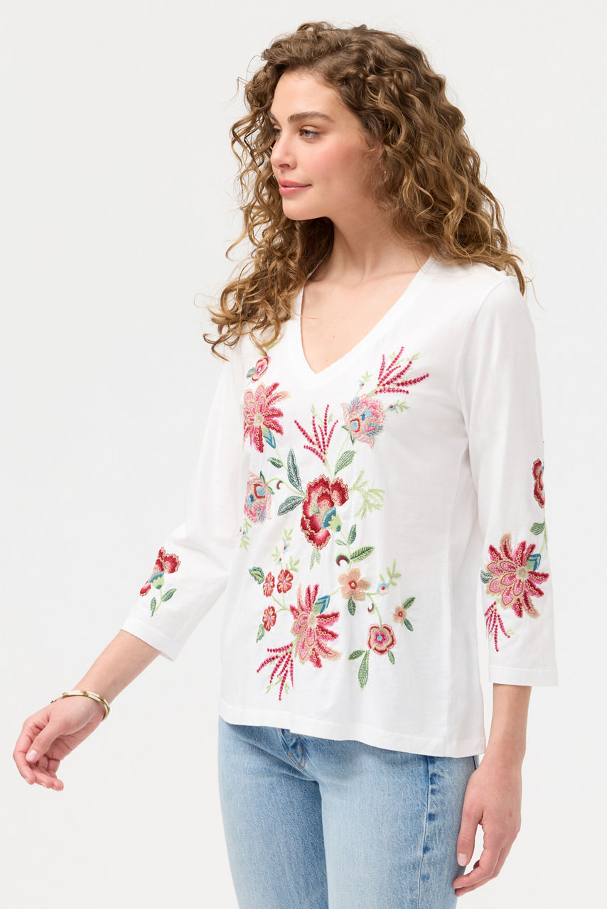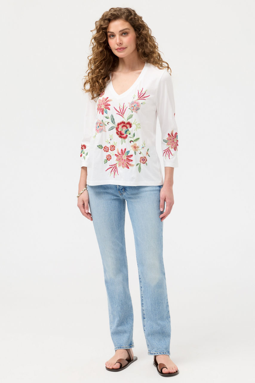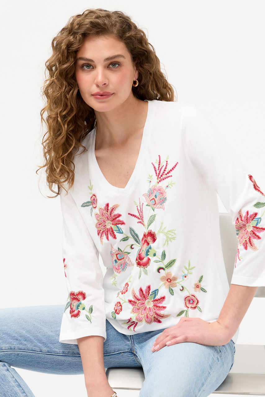 Crafted from 100% cotton, the 3/4 Sleeve Trapunto V-Neck Tee is embellished with vibrant color and intricate floral blooms. Featuring a V-neckline and relaxed bodice, this elevated 3/4 sleeve tee is finished with intricate embroidered detailing. Pair with colored denim and easy flats for a timeless casual ensemble.
