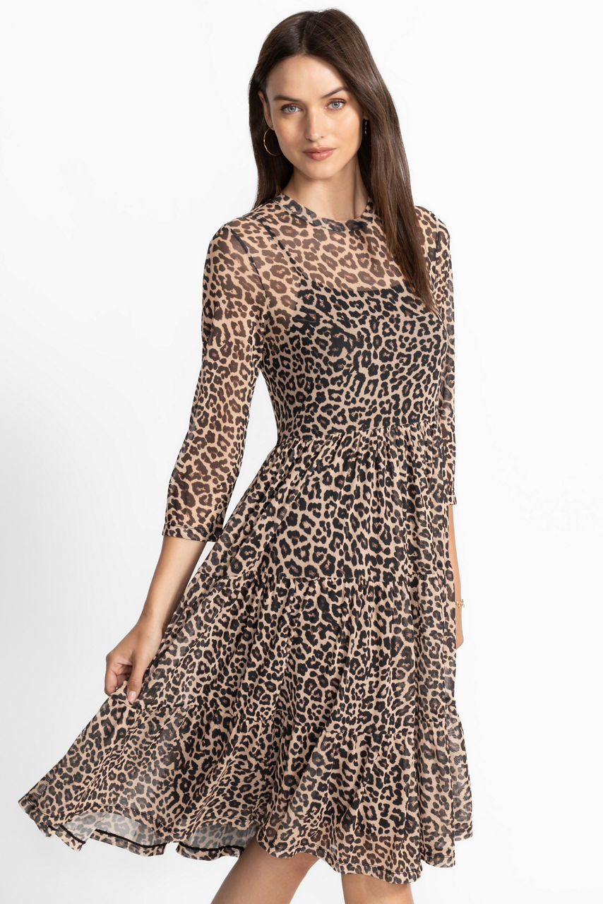 Beautifully embellished with a bold leopard print, the 3/4 Sleeve Mesh Tiered Dress offers a fresh take on a classic silhouette. Crafted from a lightweight breathable mesh, this slip-lined dress features a rounded neckline and empire waist and is finished with a tiered ruffle skirt. Pair with sandals and sparkling jewelry for a fun night out look.