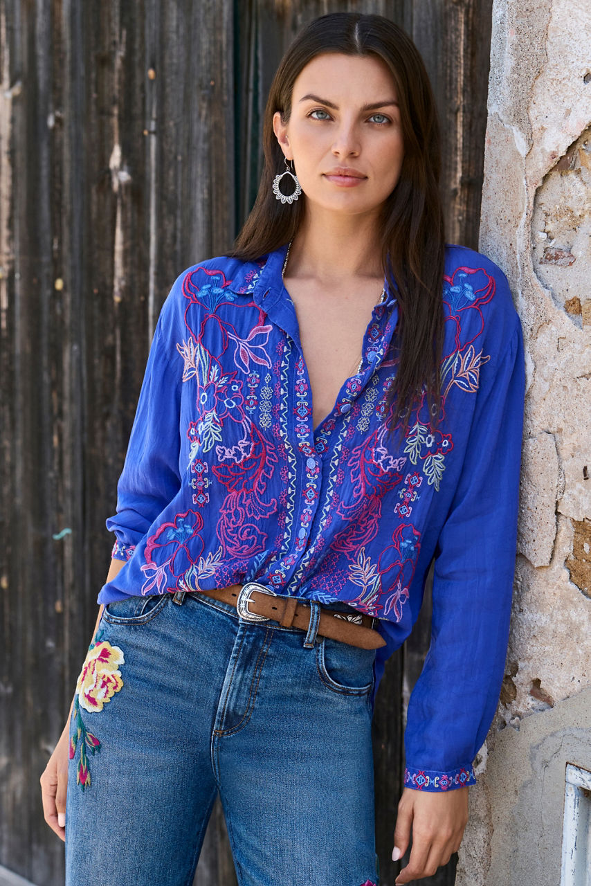 A salt-washed tunic threaded with tones drawn from water, mineral, and sky. Soft embroidery gives the piece a weathered, natural ease.