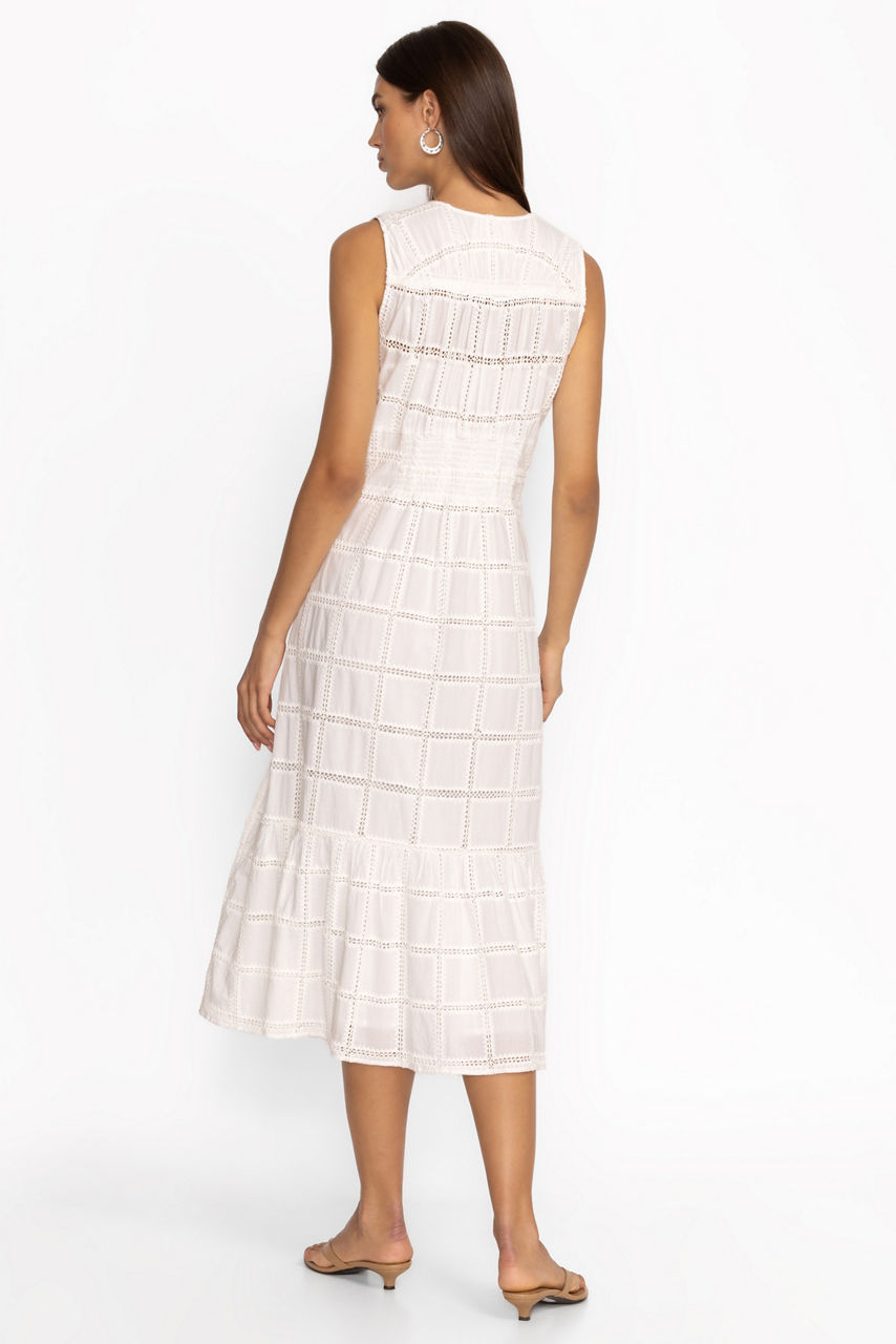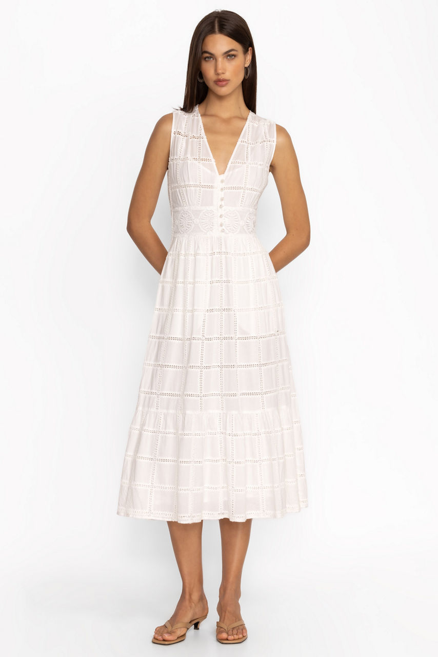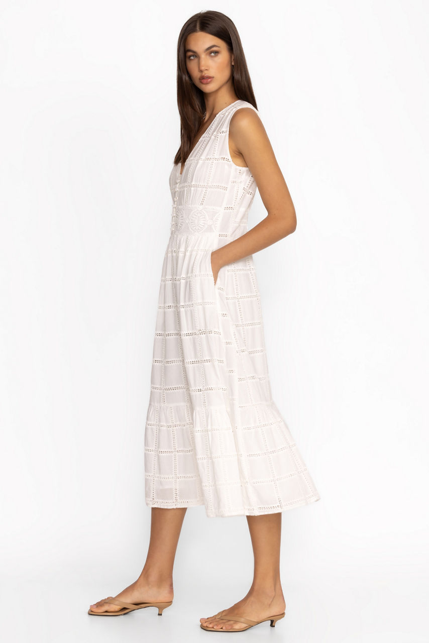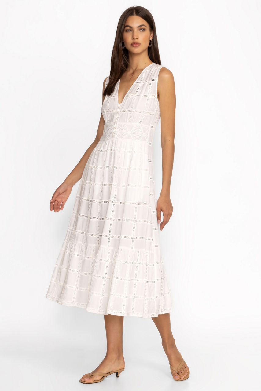 Crafted from 100% breathable cotton the Aaliyah Midi Dress is offered in light and airy white fabric. Featuring a V-neckline and contrasting fabric empire waist, this A-line dress is finished with a slip-lined ruffle-tiered skirt. Pair with wedge heels and a raffia handbag for a vacation-ready look.