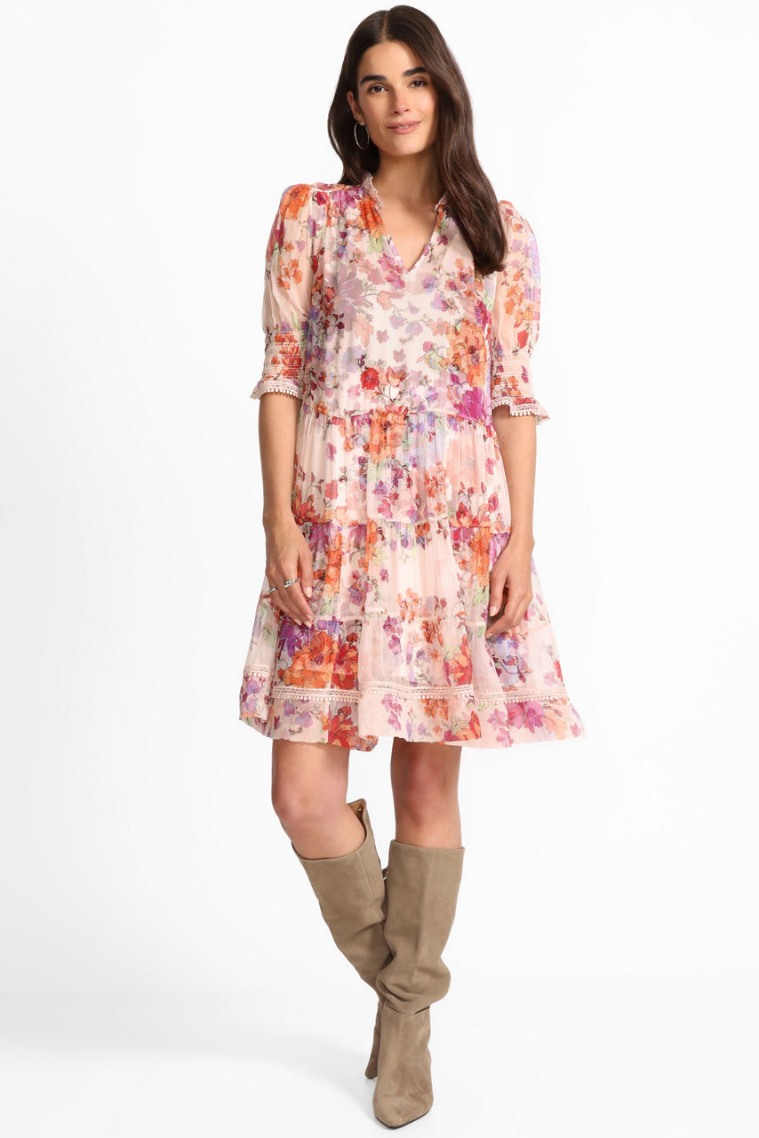 Crafted from 100% silk, the Abbey Tiered Mini Dress is embellished with a brilliant floral pattern. Featuring a split V-neckline and gently puffed sleeves, this dress is finished with an intricate ladder trim detail and a tiered skirt. Pair with espadrille heels and a coordinating clutch for a daytime event.