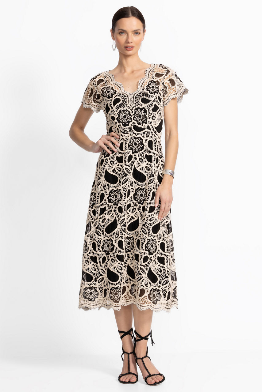 Beautifully crafted with intricate lace detailing, the Adaline Scalloped Dress makes a stunning visual statement. Designed with a floral lace shell and finished with a black backdrop, this delicate dress features an illusion neckline with a back zipper closure and is embellished with scalloped edges for a softer look. Pair with black espadrille sandals and a raffia bag for a fresh resort-inspired look.