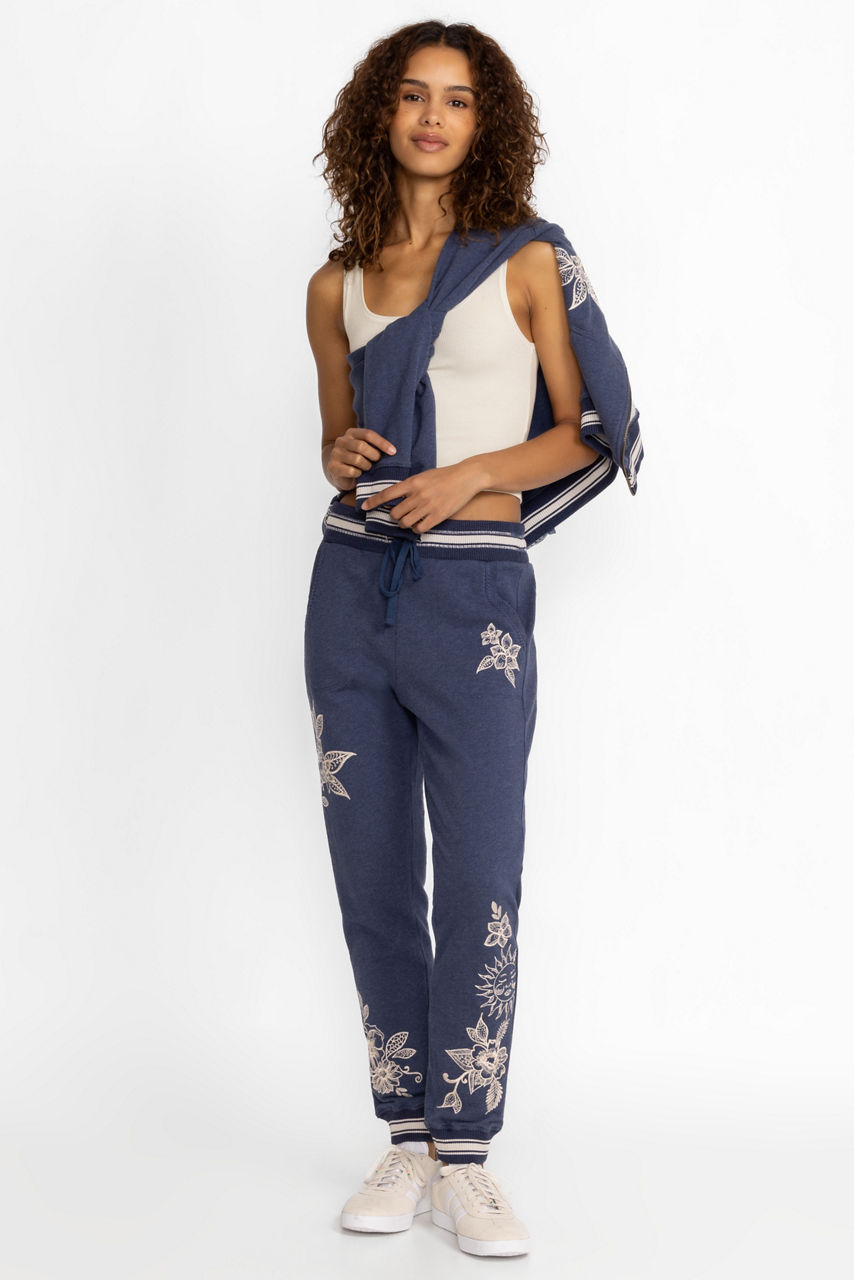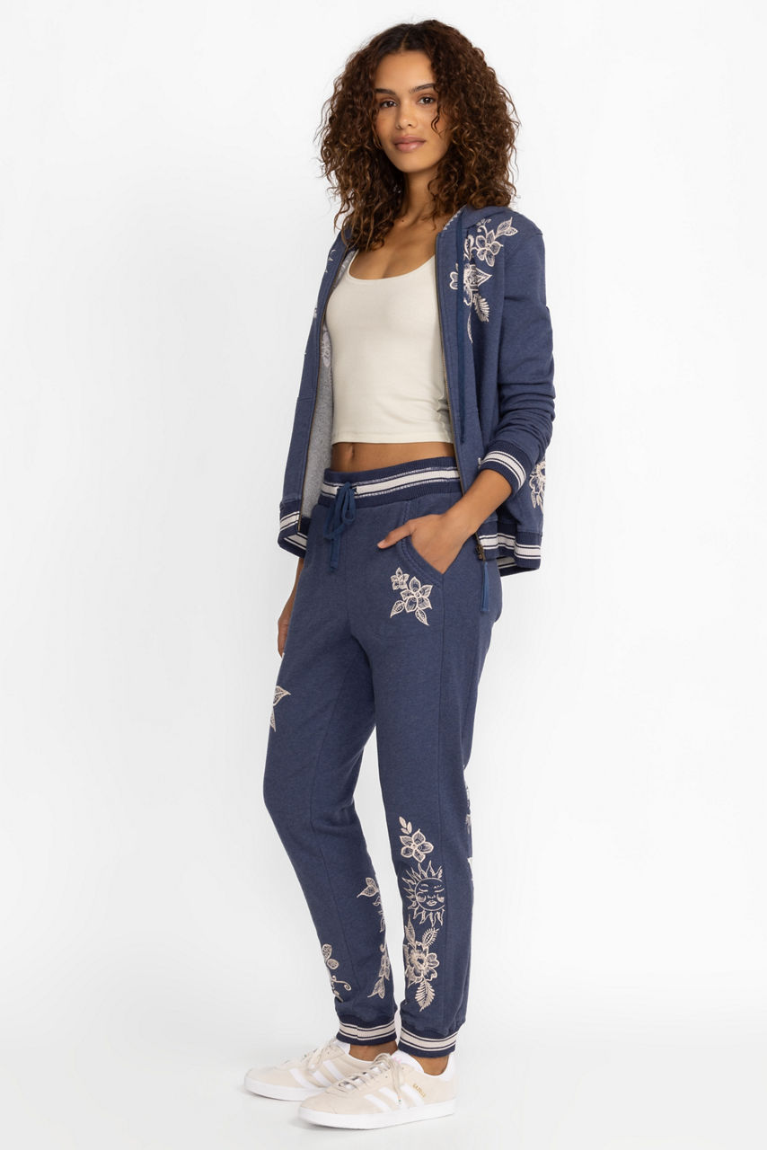 Taking the track suit to the next level, the Addison Rib Detail Jogger adds a touch of femininity to traditional athletic apparel. Crafted from 100% cotton and embellished with placement embroidery, these pants offer a comfortable elastic waist with a drawstring for a customizable fit. Pair with a classic white tee and the Addison Rib Detail Zip Up for a posh casual look.