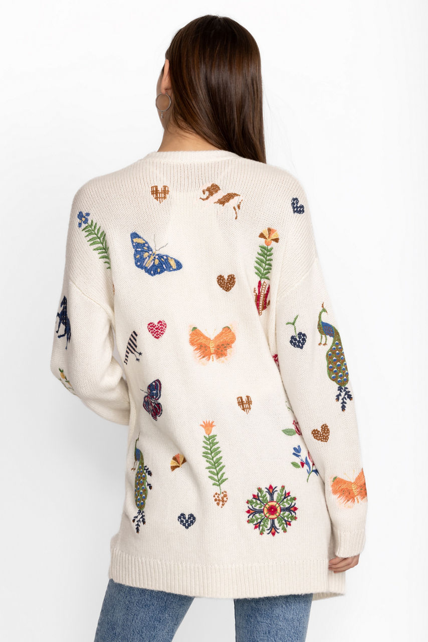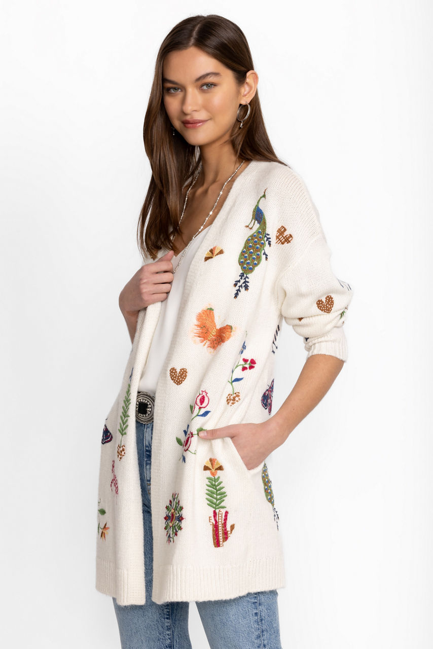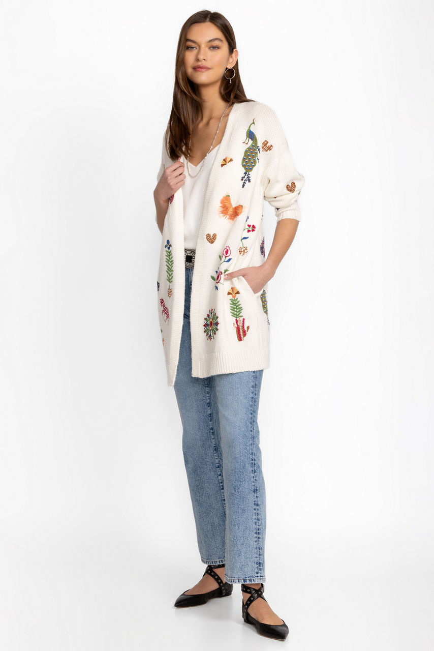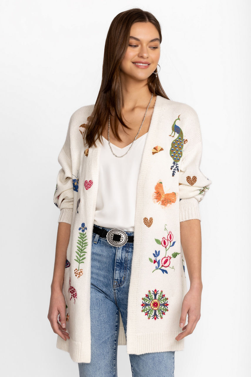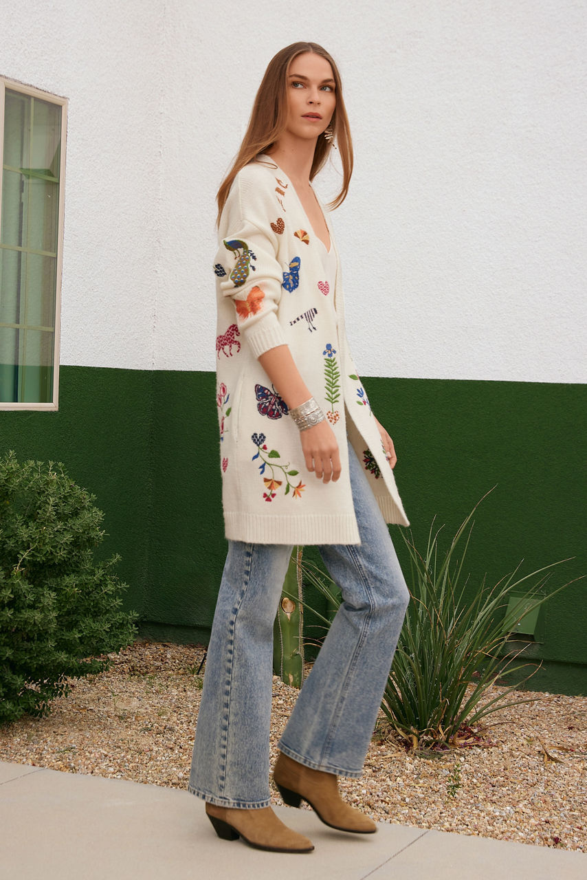 Adding a touch of whimsy to a classic wardrobe piece, the Adlea Long Cardigan is adorned with colorful flora and fauna. Crafted from a cozy cotton blend, this longline cardigan features an open front and vibrant embroidery. Layer over a bright tee and relaxed fit jeans for an elevated casual ensemble.