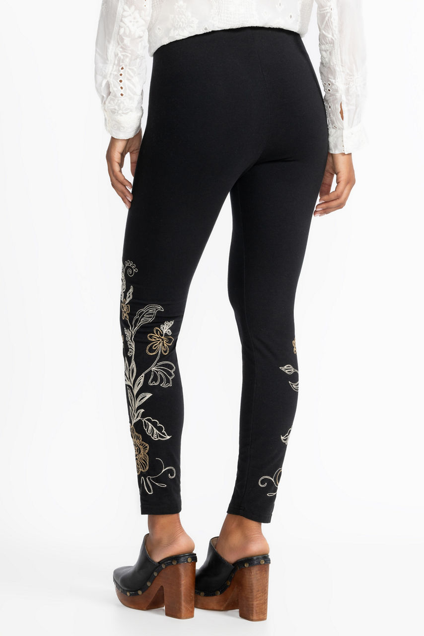 Offering a fresh take on classic black leggings, the Adelaide Leggings are adorned with intricate floral designs along the leg line. Crafted from a cotton blend with a hint of stretch, these ornate leggings are equal parts stylish and comfortable. Pair with a coordinating tunic top and classic flats for a polished weekend look.