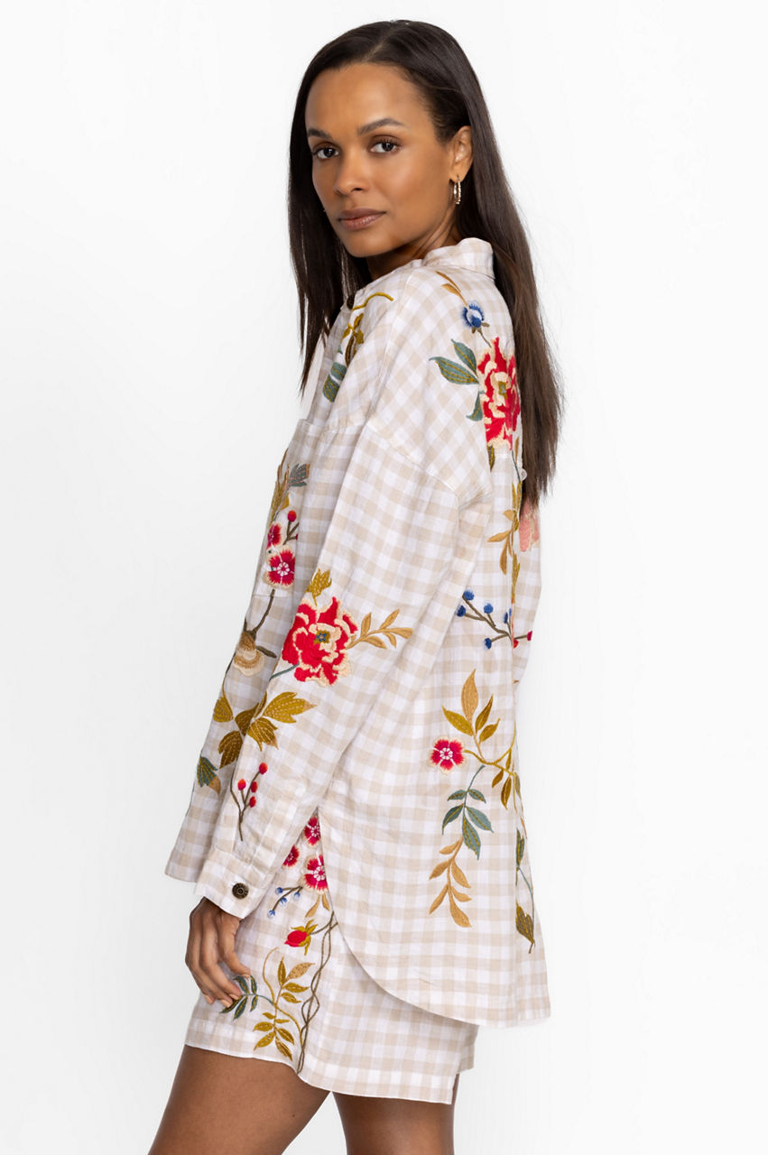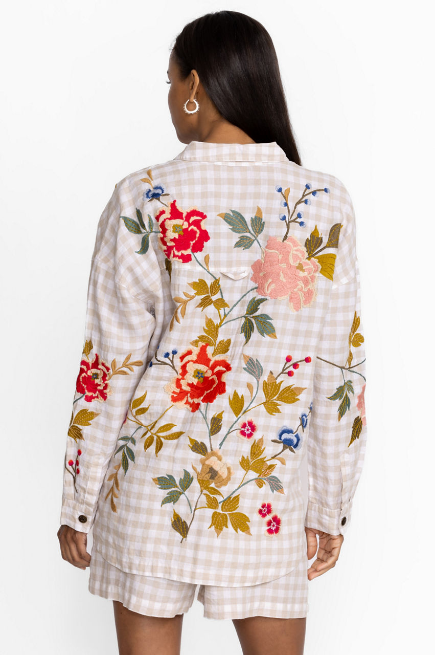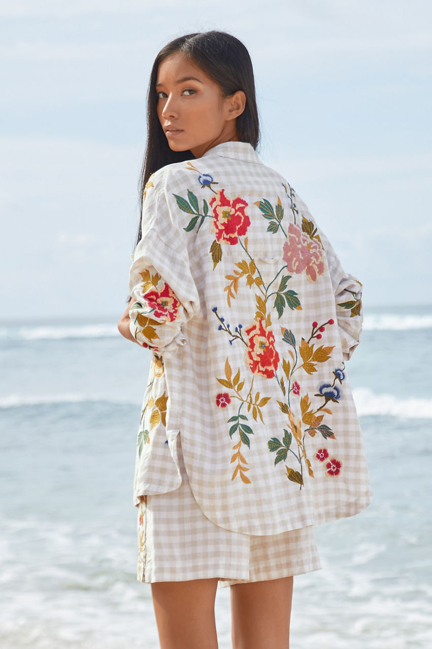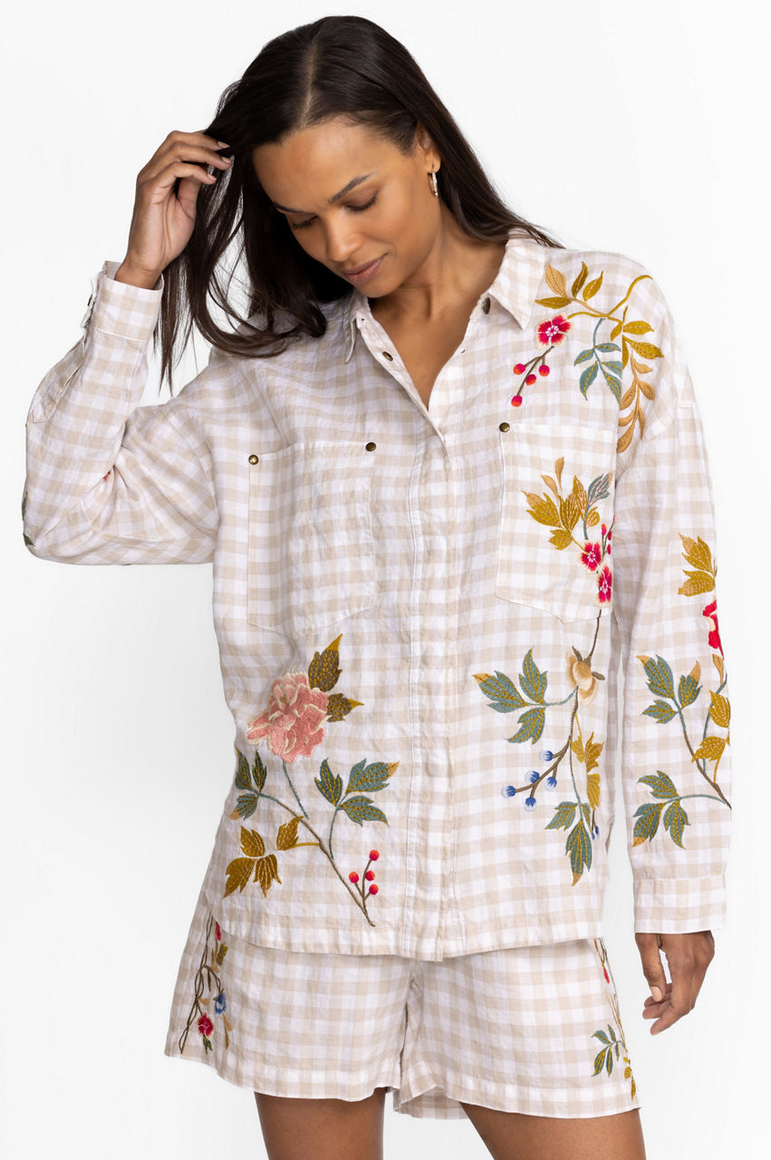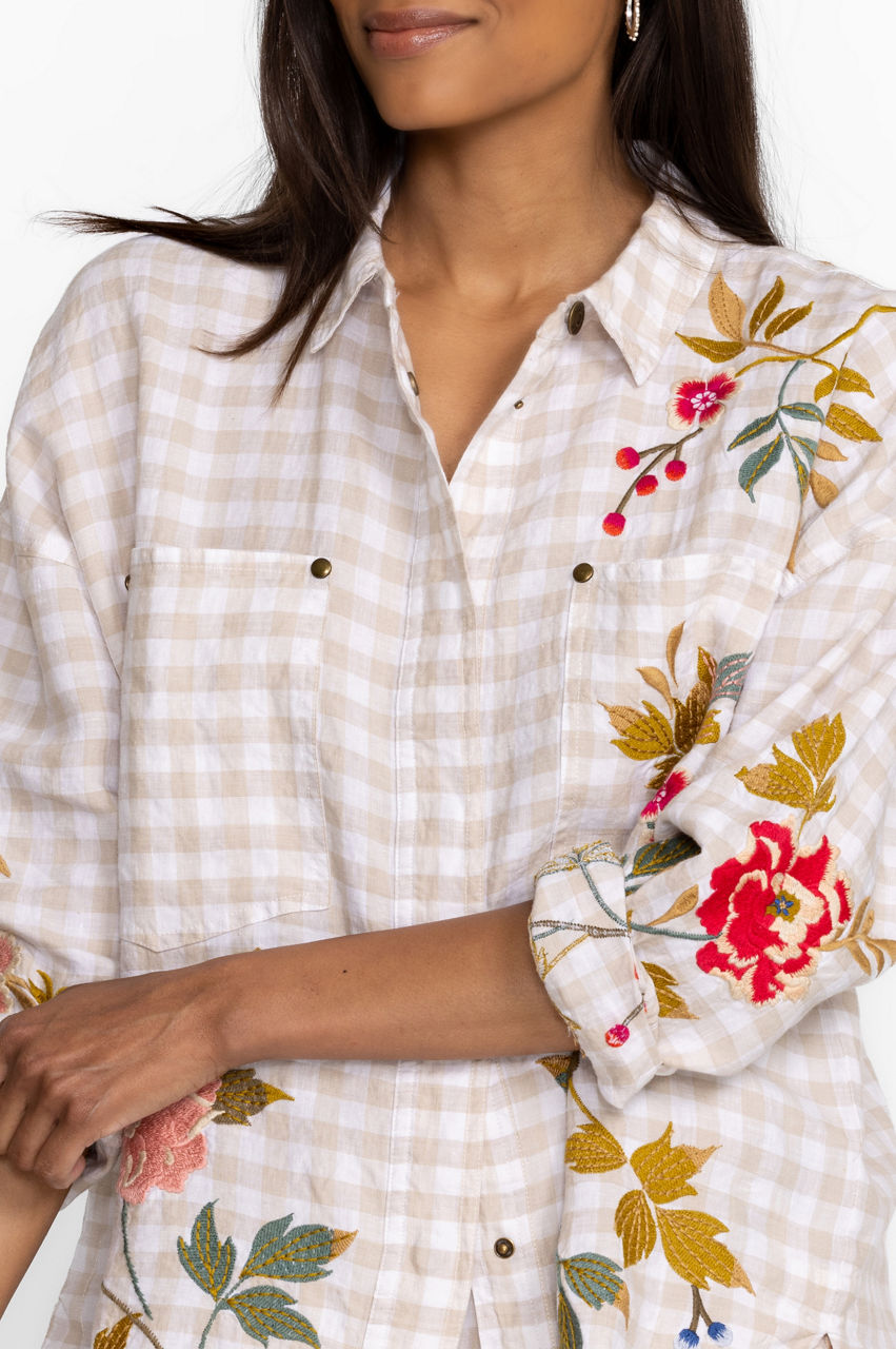 Quintessential gingham with a modern twist, the Adele Gingham Pocket Overshirt takes this this classic pattern to new heights. Cloaked in floral bouquets and delicate vines, this 100% linen blouse with a snap button front features placement embroidery as a decorative adornment. This brilliant combination pairs perfectly with traditional chinos and leather flats.