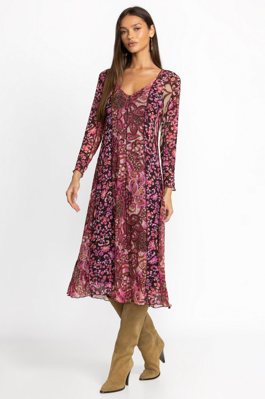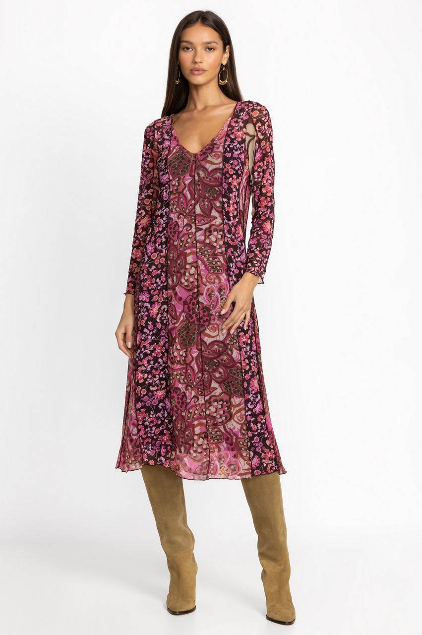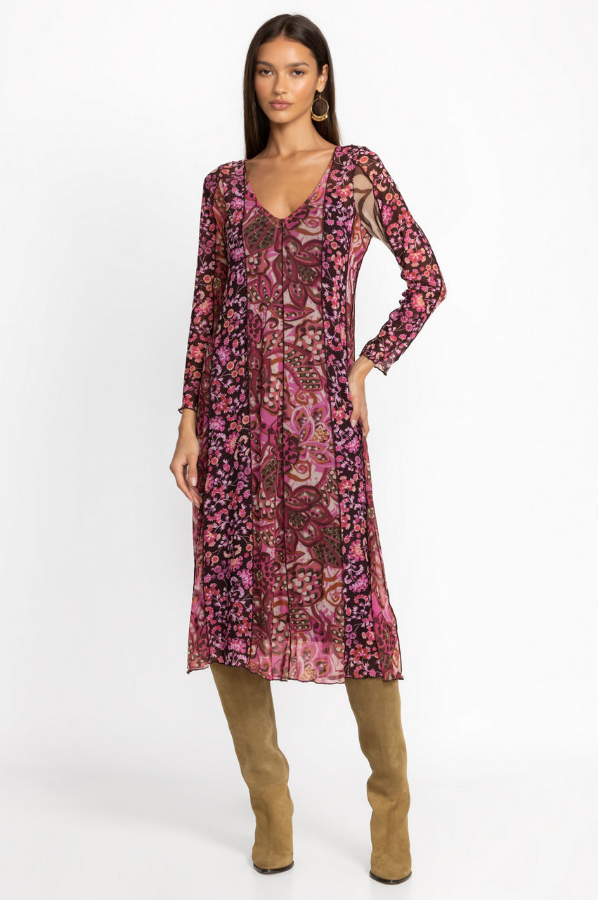 Underpinned with a femme feel, the Agatha Mesh Midi Dress plays with color and construction. Falling to a midi length, this stretch mesh dress features a V-neck, long sleeves, a paneled construction, and a striking pattern in pink and red shades. Style this dress with a low heel and a clutch for a fashion-forward occasion ensemble.