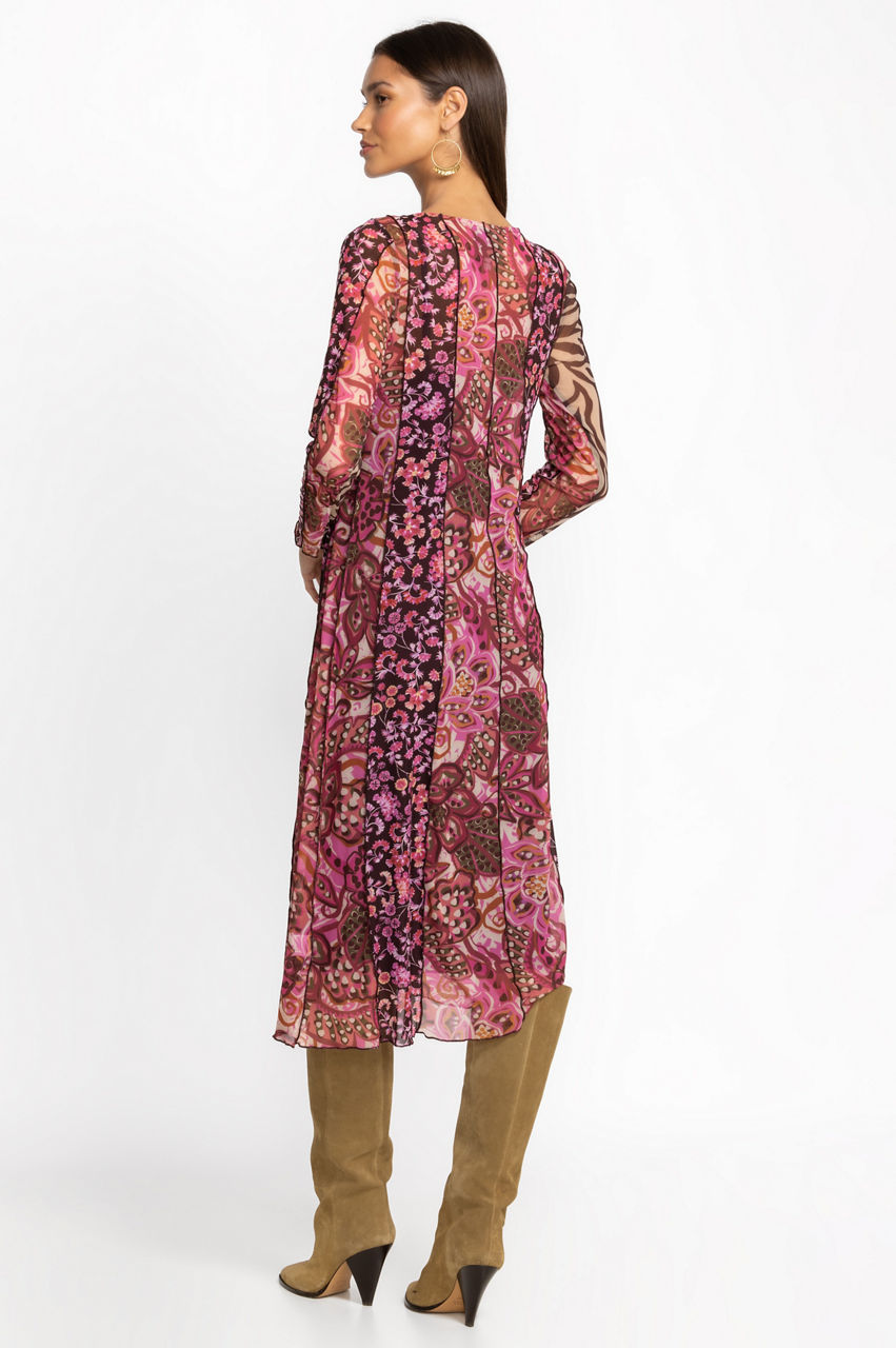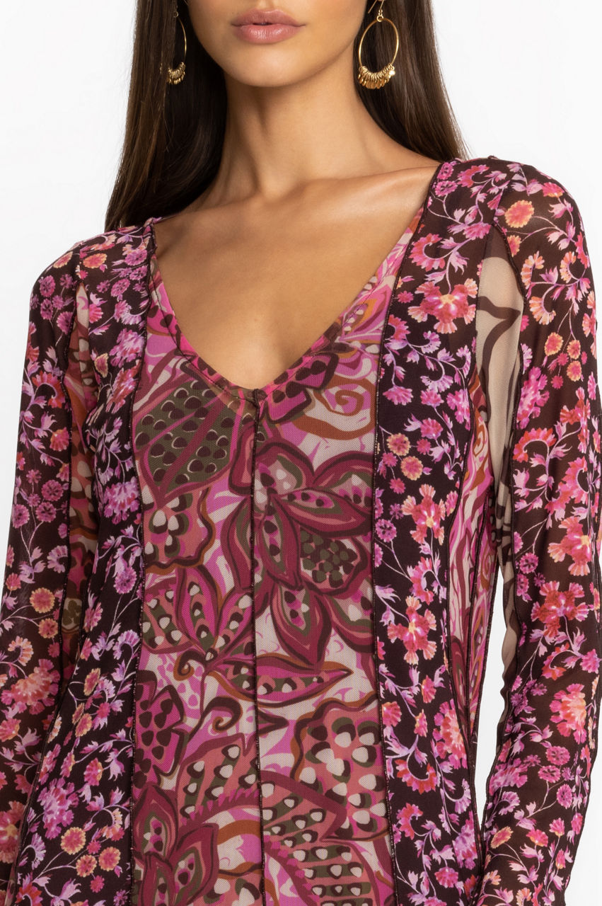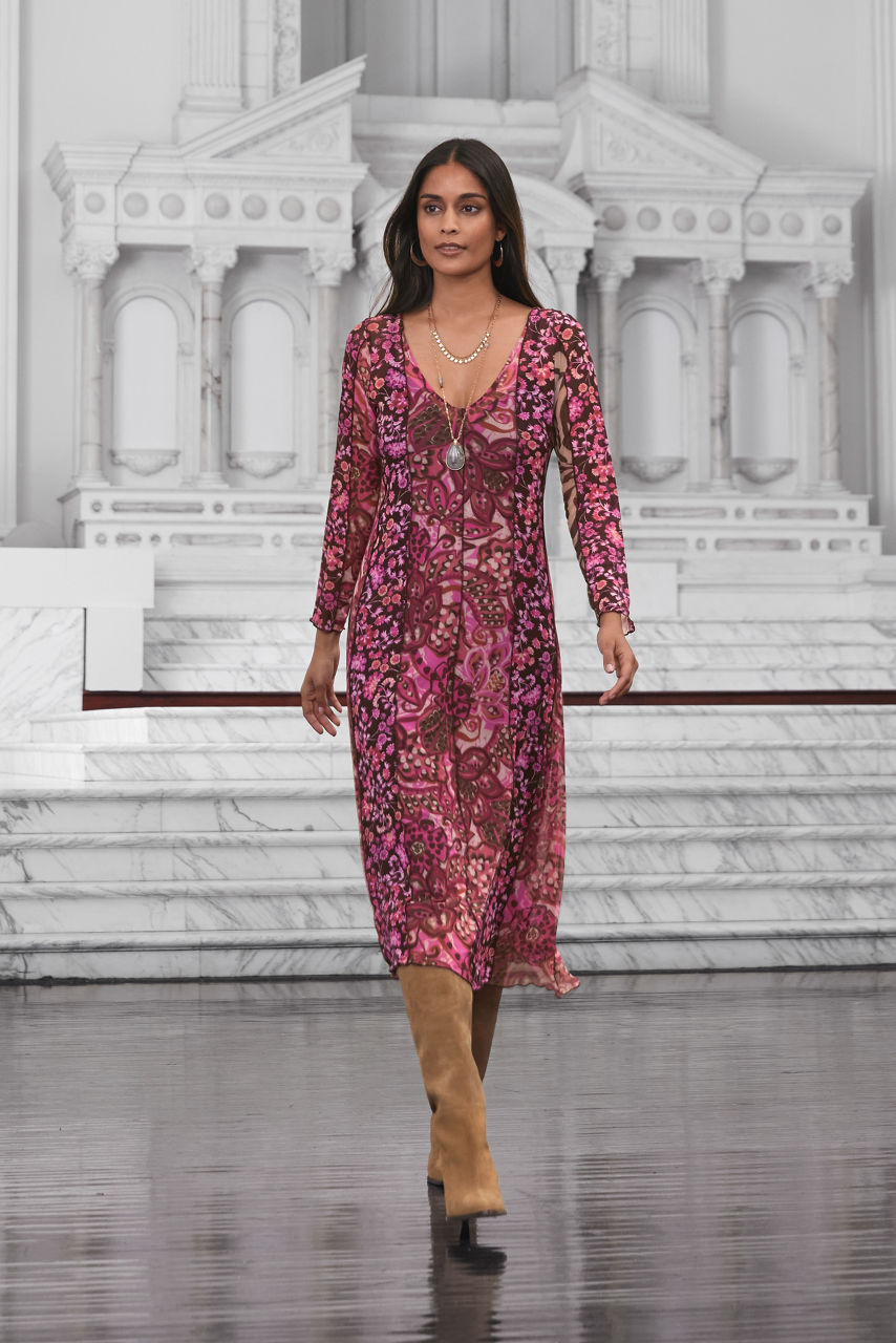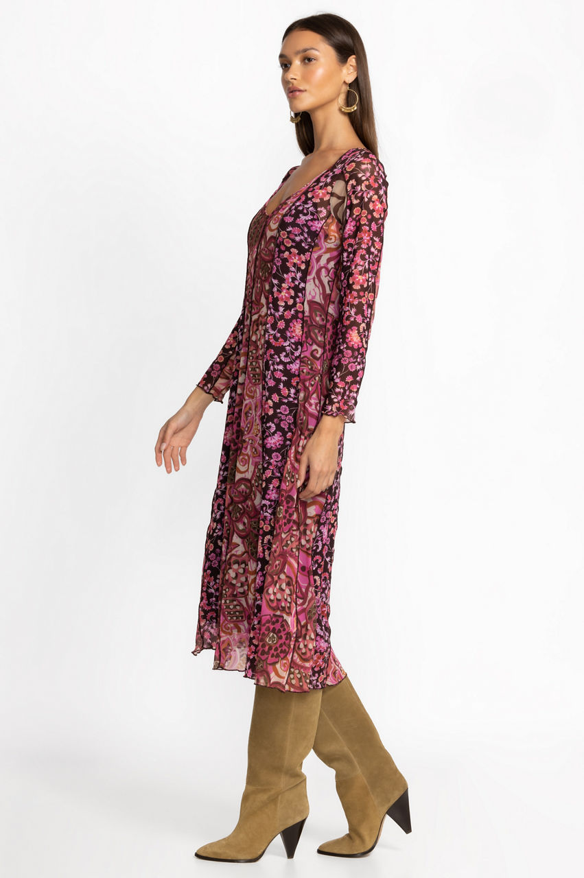 Underpinned with a femme feel, the Agatha Mesh Midi Dress plays with color and construction. Falling to a midi length, this stretch mesh dress features a V-neck, long sleeves, a paneled construction, and a striking pattern in pink and red shades. Style this dress with a low heel and a clutch for a fashion-forward occasion ensemble.