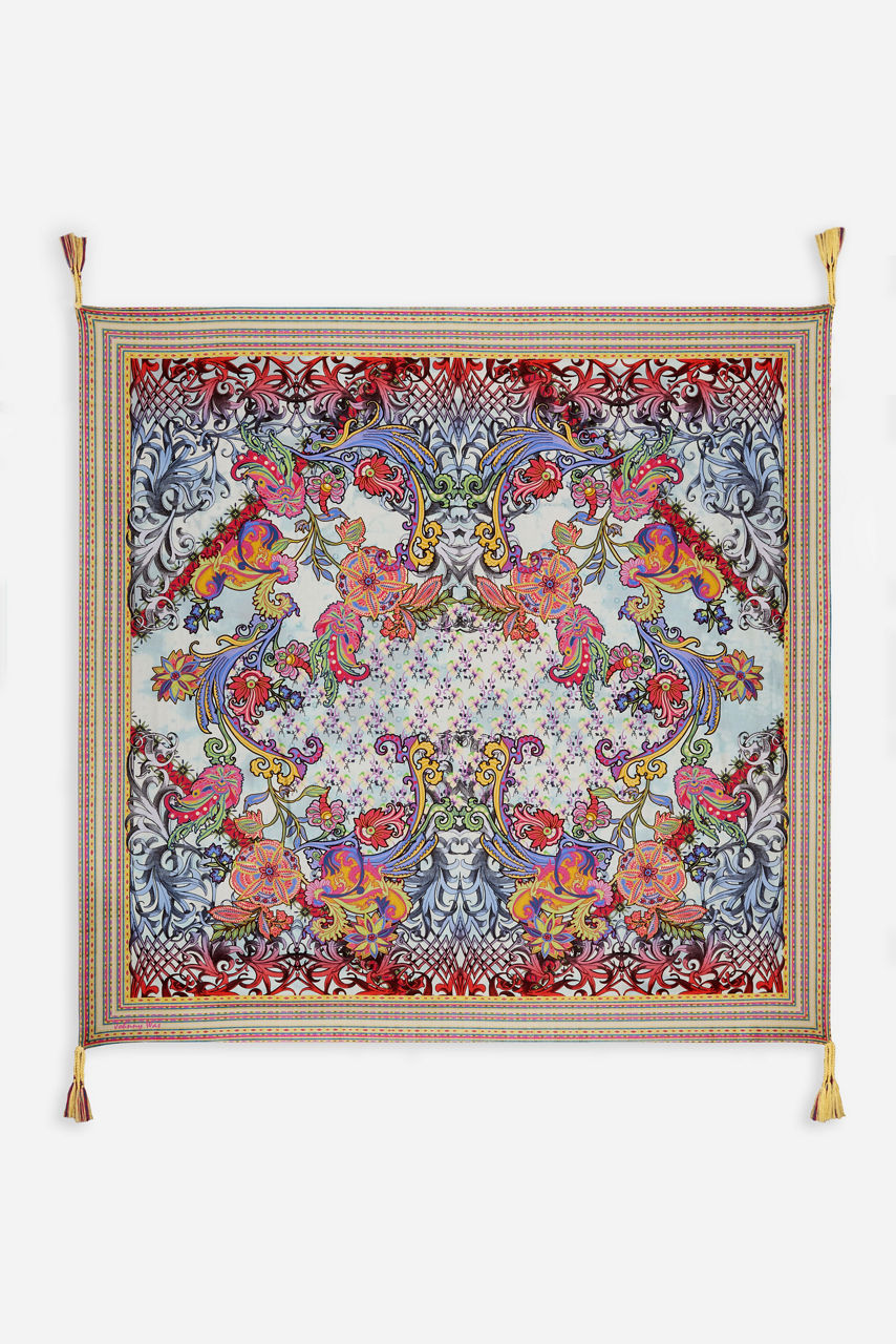 Embellished with an eye-catching floral print, the Akai Silk Scarf adds beauty and elegance to any look. Crafted from 100% luxurious silk, this unique scarf is finished with a bold print and contrasting border and features tassels at each corner. Wear tied at the neck or on the handle of your favorite bag for a splash of color and enhanced texture.