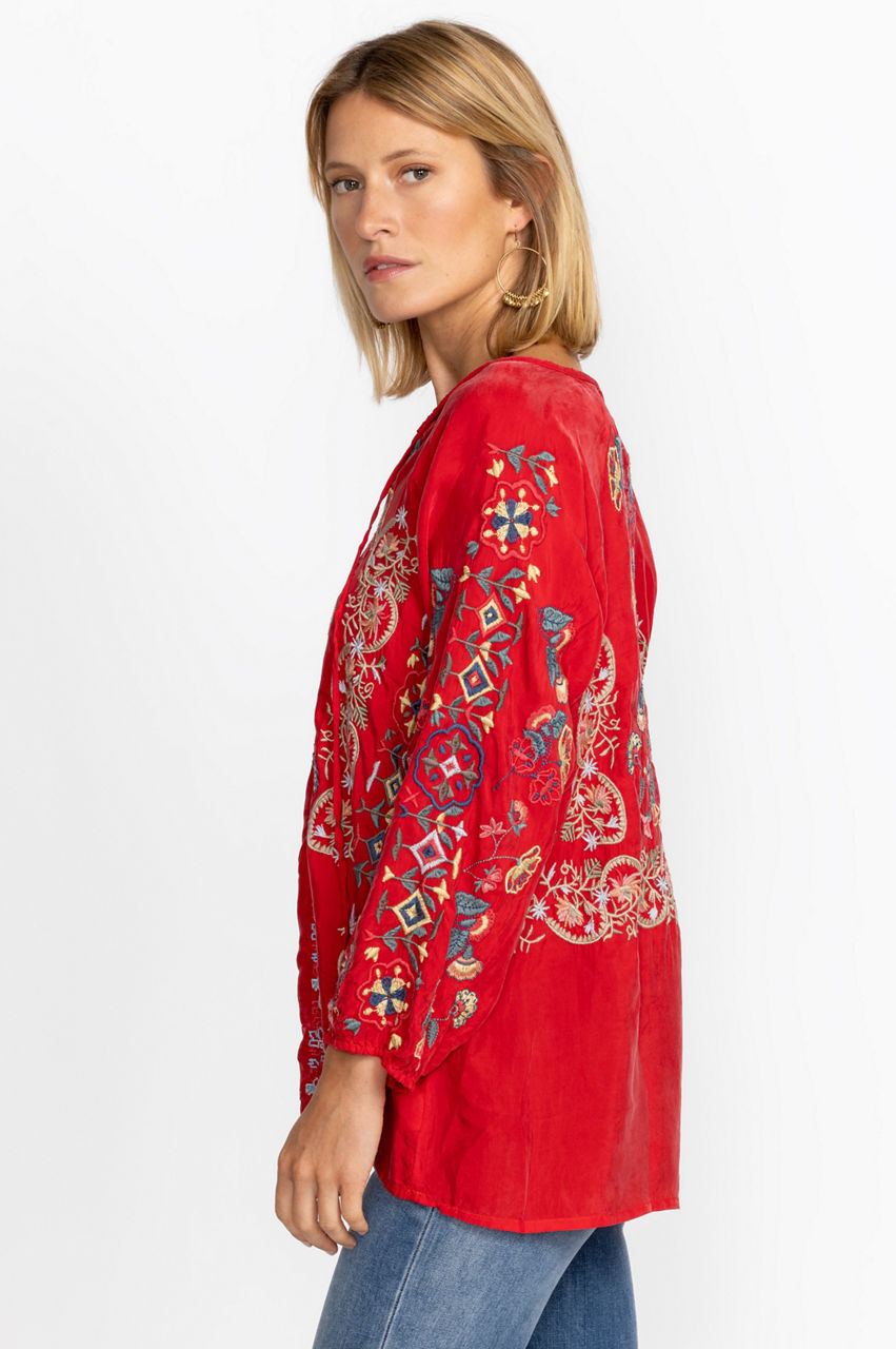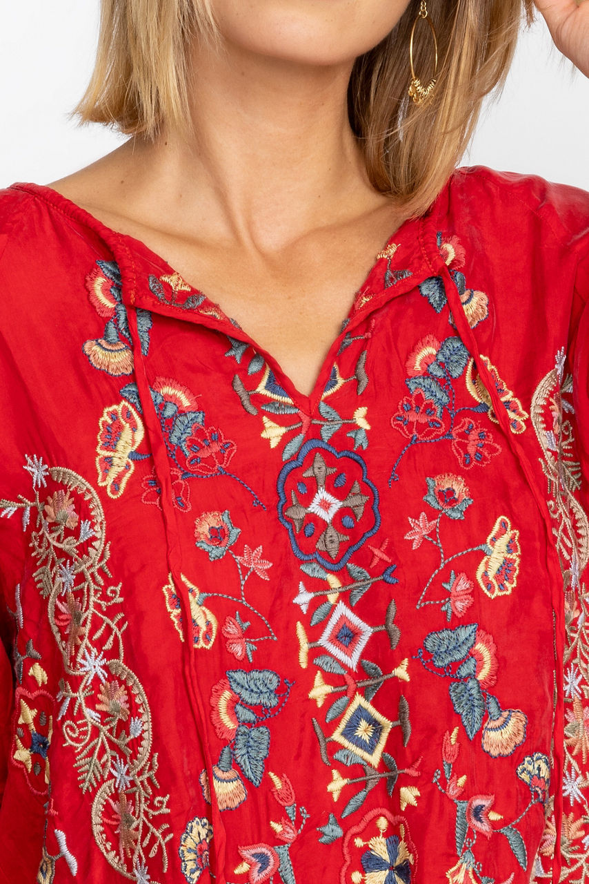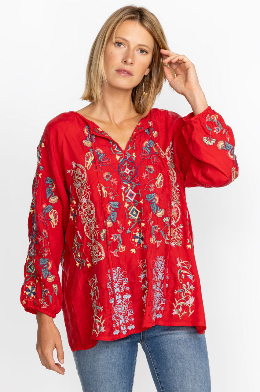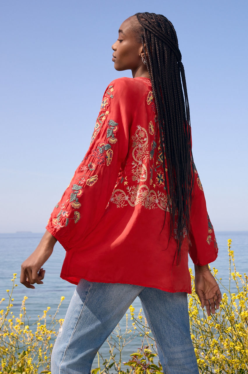 Crafted from a comfortable and lightweight material, the Akira Blouse ignites wanderlust thanks to its flowy silhouette and detailed placement embroidery. Underscored with a bohemian feel, this blouse boasts a round neck and long elastic sleeves. Style this blouse with jeans or opt for neutral linens and woven accessories.