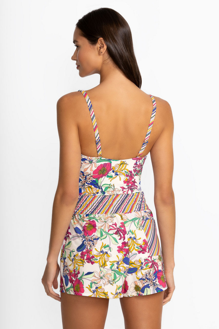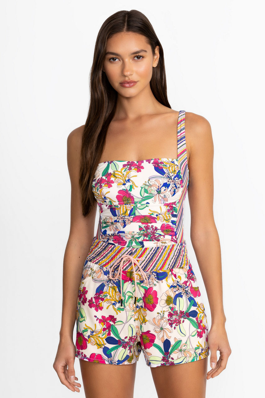 Thoughtfully crafted from 100% recycled polyester, the High Waisted Board Shorts are adorned with a bold floral pattern. Designed with a drawstring elastic waist for a customizable fit, these shorts are finished with slip pockets in the front and a patch pocket at the back. Pair with the Back Ring Bikini Top for a comfortable beach-ready look.