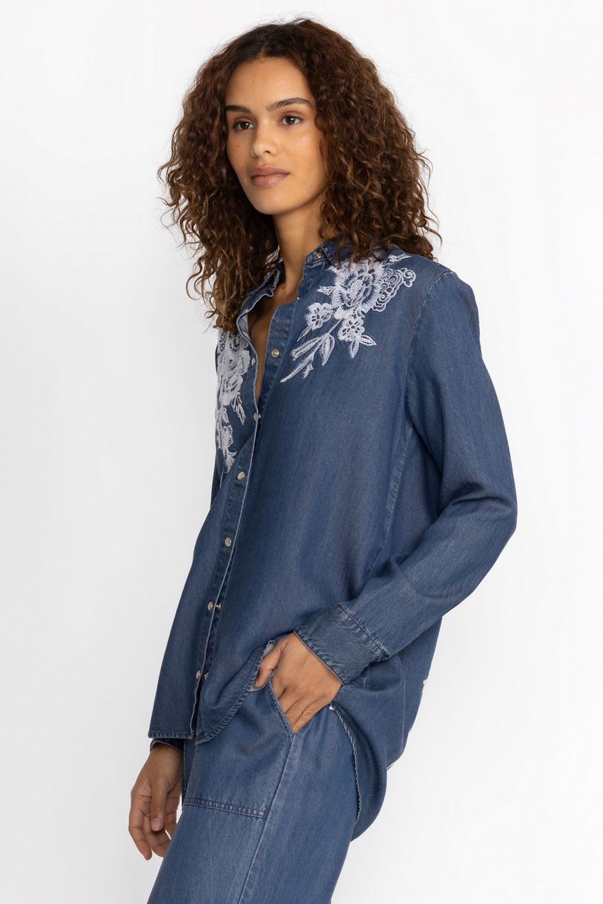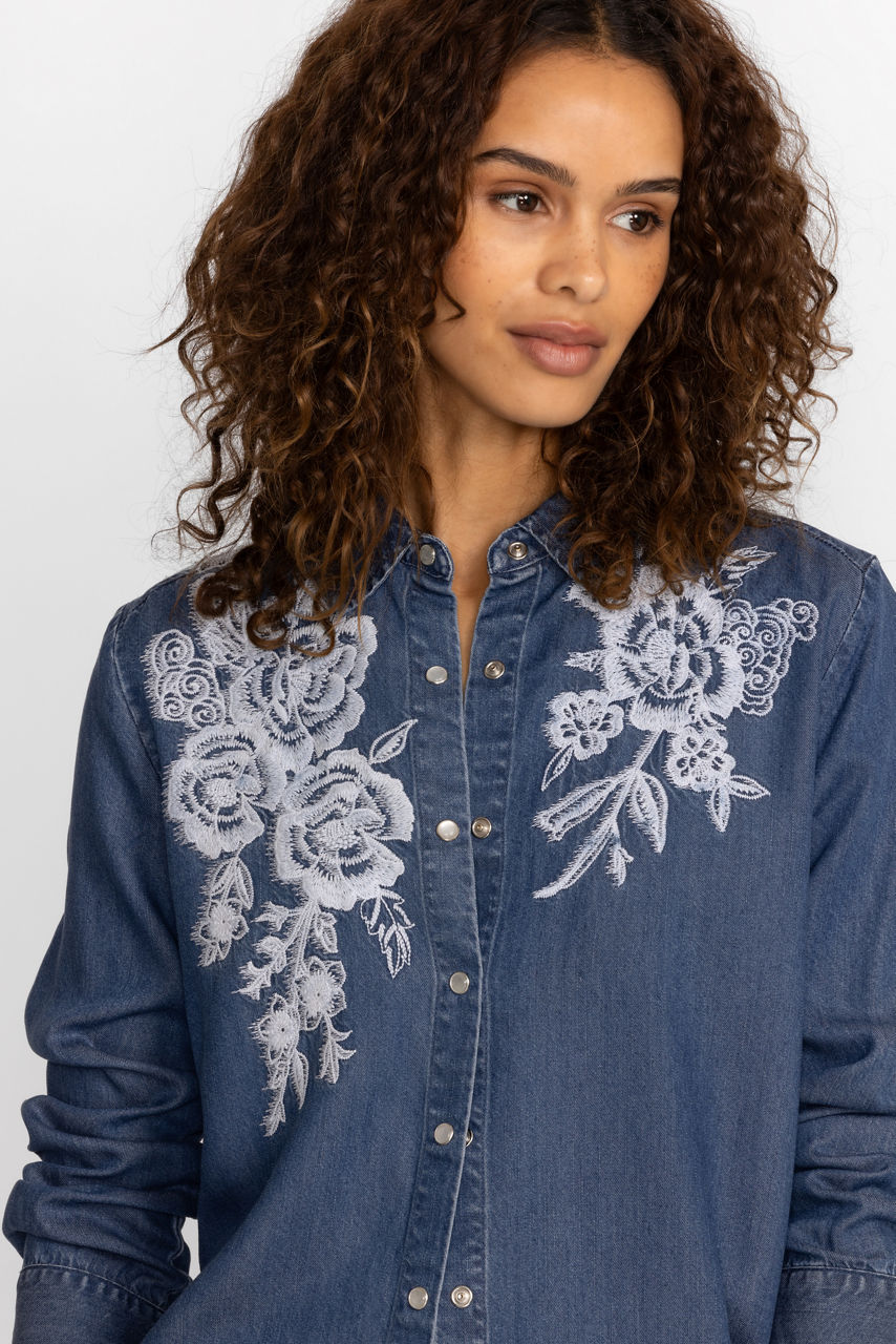 Delivering a delightfully modern take on denim shirting, the Alicent Denim Button Down Shirt is a casual top with a lot of style. Crafted from 100% lyocell offering the feel of broken-in denim, this blouse features beautifully placed embroidery and unique pearl snap buttons. Pair with a white denim skirt and western boots for a stylish weekend option.