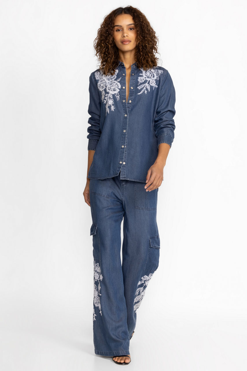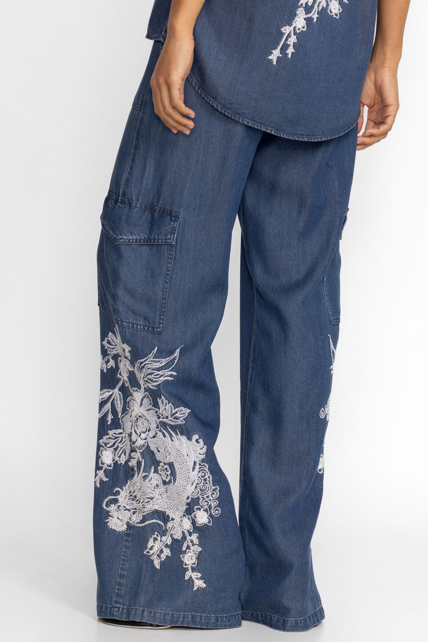 Crafted from 100% lyocell, the Alicent Denim Cargo Pants feel like your favorite broken-in jeans. Featuring a comfortable elastic waist with a zipper closure, these unique pants are adorned with ornate placement embroidery and large cargo pockets. Pair with a white linen button down and ankle boots for a complete casual ensemble.