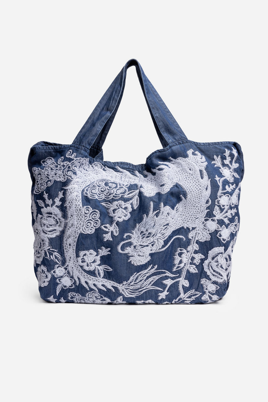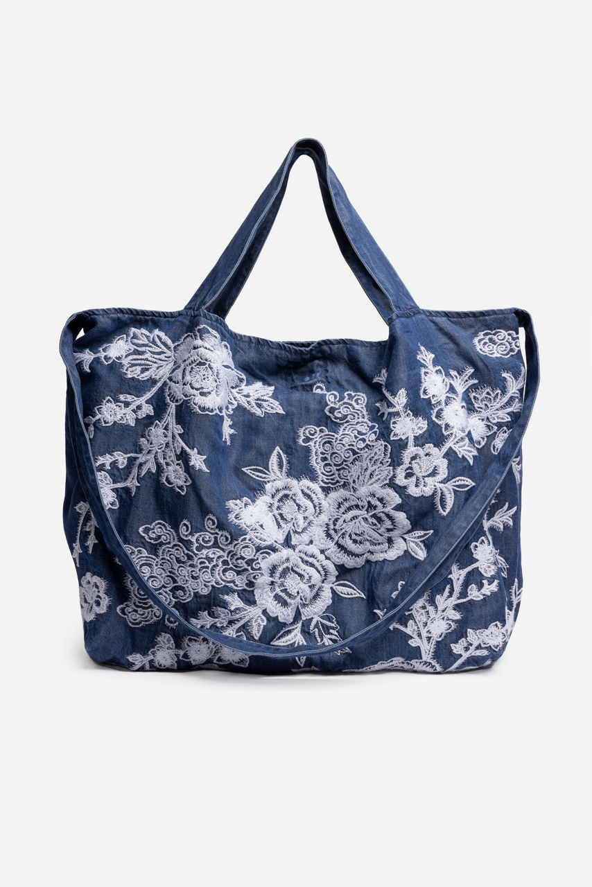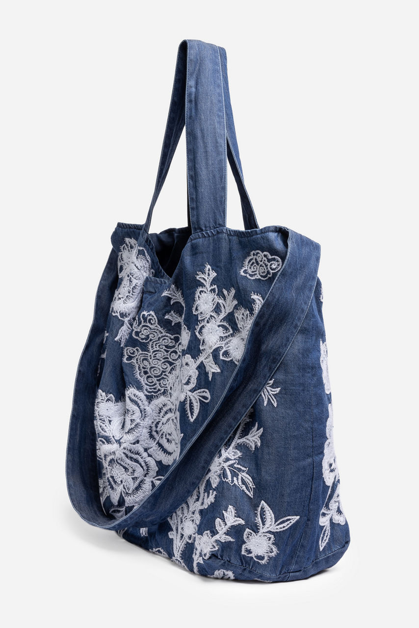 The Alicent Denim Tote Bag offers a stylish way to carry your daily essentials. Crafted from 100% lyocell, this unique embroidered bag features two strap lengths, an easy snap closure, and a spacious interior. Pair with every day casual pieces from your wardrobe.