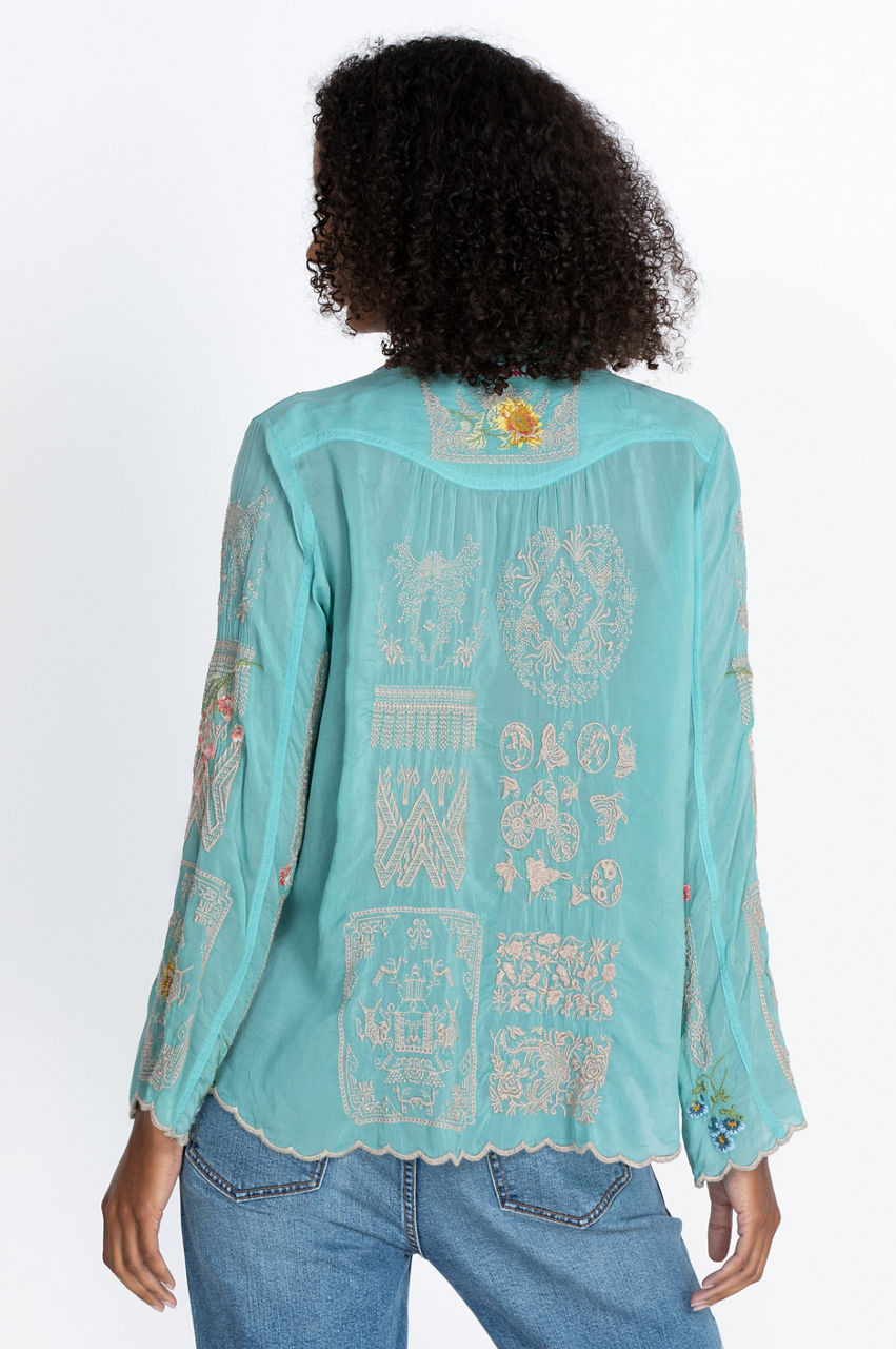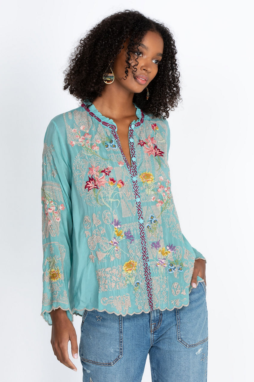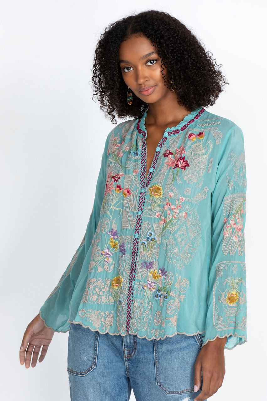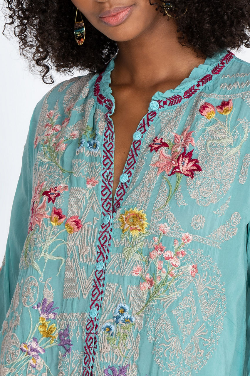 The Allbee Blouse has a perfect flowy silhouette featuring rich embroidery with exquisite floral patterns. This gorgeous blouse with an effortless look has an embroidered neckline and blouse closure creating an individualistic look. The timeless fit of this blouse pairs easily with leggings or skinny jeans, Italian leather sandals, dangly jewelry, and your favorite hat for the boho-chic look.