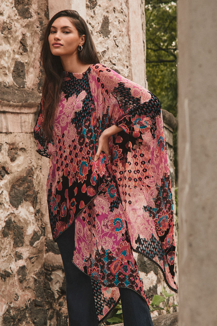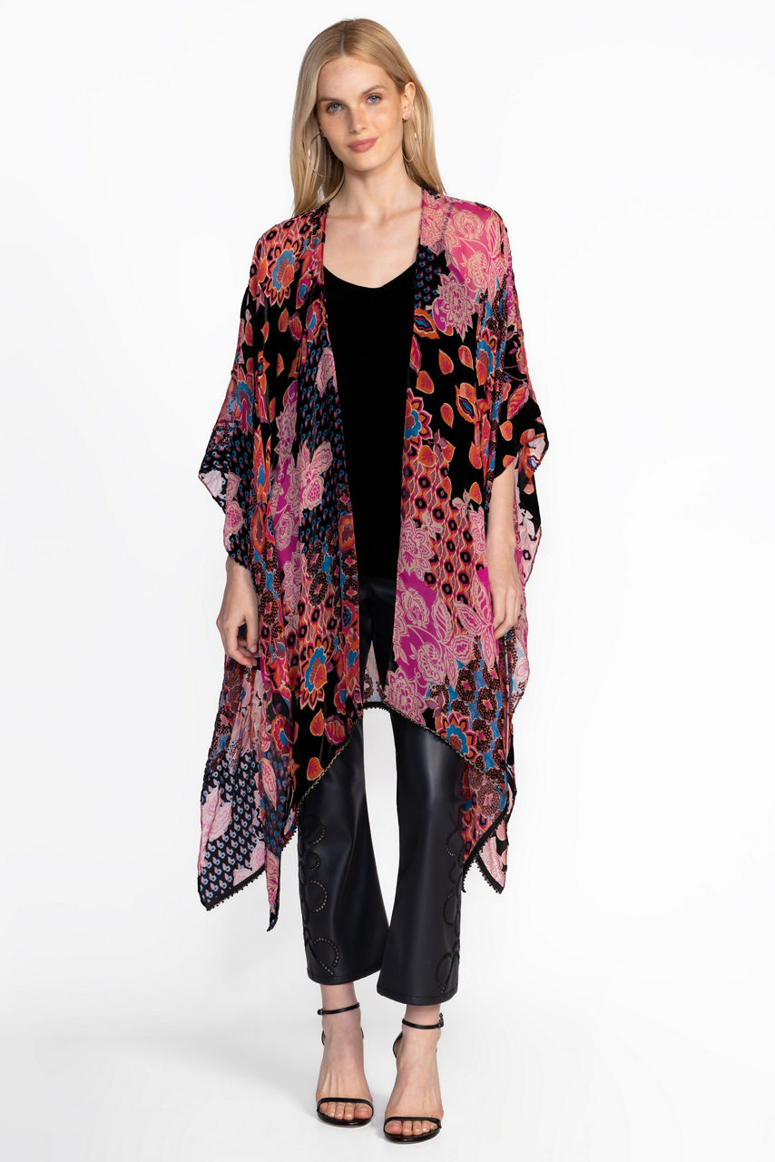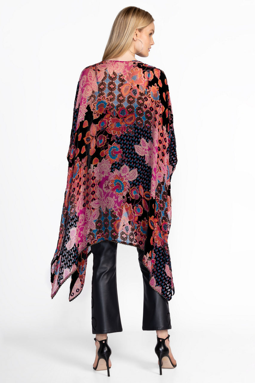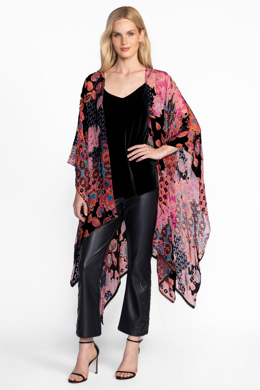 Thoughtfully crafted from a rich silk blend, the Burnout Shawl adds a splash of color and texture to any look. Designed to sit comfortably across the shoulders, this beautifully draped shawl features an open front and an intricately beaded scalloped trim. Layer over a fitted top and classic cigarette pants for an elevated casual look.