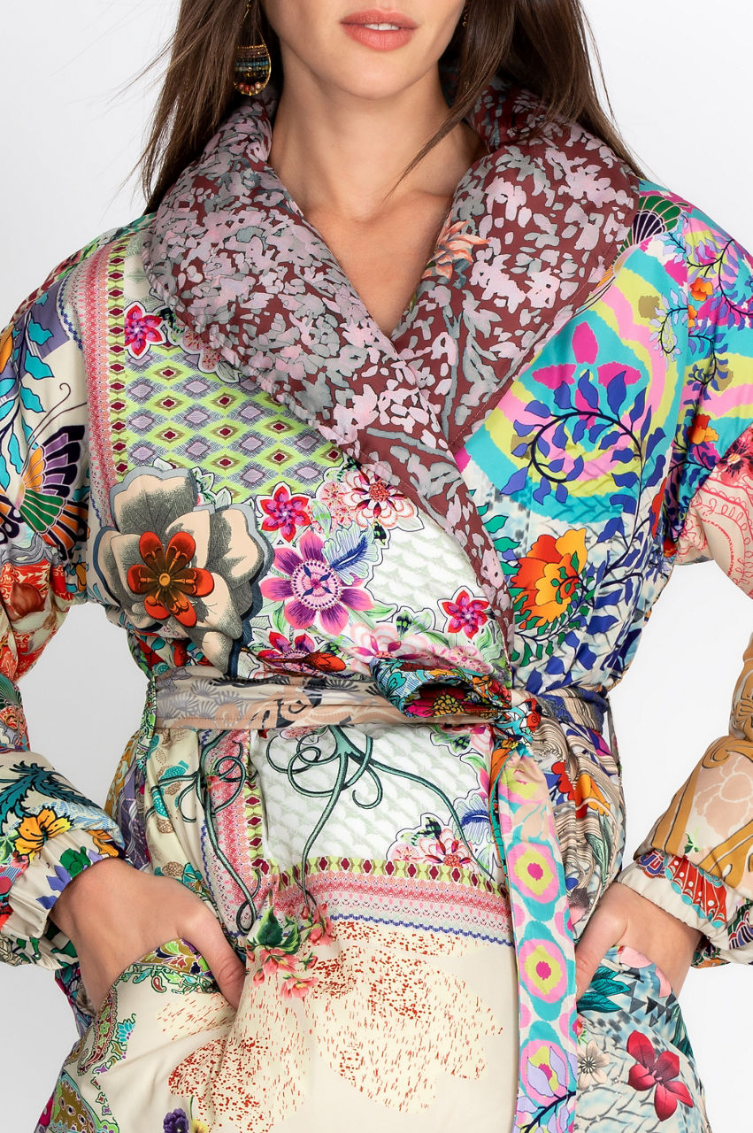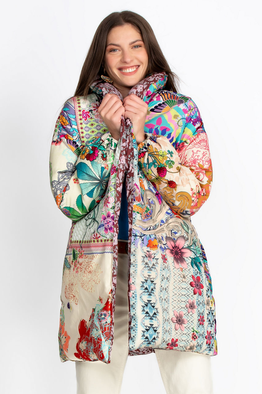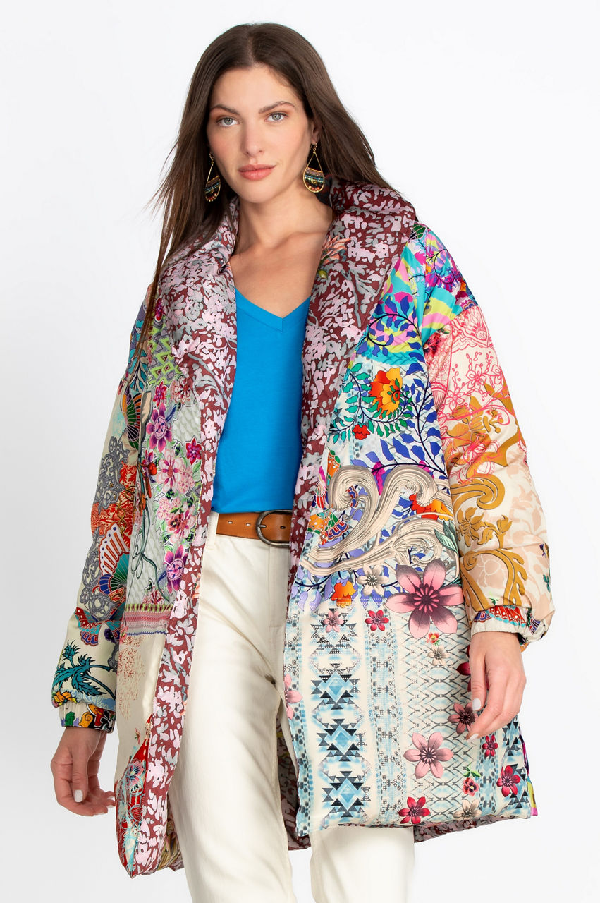 Stay warm and stylish with the Alyssa Down Puffer and its bolt vintage print. This reversible puffer coat features a belt and an elegant shawl lapel for a boho-chic look. Wear this versatile coat over all your favorite outfits, whether you re wearing a pair of jeans for a night out with friends or a flowy top with some embroidered leggings for a special occasion.