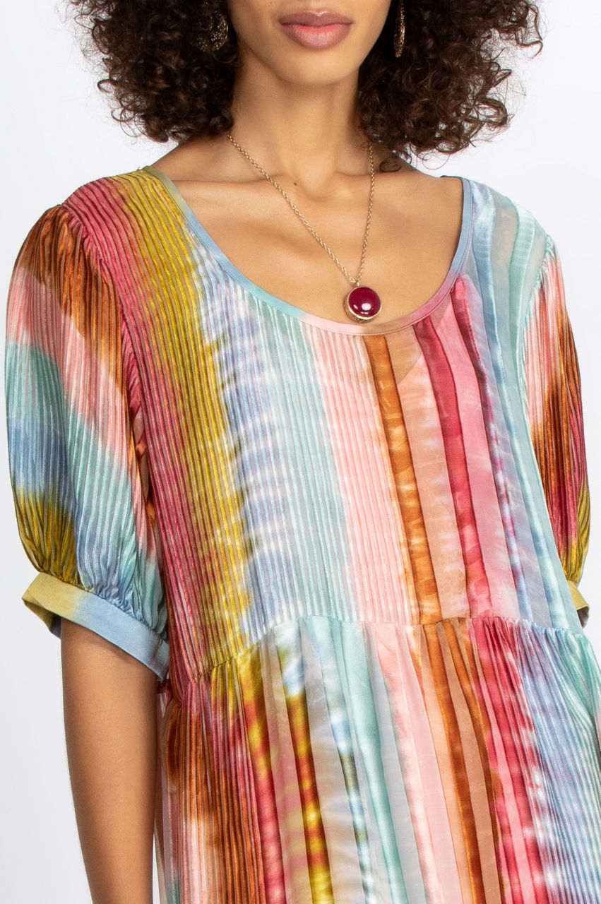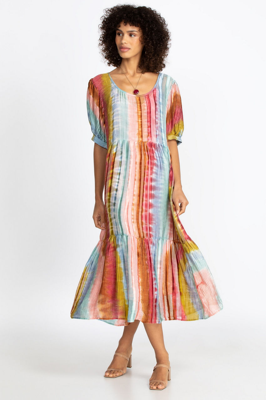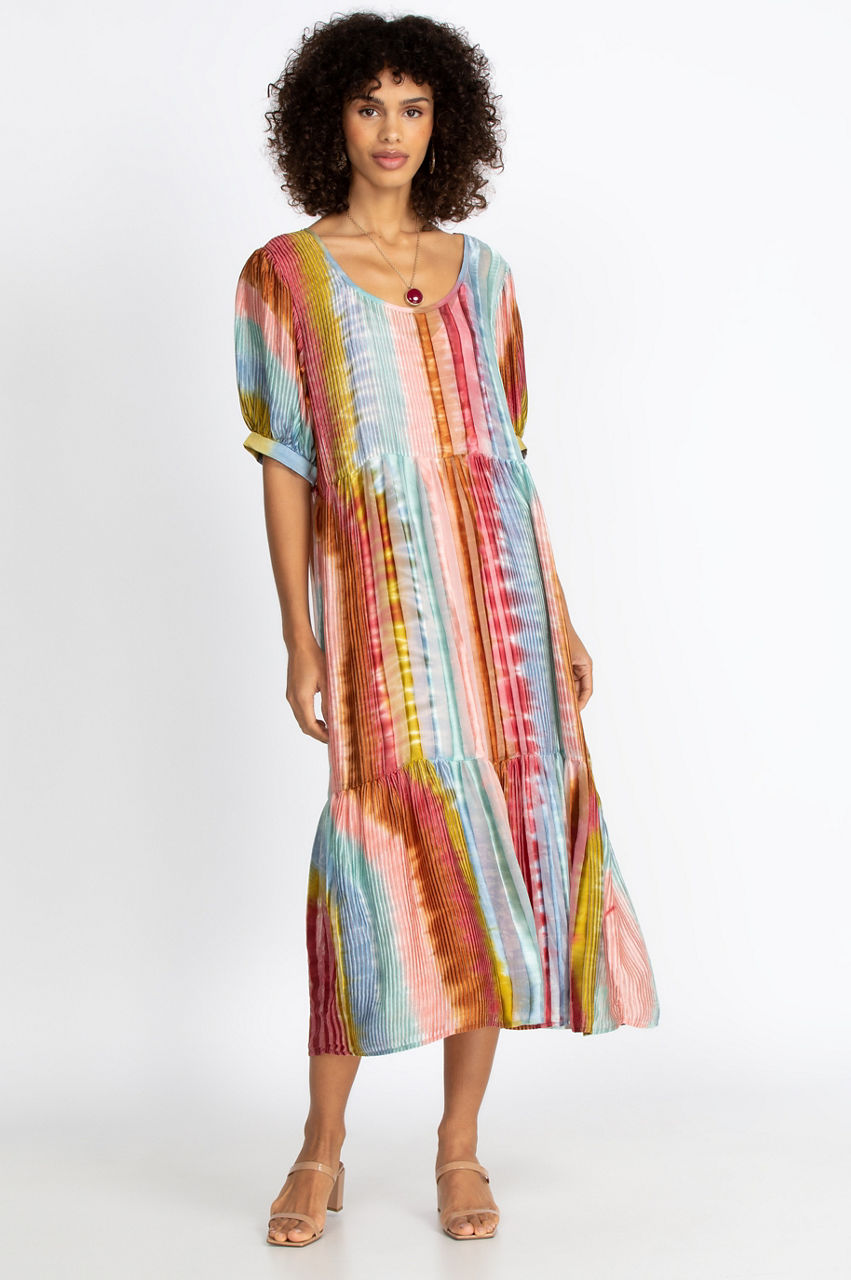 With its gorgeous dyed print and chic maxi length, the Noemi Dress combines effortless elegance with trendy boho style. The tiered cut creates an elevated silhouette perfect for sand or city. Pair with a kimono or bomber jacket for a refreshing beach look. Add your favorite silk scarf to complete the ensemble.