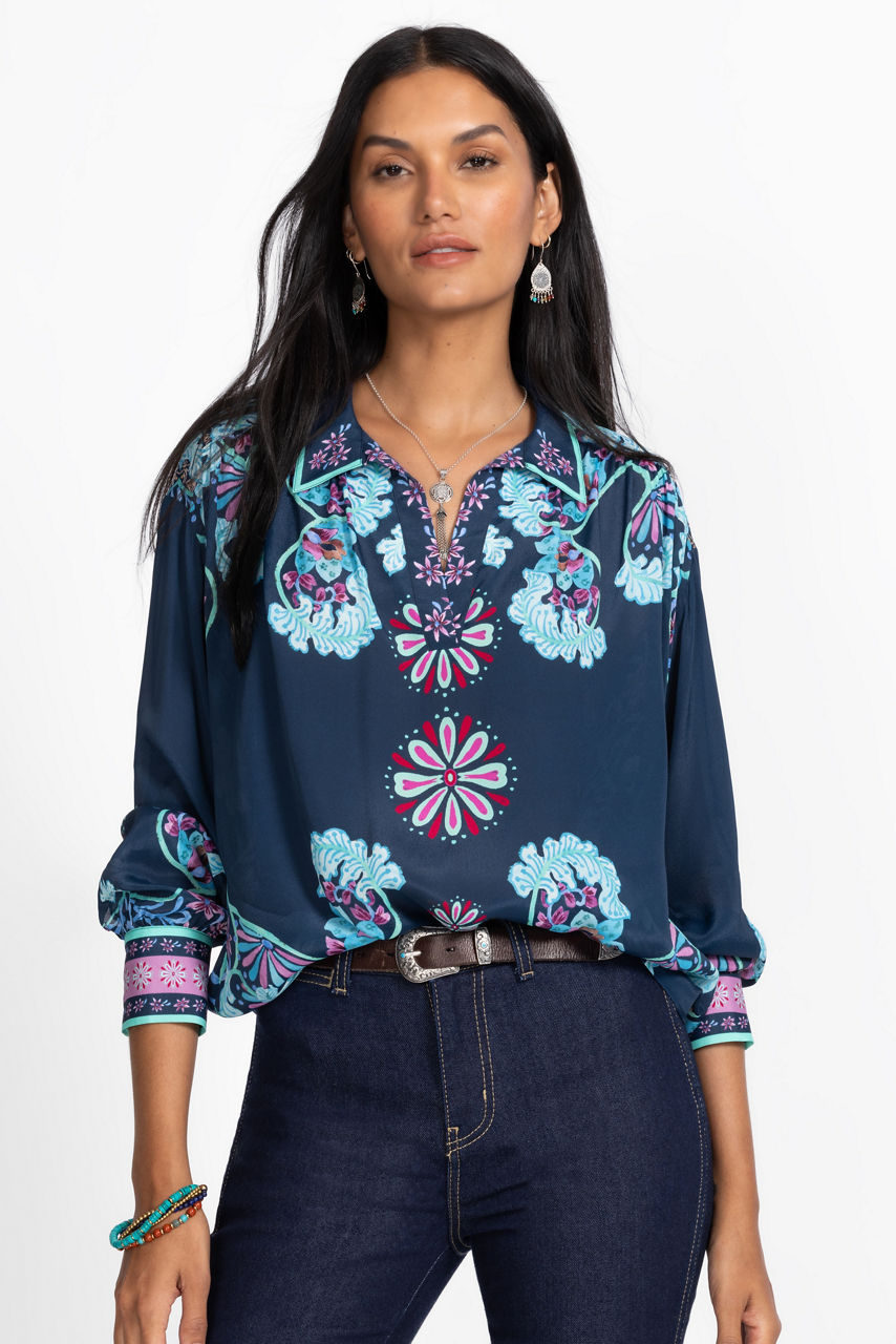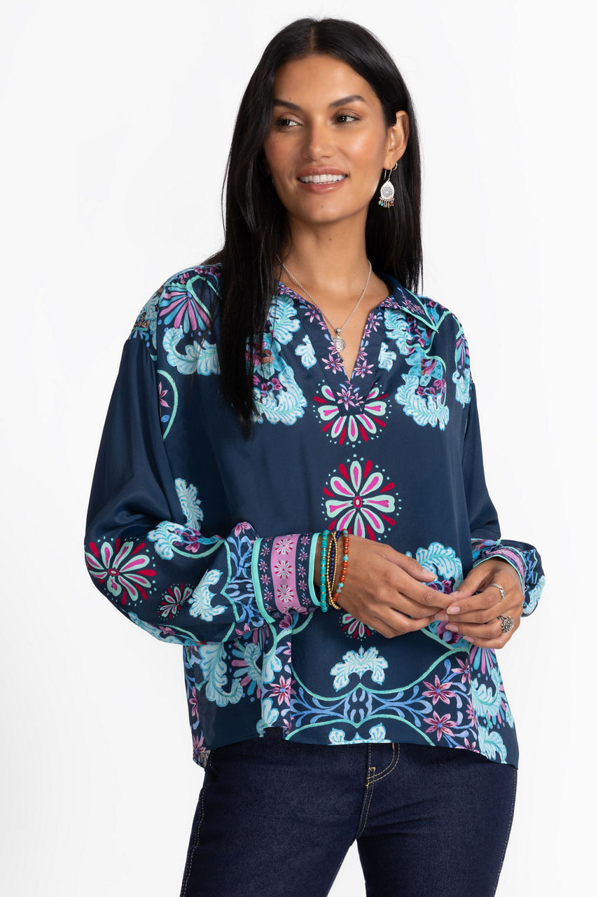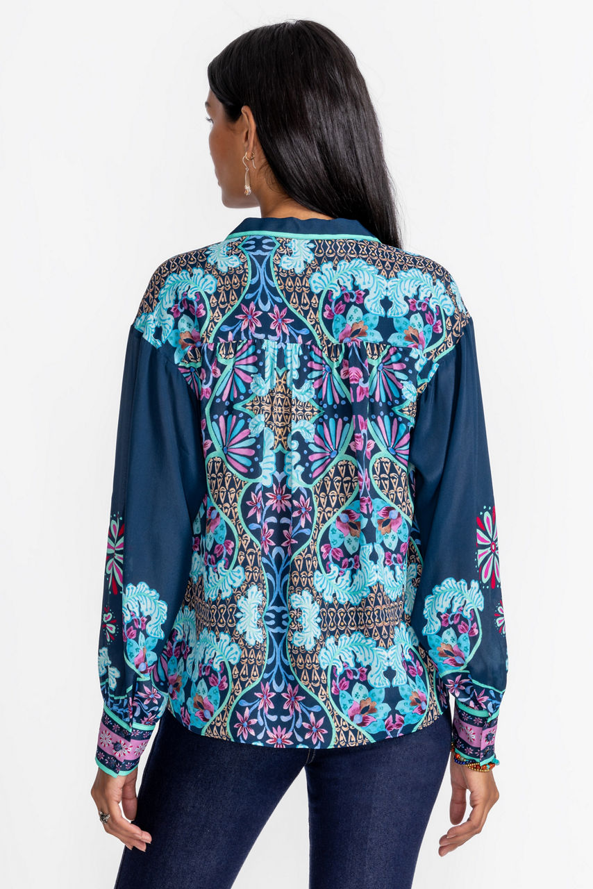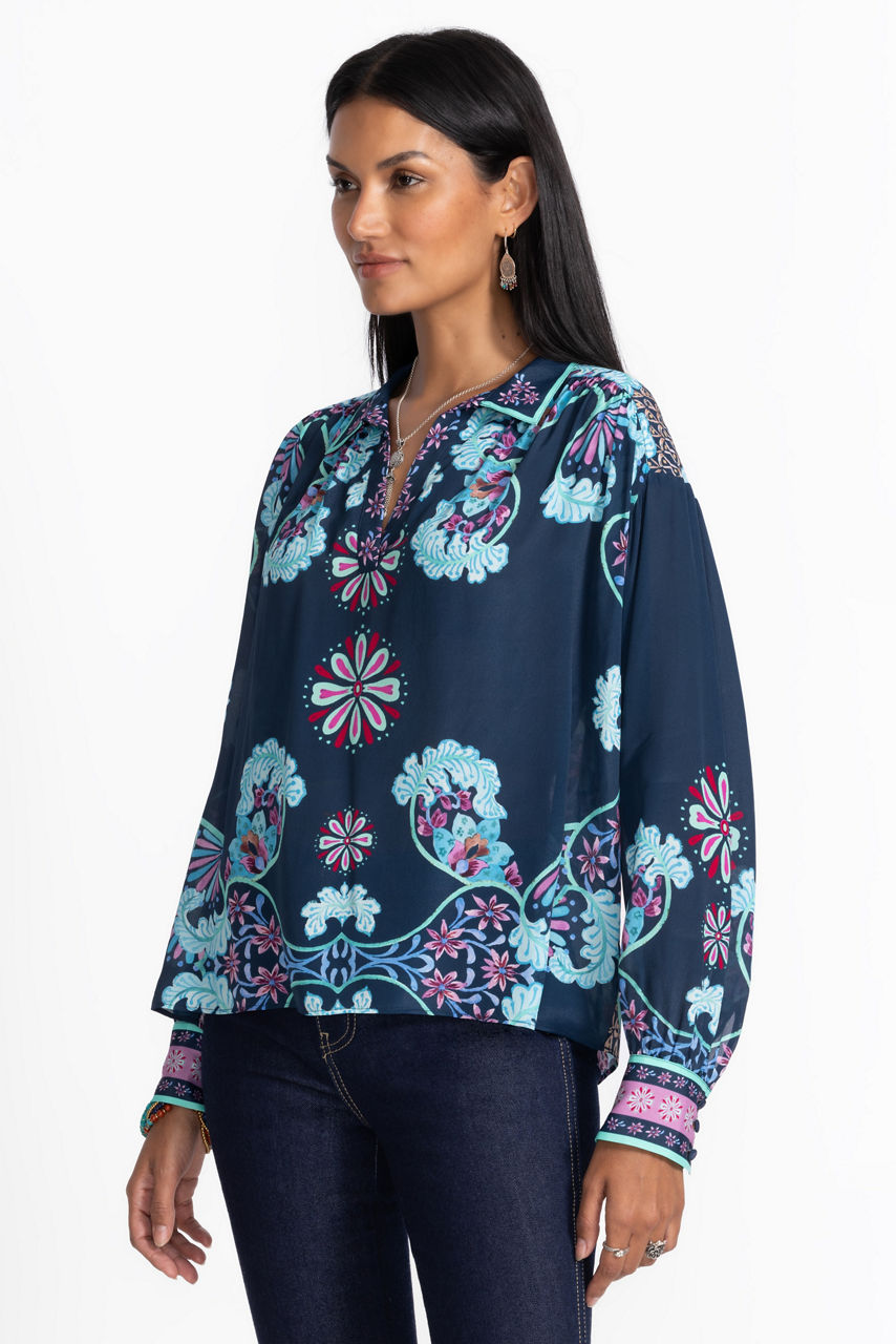 Crafted from a unique silk blend, the Amaya Blouse is embellished with bold color and a sophisticated feel. Featuring a split V-neckline and gathers at the shoulders and sleeves, this brilliantly colorful blouse is finished with a relaxed-fit bodice and contrasting cuffs. Pair with classic denim and polished flats for a stylish casual look.