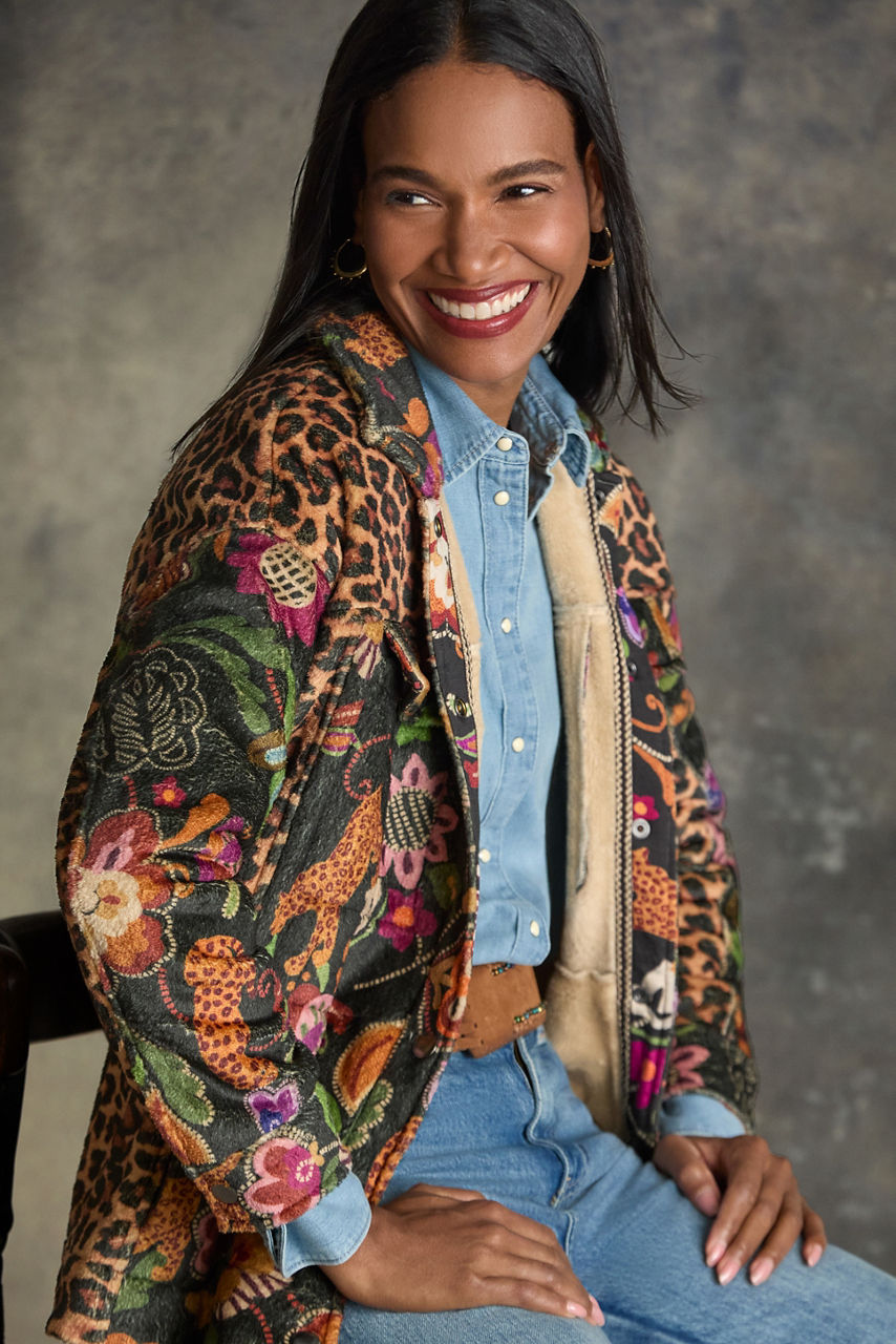 Adorned with a bold blend of colorful flora and fauna, the Amelie Sherpa Trucker Jacket adds texture and vibrant color to any look. Designed with a snap front closure and drop shoulders for a relaxed fit, this jacket is finished with on-seam and front flap pockets. Layer over a black jumpsuit and pair with trendy ankle boots for a casual night out.