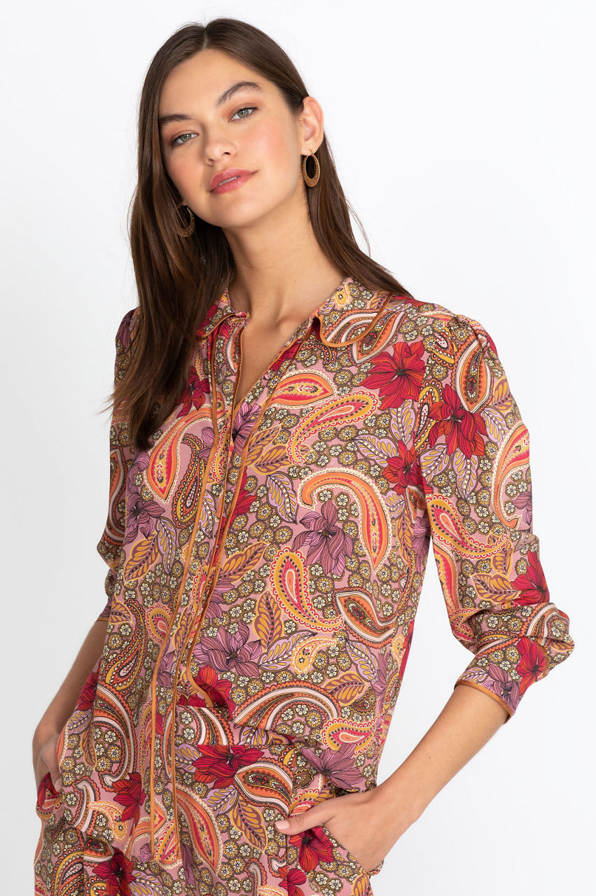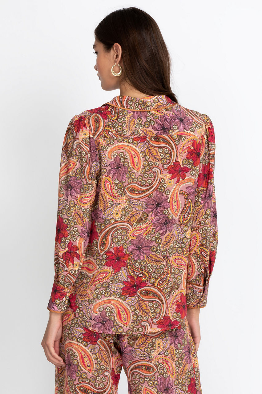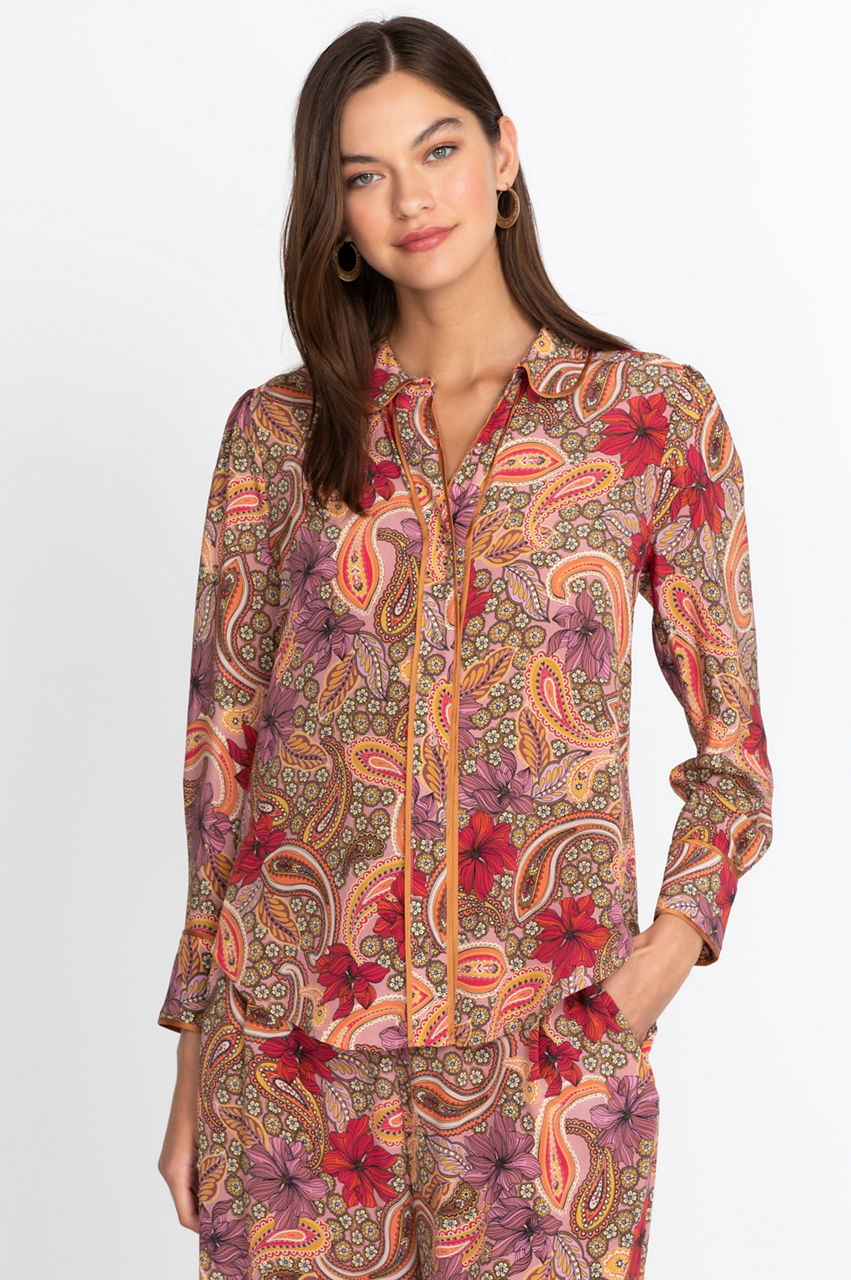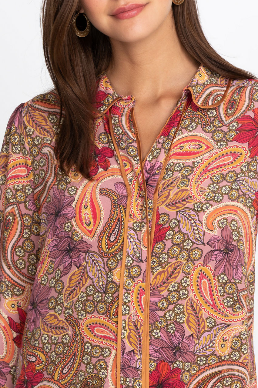 The Amy Piped Blouse is an elegant piece with its structured collar and shoulders. The piped details elevate this classic button-down top, while the floral and paisley motif create a retro-inspired look. Wear this stylish top with some jeans for a classic look, or add some color to a business casual outfit by styling this top with some dress pants and a blazer.