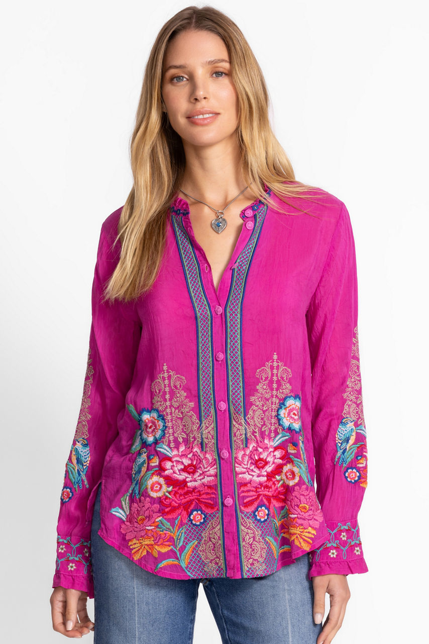 Crafted from a lightweight flowing fabric, the Amyle Shirt is adorned with a vibrant floral pattern. Designed with a ruffled collar and cuffs, this button-front shirt is finished with a curved hemline and side slits for a relaxed fit. Pair with wide-leg trousers and flats for a vibrant workday ensemble.