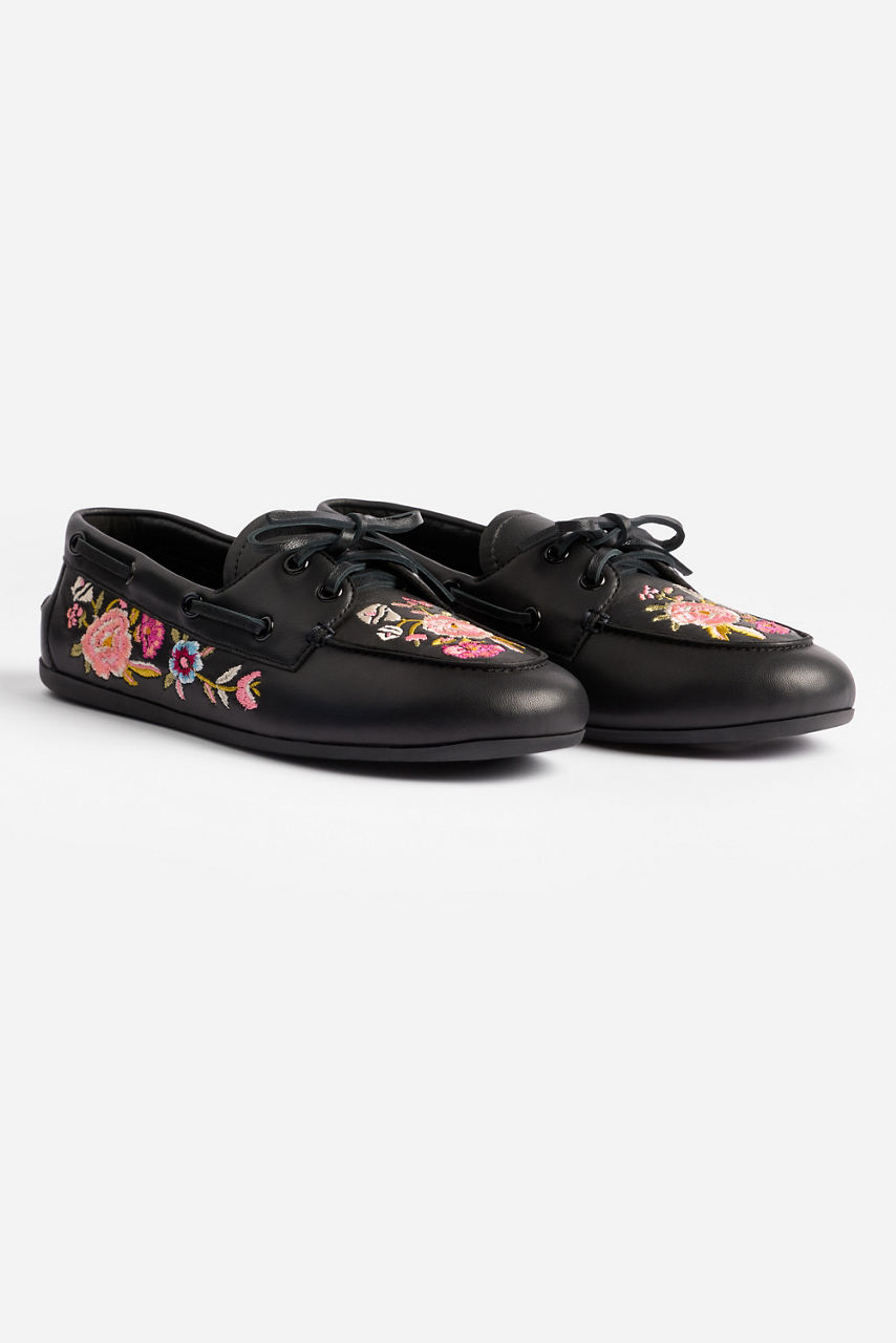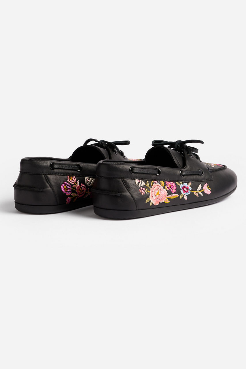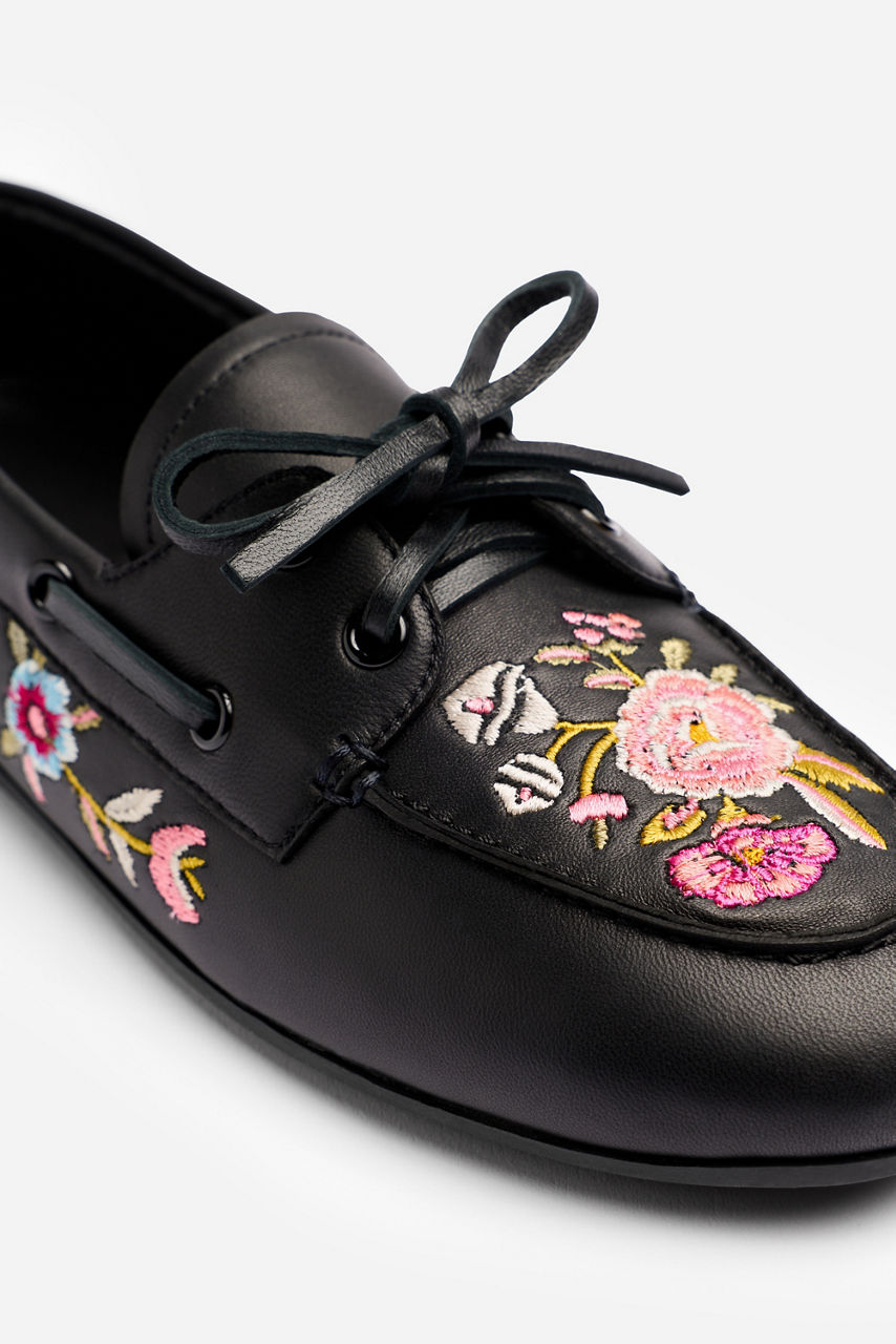 Crafted from 100% leather, the Anaya Embroidered Boat Shoes perfectly combine elevated style and casual comfort. Featuring a flat sole and leather lacing, these stylish shoes are finished with vibrant floral embroidered detailing for a splash of color. Pair with denim trousers and a coordinating floral top for a vacation-inspired look.