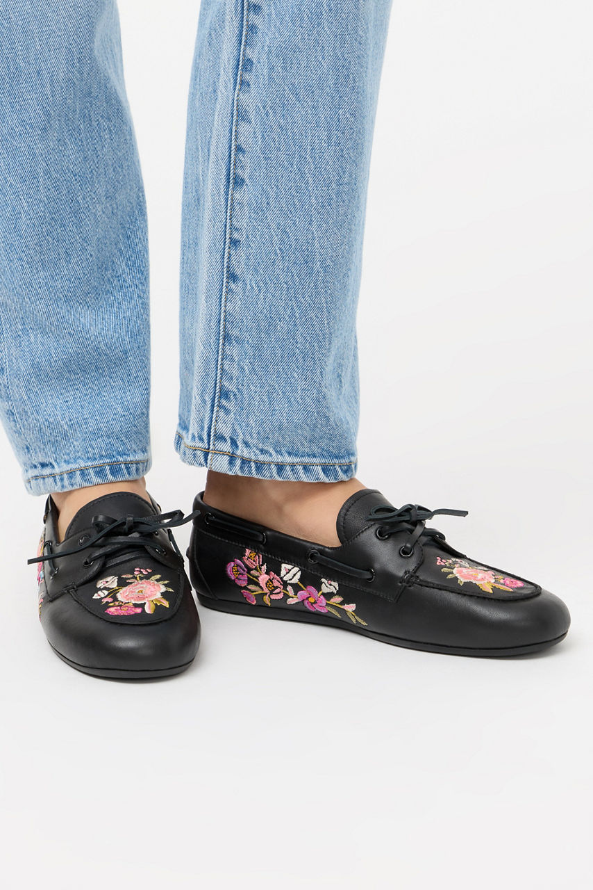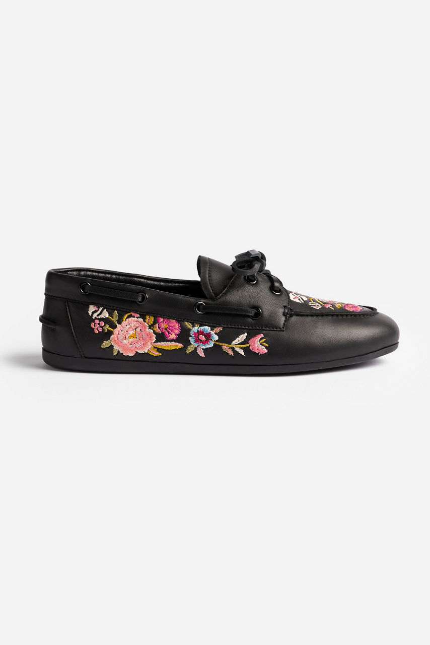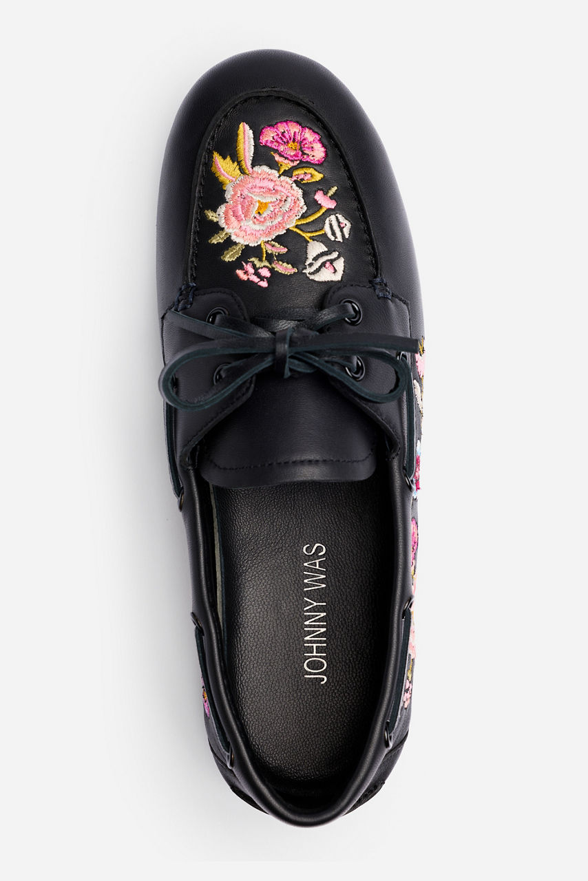 Crafted from 100% leather, the Anaya Embroidered Boat Shoes perfectly combine elevated style and casual comfort. Featuring a flat sole and leather lacing, these stylish shoes are finished with vibrant floral embroidered detailing for a splash of color. Pair with denim trousers and a coordinating floral top for a vacation-inspired look.