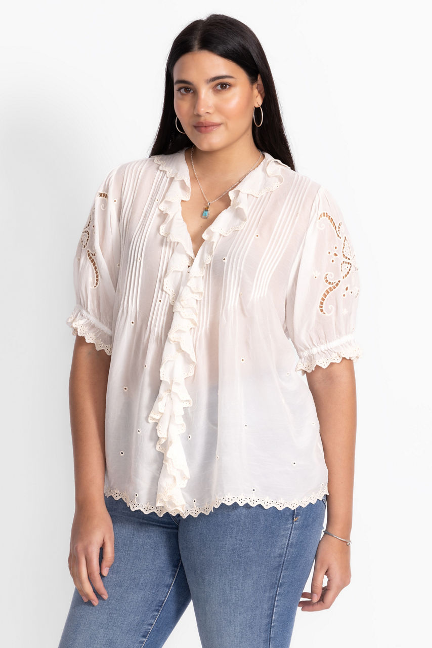 Crafted from a lightweight, flowing fabric, the Anette Ruffle Blouse adds a touch of whimsy to a traditional silhouette. Designed with a V-neckline embellished with a unique ruffle detail, this button-down blouse is cut with gently puffed sleeves and pintucking throughout and finished with a scalloped hemline. Pair with classic trousers and coordinating pumps for a polished work ensemble.