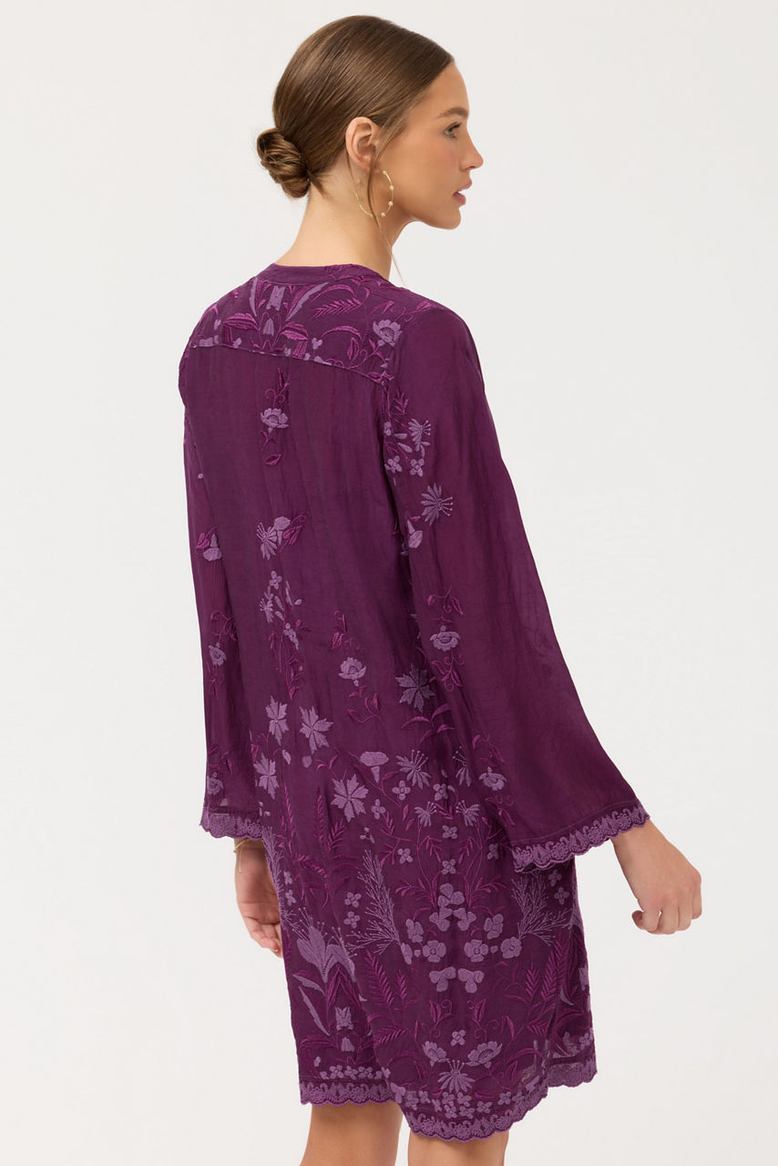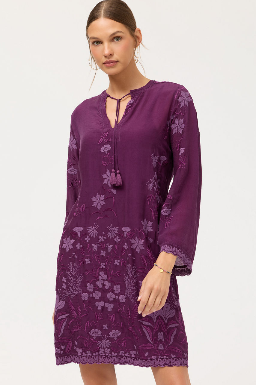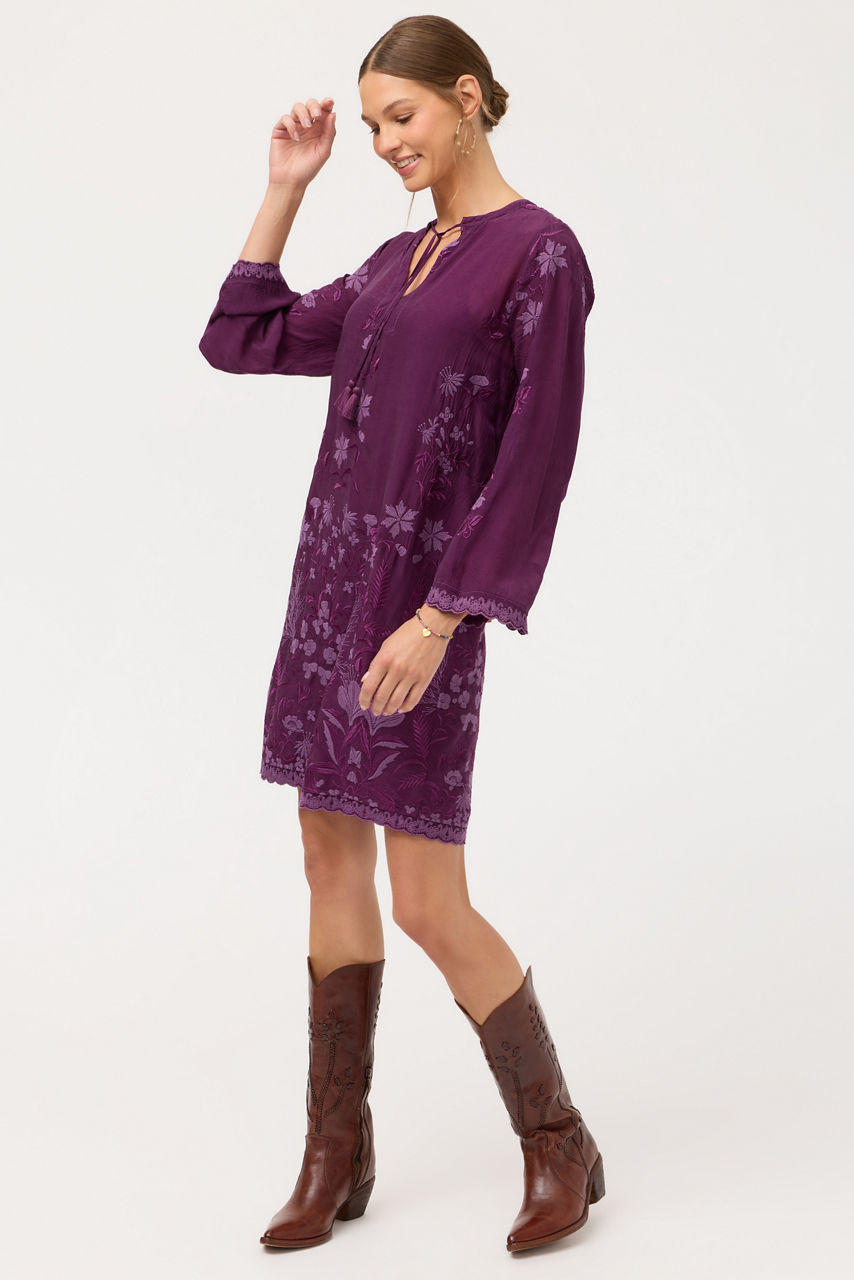 Crafted from a lightweight, flowing fabric, the Ankah Dress is brilliantly embellished with a subtle tone-on-tone floral motif. Designed with a split V-neckline with a front tie closure, this slip-lined dress is finished with side slits and scalloped lace detailing at the hemline and sleeves. Pair with espadrille wedges and delicate jewelry for a casual evening out.