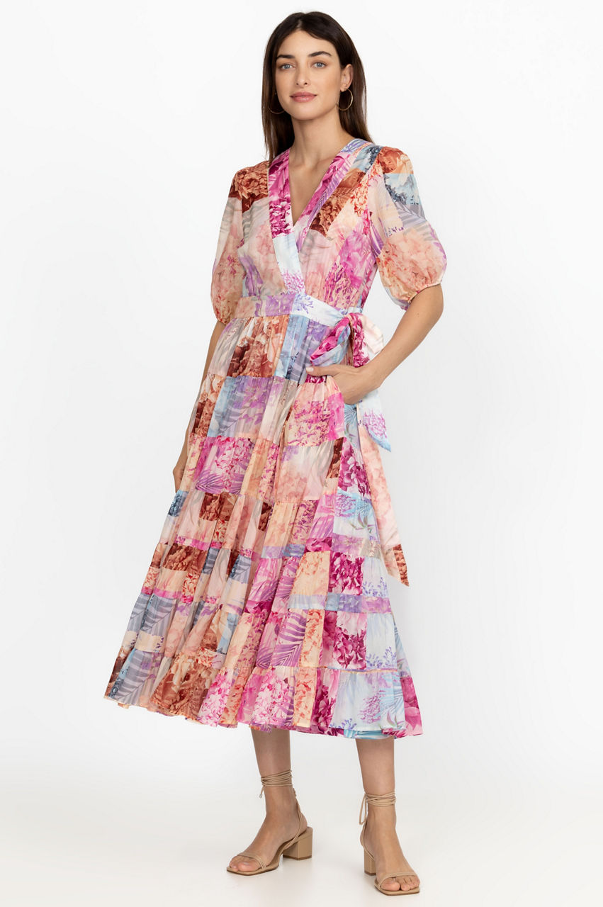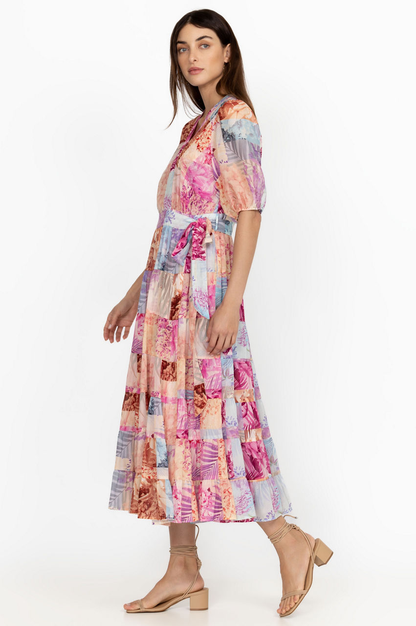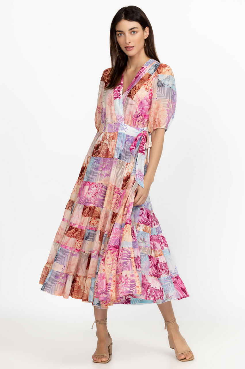 Graceful and feminine, the Annalise Midi Dress evokes feelings of romance and cheerfulness. Falling to a midi length, this dress is made from a comfortable cotton silk blend and features a V-neck, short sleeves, a tie closure at the side, a tiered ruffle skirt, and an enchanting, multicolored floral print. Pair with heels for a glamorous look.
