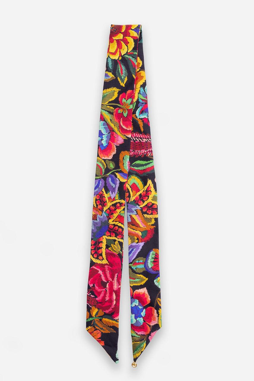 Crafted from 100% silk, the Antiqua Flower Silk Scarf is a versatile and vibrant accessory. Featuring a bold and colorful floral pattern on a rich black backdrop, this delicate scarf adds a bold splash of color to any look. Wear tied at the neck or at the handle of your favorite bag to enhance your ensemble.