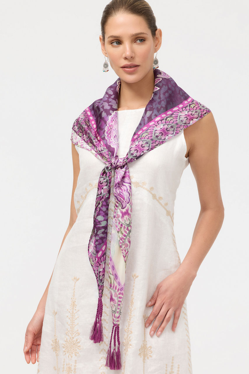 Crafted from 100% luxurious silk, the Anzio Silk Scarf is a rich and colorful accessory. Featuring a vibrant floral motif including a variety of blooms, this scarf is bordered with bold color enhanced with an eye-catching pattern and tassels at the corners. Wear over your hair tied at the neck for windy days to maintain a perfect coiffed style.
