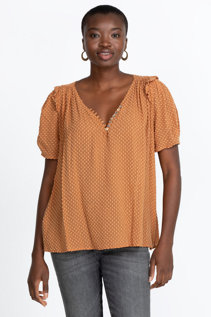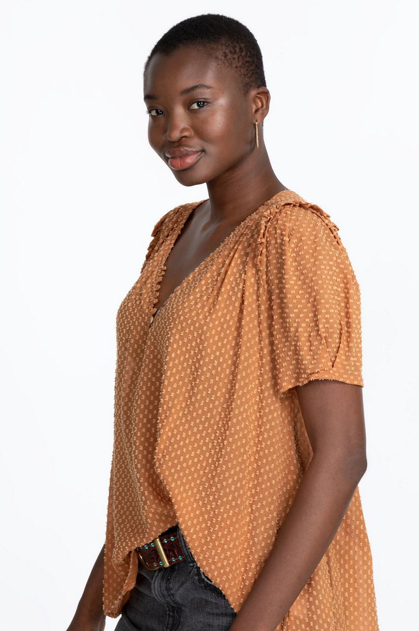 Imagine a top that frames your neck in loops and buttons. Imagine no more. Our Archer Flare Top brings your vision to life. Dainty frills frame your shoulders, leading down to loose, medium-length sleeves. This lovely, chocolate-brown top drifts gracefully away from your frame, falling in loose waves around your waist. Slim-fit cream pants and heels dress this top-up for a night on the town. Jeans and soft leather boots are ideal for daytime or a casual dinner.