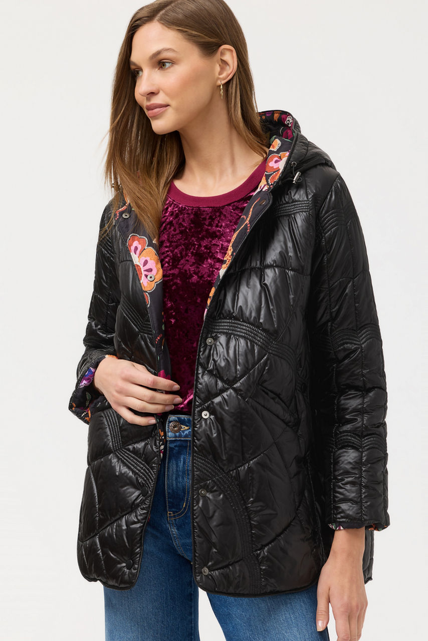 Thoughtfully designed with the cooler seasons in mind, the Arches Quilted Puffer Jacket is a generously plush outer layer. Crafted in a classic puffer style, this jacket features a snap front and a bungee hood closure and is finished with a vibrant floral lining for a splash of color. Layer over a classic black dress and pair with bold heels for a modern evening look.