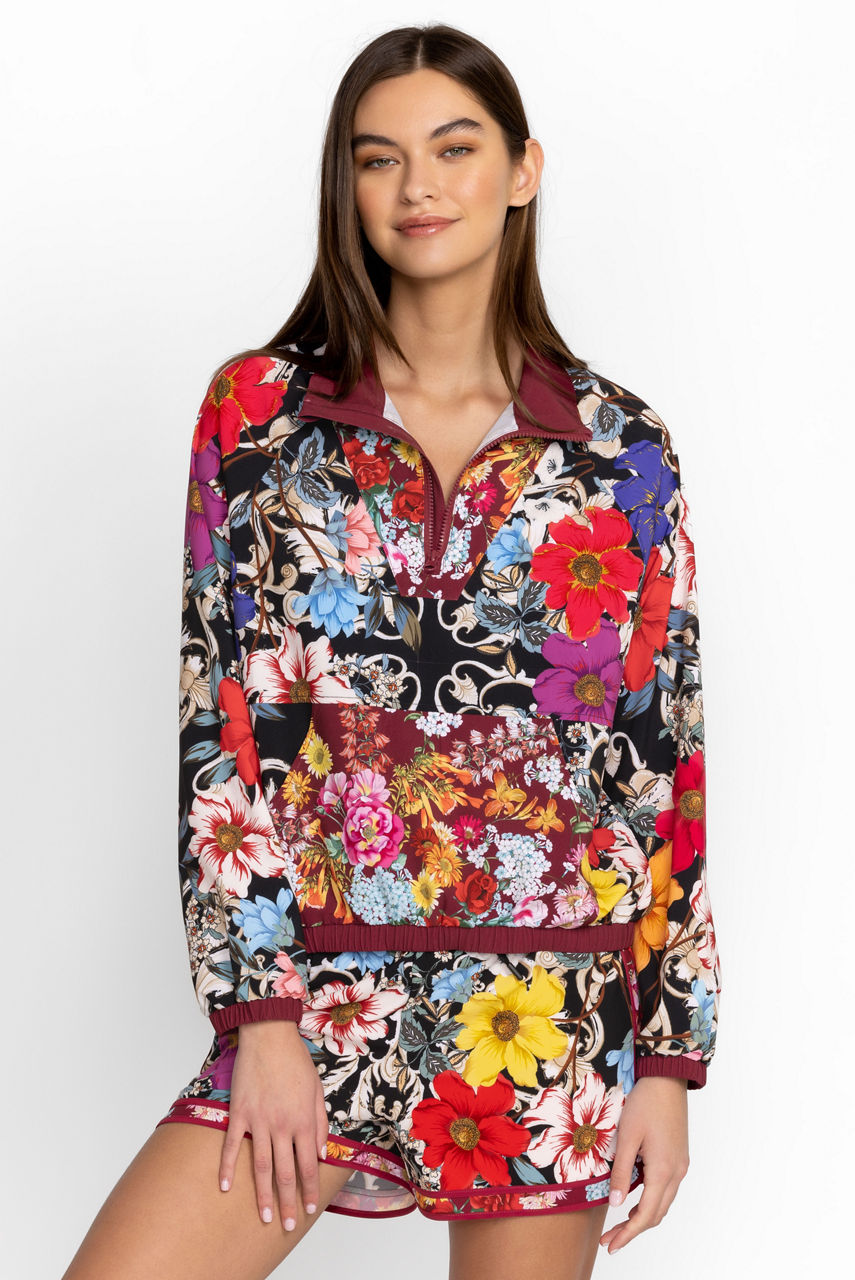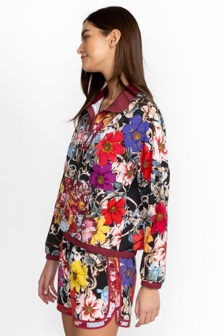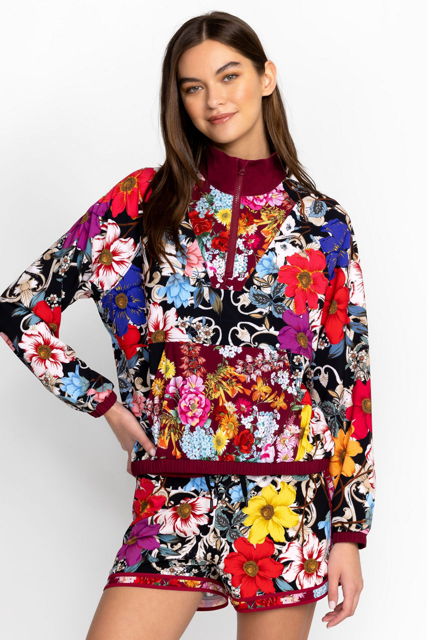 A statement style, the Archibal Mock Neck Pullover Jacket reworks an iconic 90's sports style with unexpected, elegant details. This pullover jacket is made from a recycled lightweight material and features a mock neck with a zipper, long sleeves, a kangaroo pocket, rich flowers, and elastic bungees at the hem to define the silhouette. Wear with everything from shorts to leggings for an eye-catching workout look.