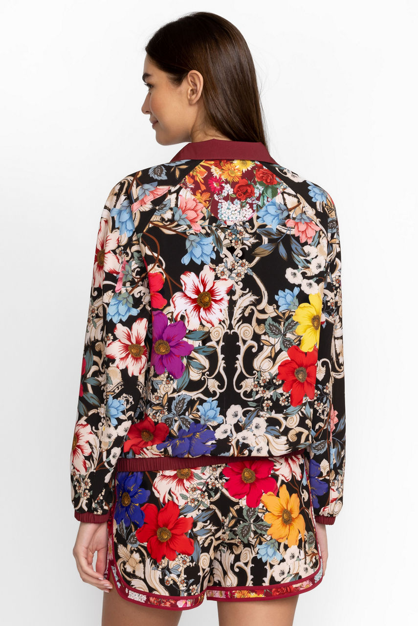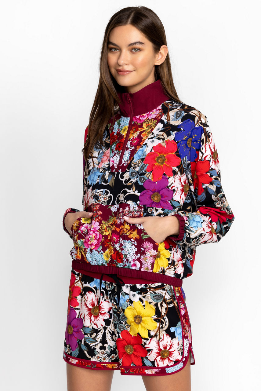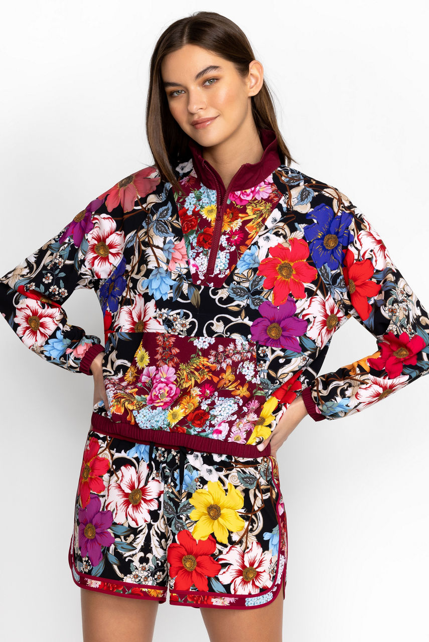 A statement style, the Archibal Mock Neck Pullover Jacket reworks an iconic 90's sports style with unexpected, elegant details. This pullover jacket is made from a recycled lightweight material and features a mock neck with a zipper, long sleeves, a kangaroo pocket, rich flowers, and elastic bungees at the hem to define the silhouette. Wear with everything from shorts to leggings for an eye-catching workout look.