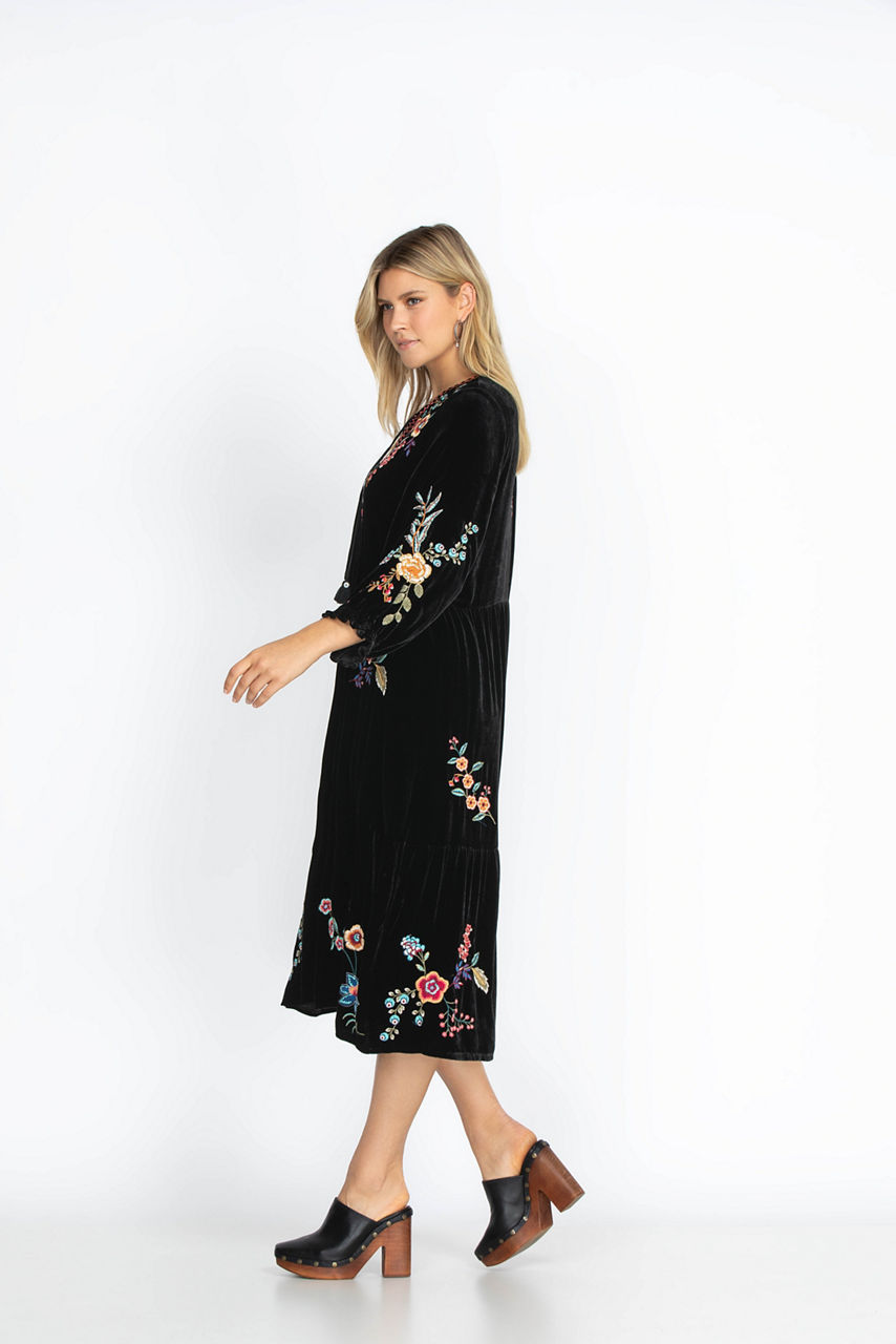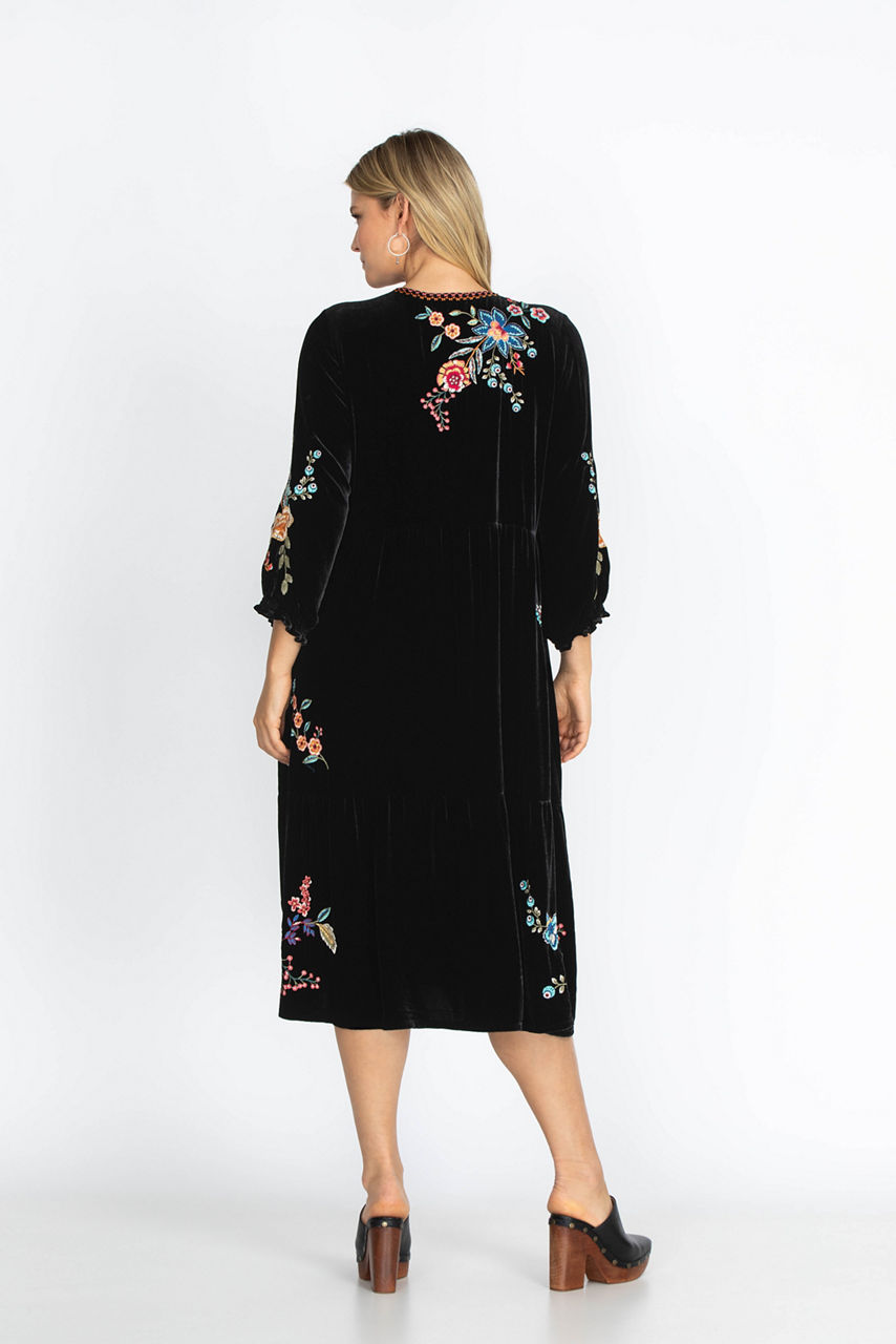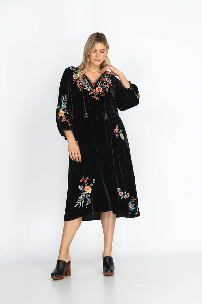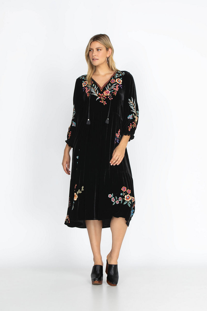 The gorgeous Ardell Velvet Boho Midi Dress features fun elements to make any outfit exciting. Tassels, a tiered skirt, shirred sleeve cuffs, and beautiful embroidery help create an effortlessly stunning look. The flowy fit allows you to create fun silhouettes with jackets and belts. Wear this dress with booties and gold or silver jewelry for special occasions.