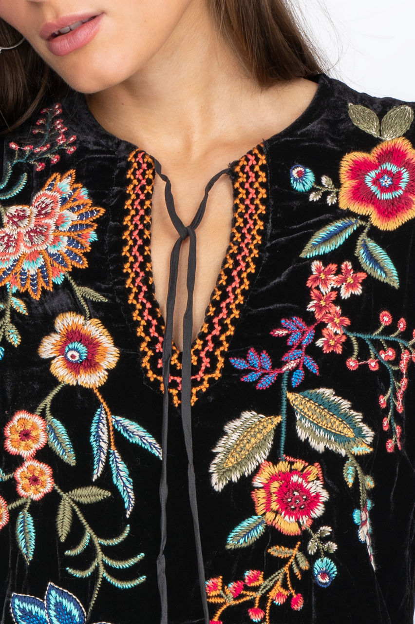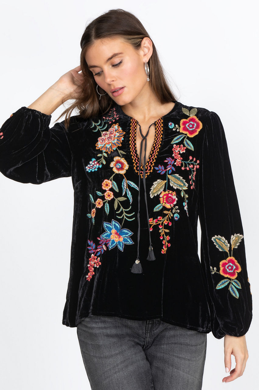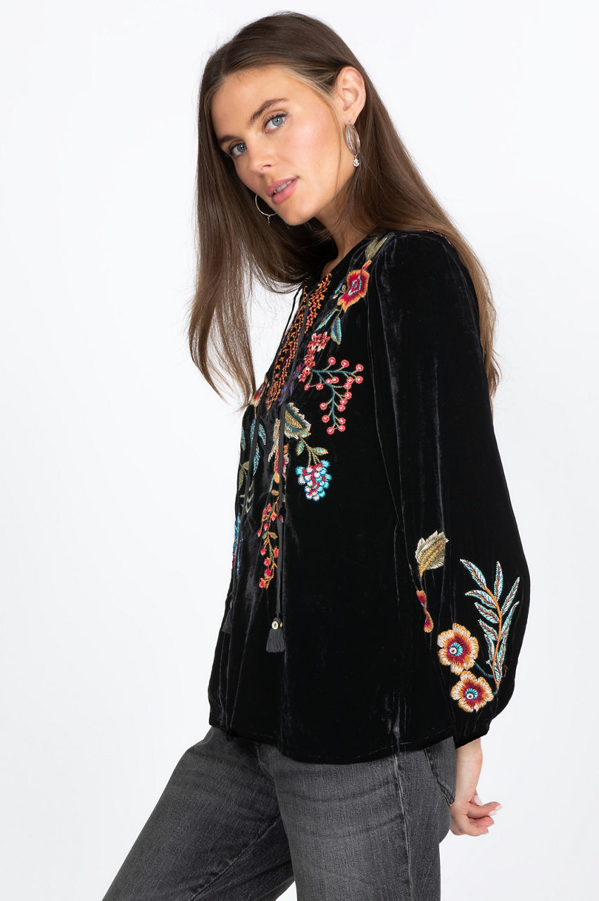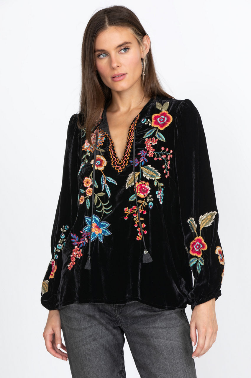 The Ardell Velvet Relaxed Blouse features beautiful embroidery and tassels. A flowy fit is perfect for wearing the blouse from running errands to an evening out. Pair this blouse with skinny jeans and boots for the perfect fall or winter outfit. It also works well with a leather jacket for chillier days.
