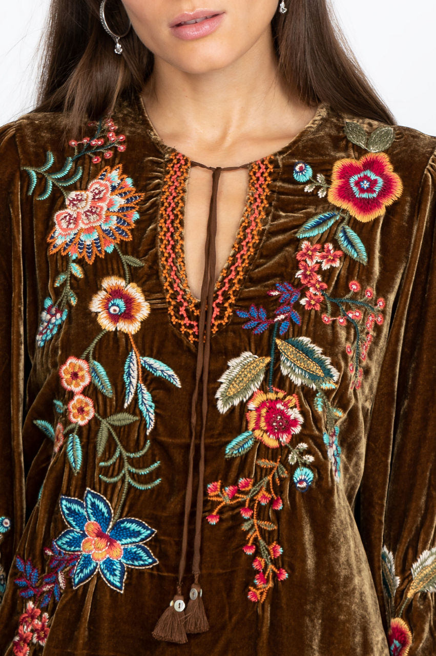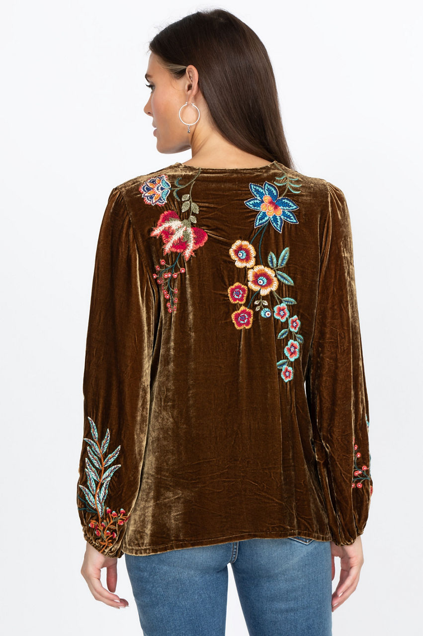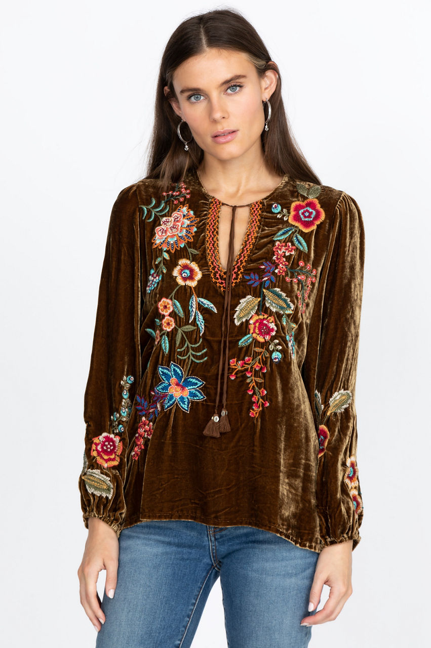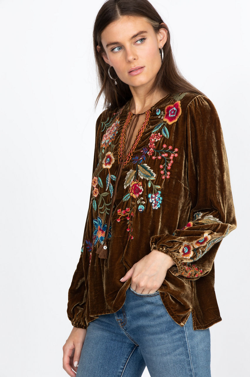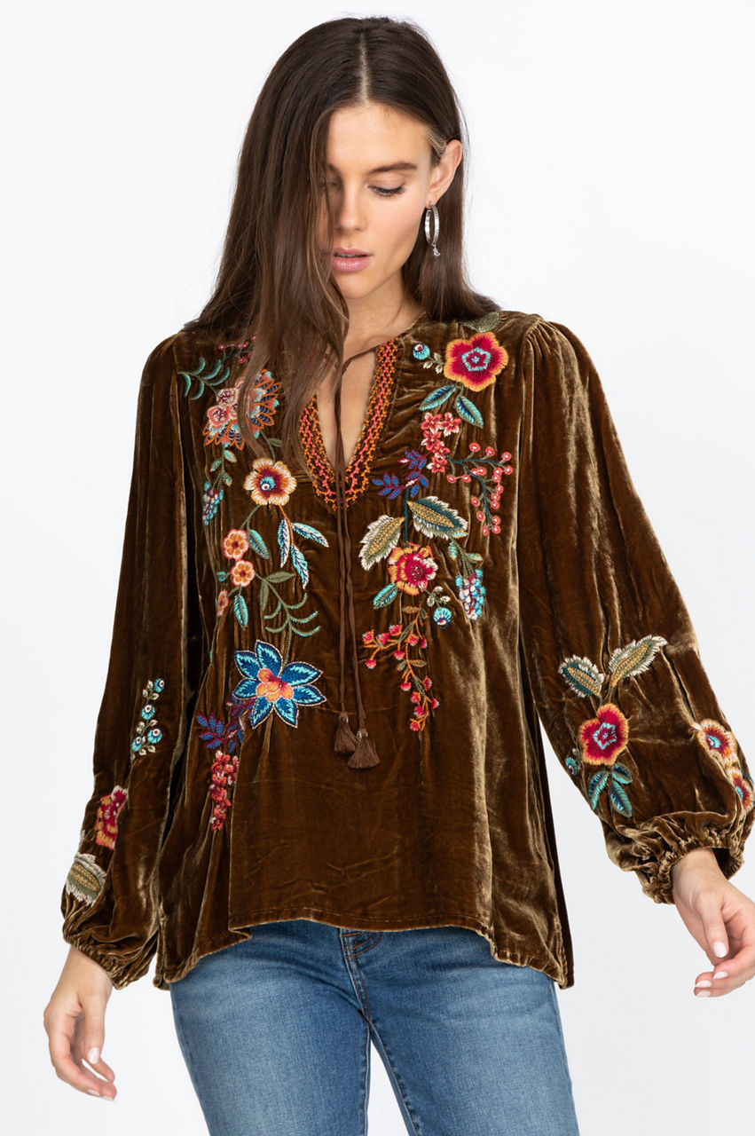 The Ardell Velvet Relaxed Blouse features beautiful embroidery and tassels. A flowy fit is perfect for wearing the blouse from running errands to an evening out. Pair this blouse with skinny jeans and boots for the perfect fall or winter outfit. It also works well with a leather jacket for chillier days.