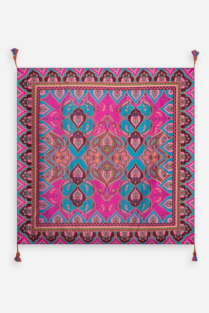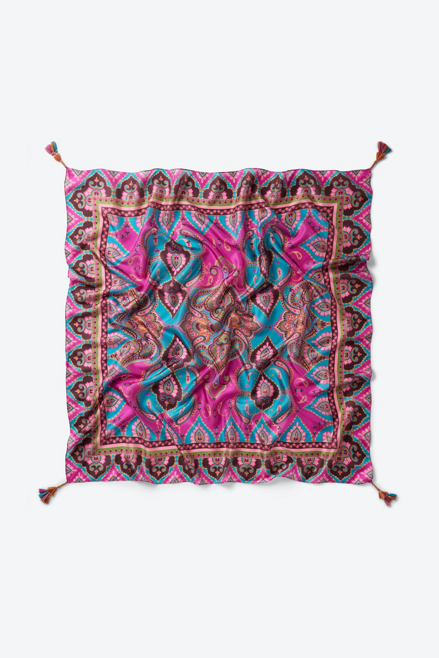 Crafted from luxurious, 100% silk, the Argus Silk Scarf is adorned with an ornate pattern with turquoise and fuchsia saturated hues. Thoughtfully designed to enhance any look, this square scarf is finished with tassels at each corner for added texture. Tie at the neck or at the handle of your favorite bag for a pop of color.