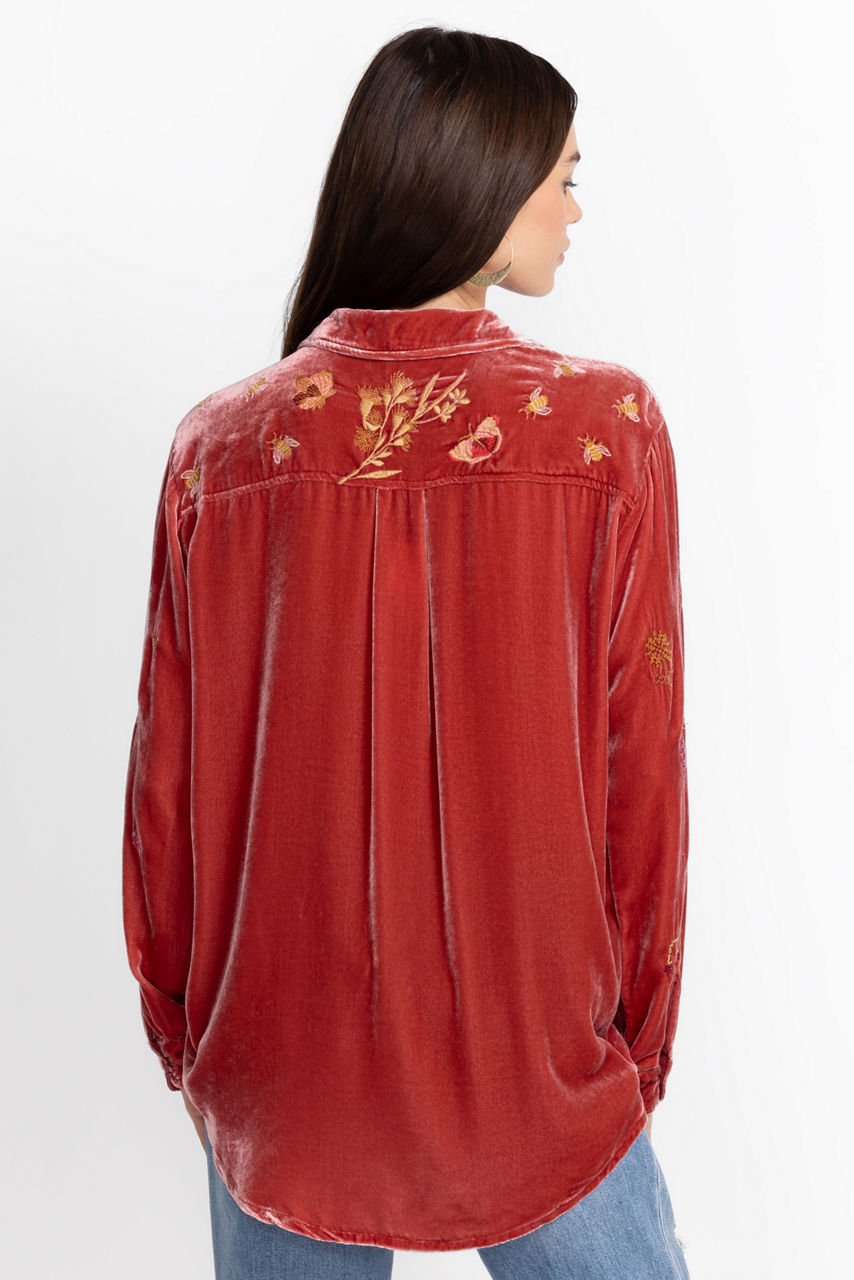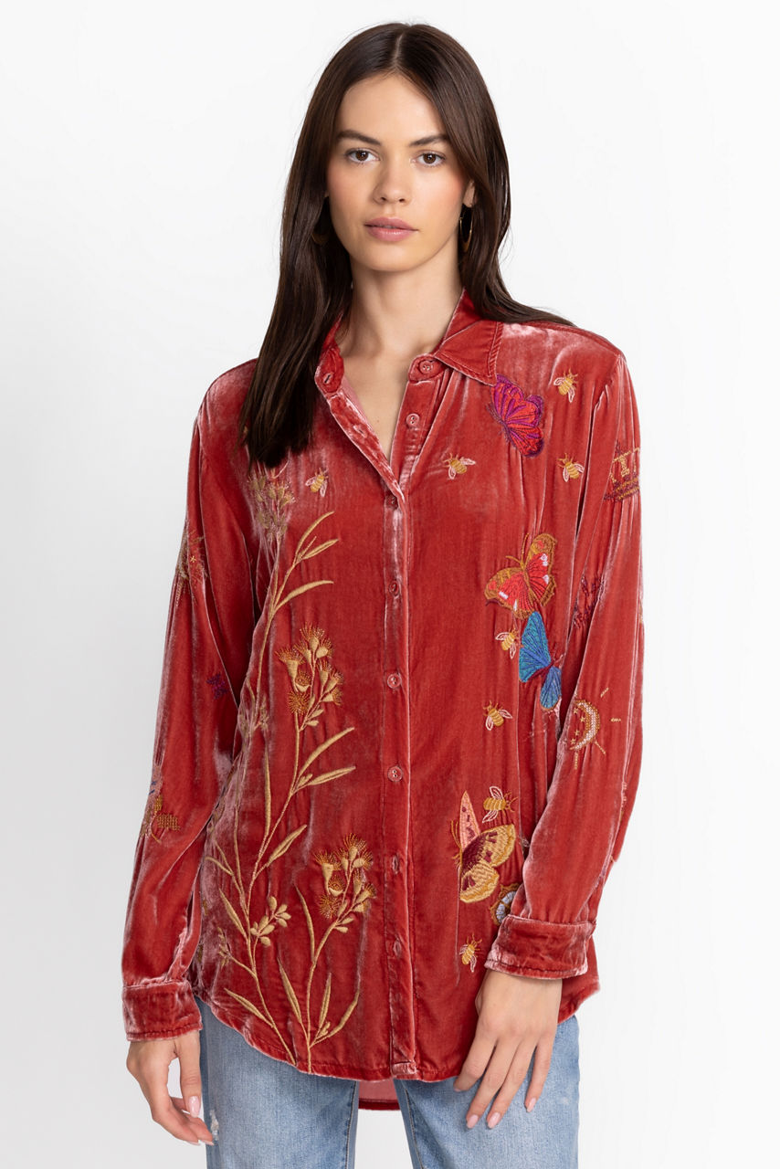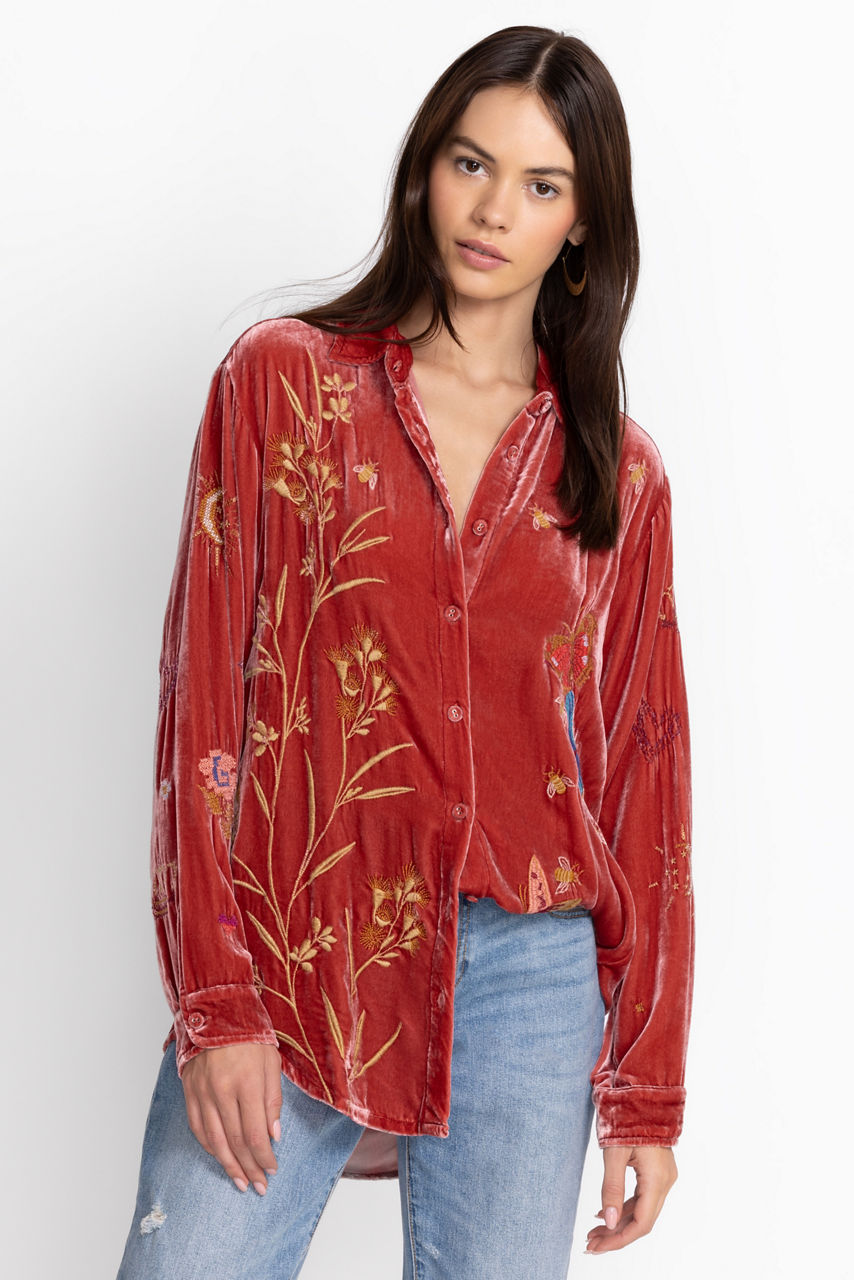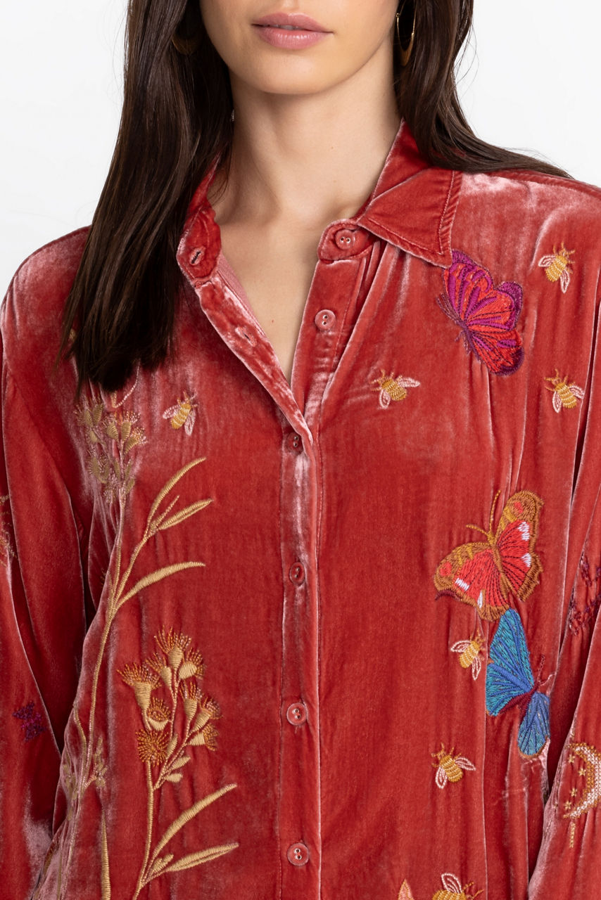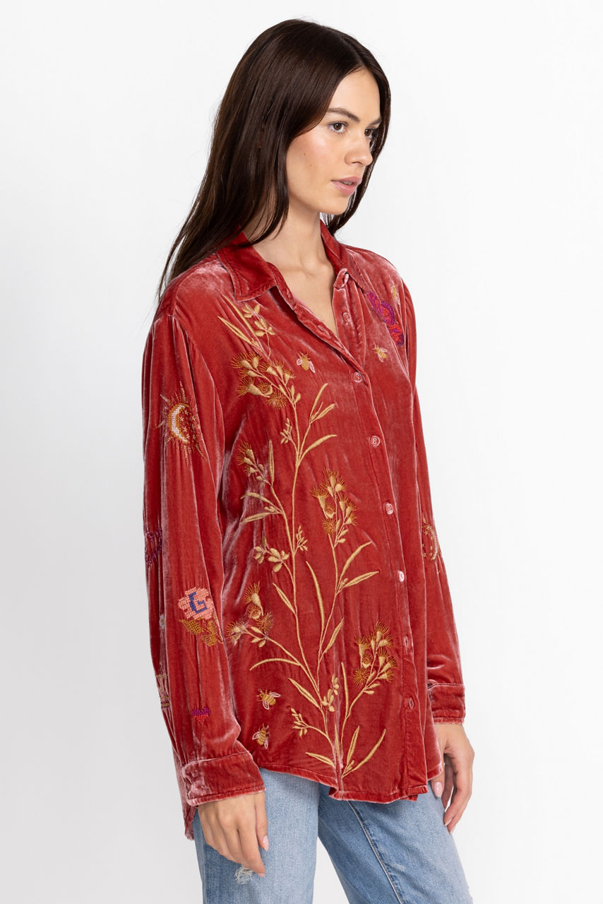 Tactile and bright, the Aria Oversized Shirt adds a chic spin to a functional cut. Adopting an oversized silhouette, this shirt is made from plush silk blend velvet and boasts a collar, a front button closure, long sleeves, and a wistful floral placement embroidery in contrasting shades. Pair this shirt with jeans and hoop earrings for a modern daytime ensemble.
