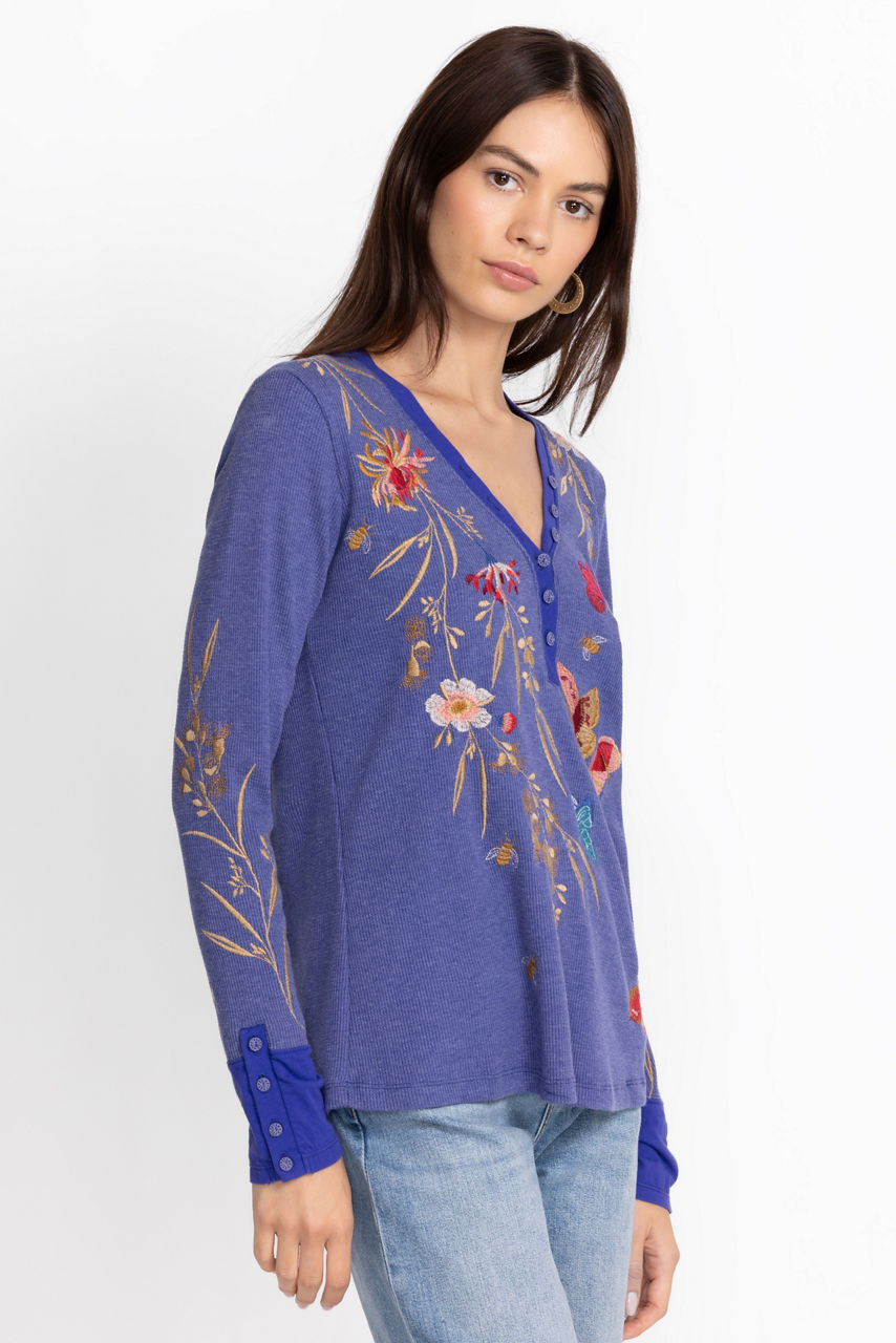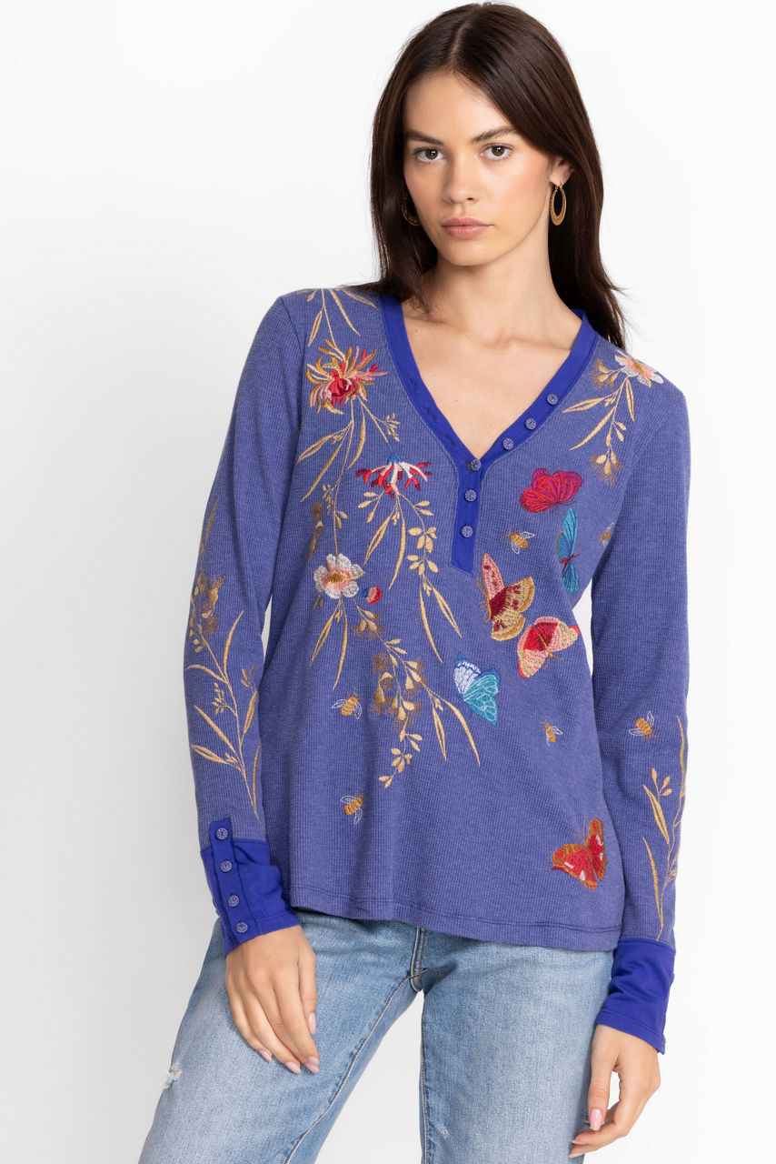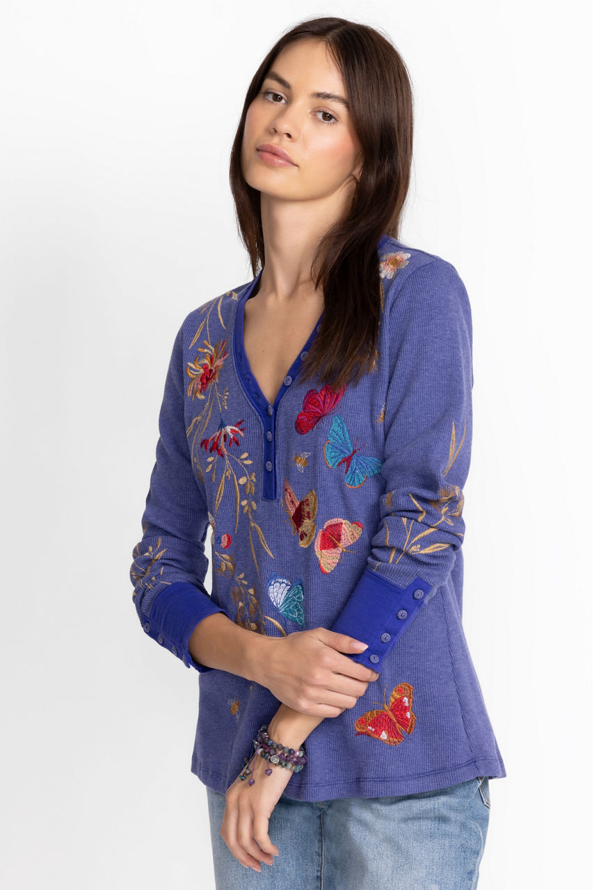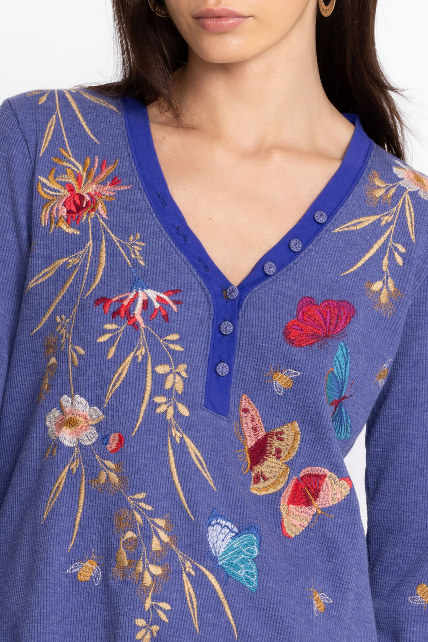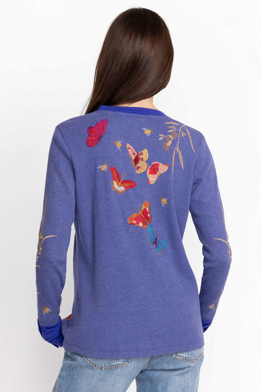 The Aria V-Neck Thermal brings new meaning to a timeless silhouette through whimsical motifs. An easy-to-style piece, this thermal is made from an insulating material and features a V-neck, a front button closure, long sleeves, and an eye-catching placement embroidery comprising a floral and butterfly design. Wear this thermal with jeans during the day or opt for joggers at home.