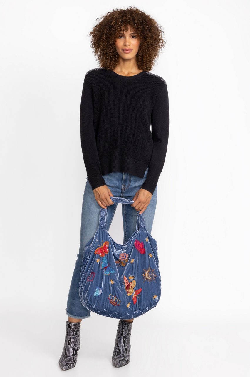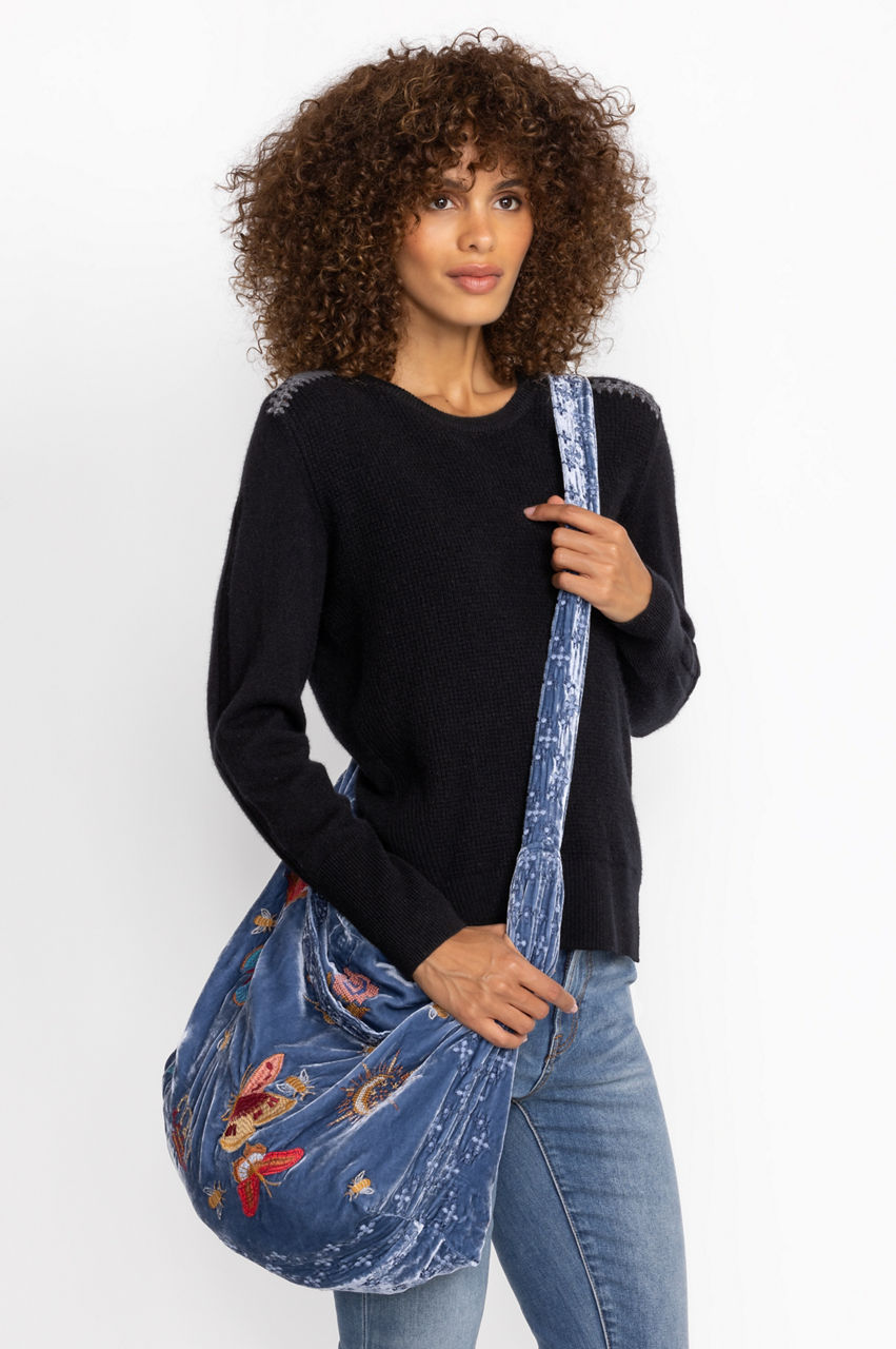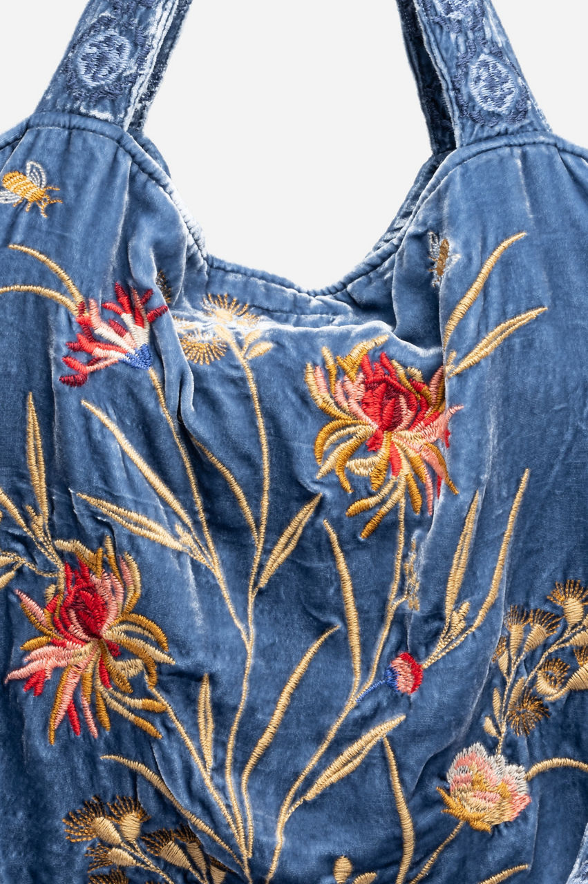 Experimenting with color and texture, the Aria Velvet Tote revamps a simple silhouette into a new seasonal must-have. A functional staple for daily pursuits, this tote is made from soft silk blend velvet and features two top handles, a shoulder strap, an inside pocket, and an intricate placement embroidery made up of fresh flowers. Style this tote with everything from denim to neutral linens.